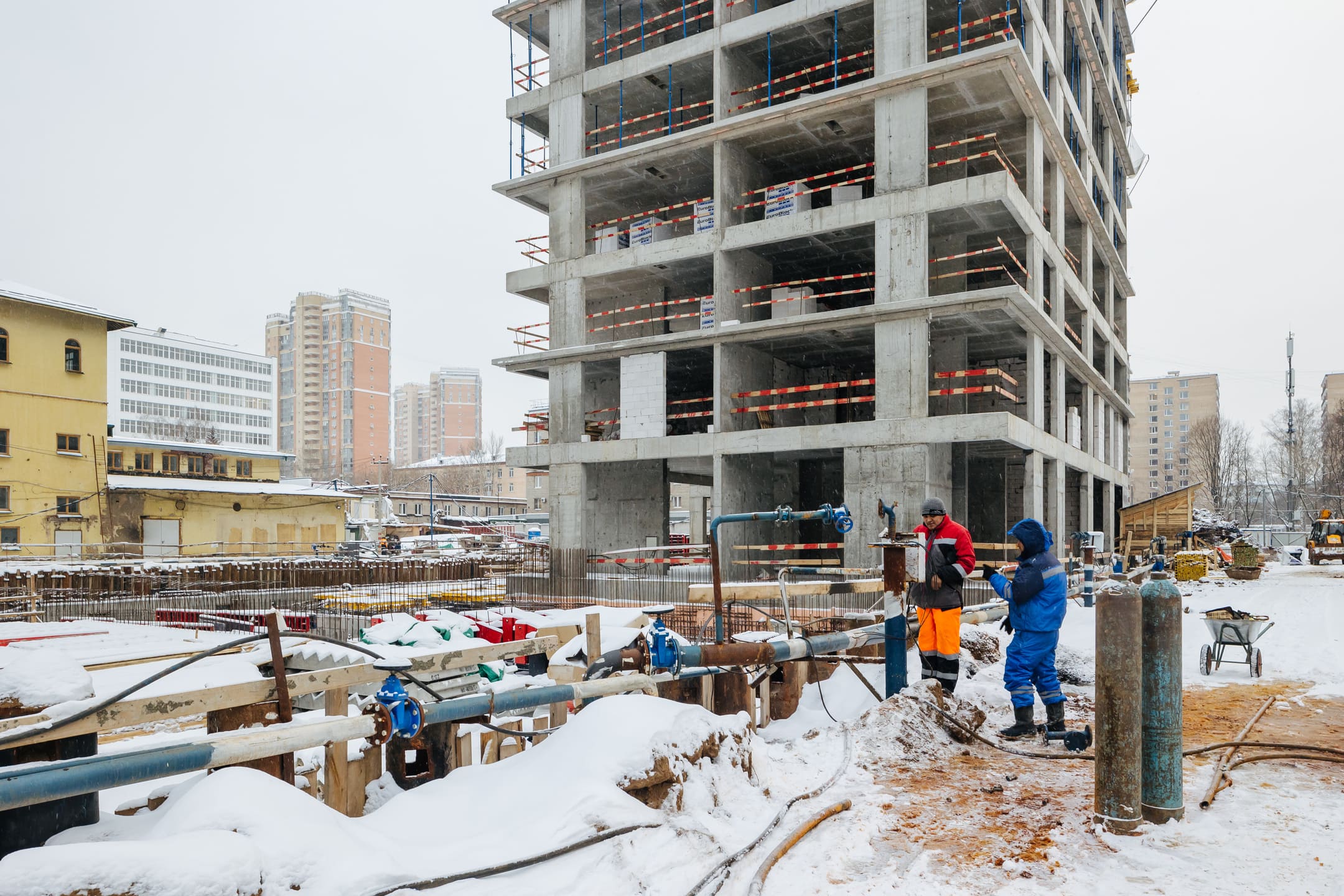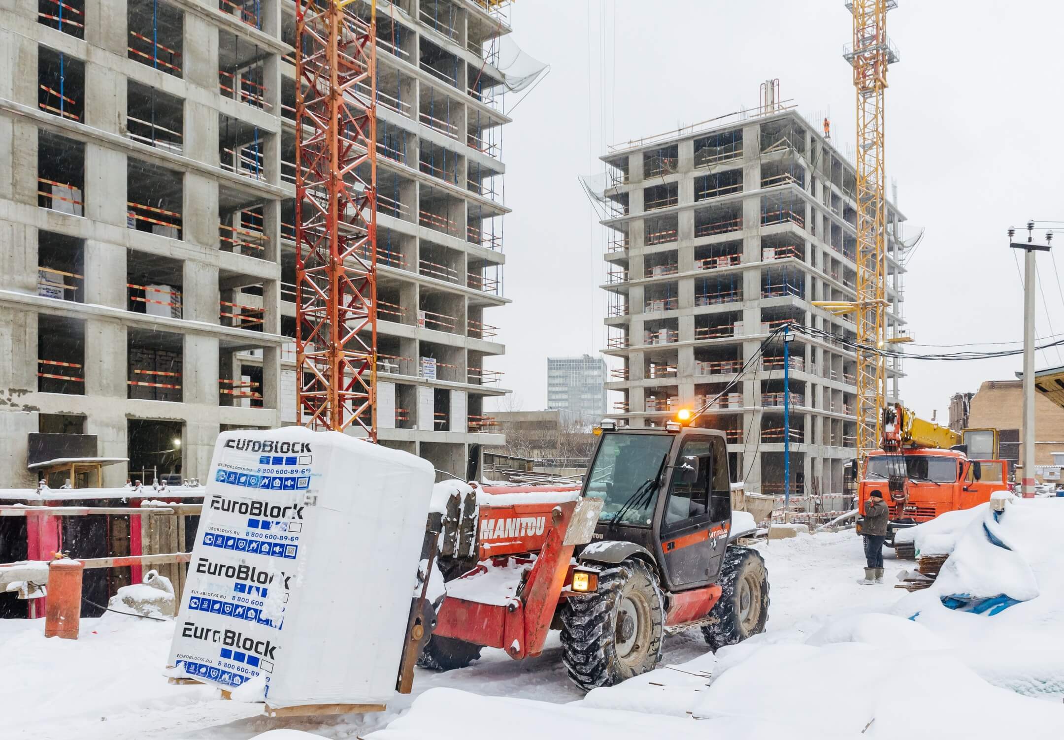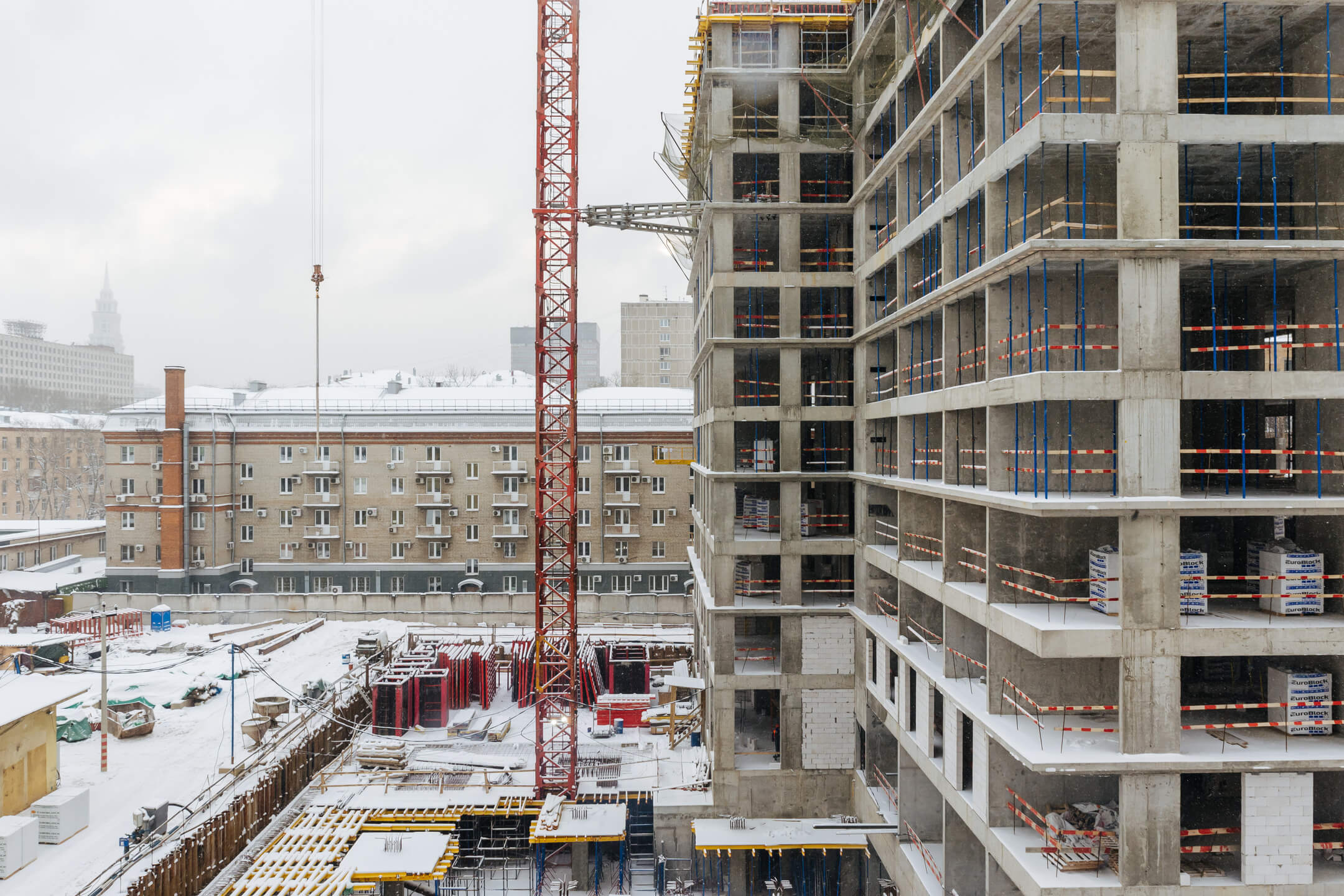 Этап 1.1 (паркинг): производятся работы по армированию и бетонированию стен и покрытия паркинга, гидроизоляция наружных стен и кровли стилобата, устройство пристенного дренажа, отсыпка пазух котлована, кладка стен и перегородок подземного этажа;