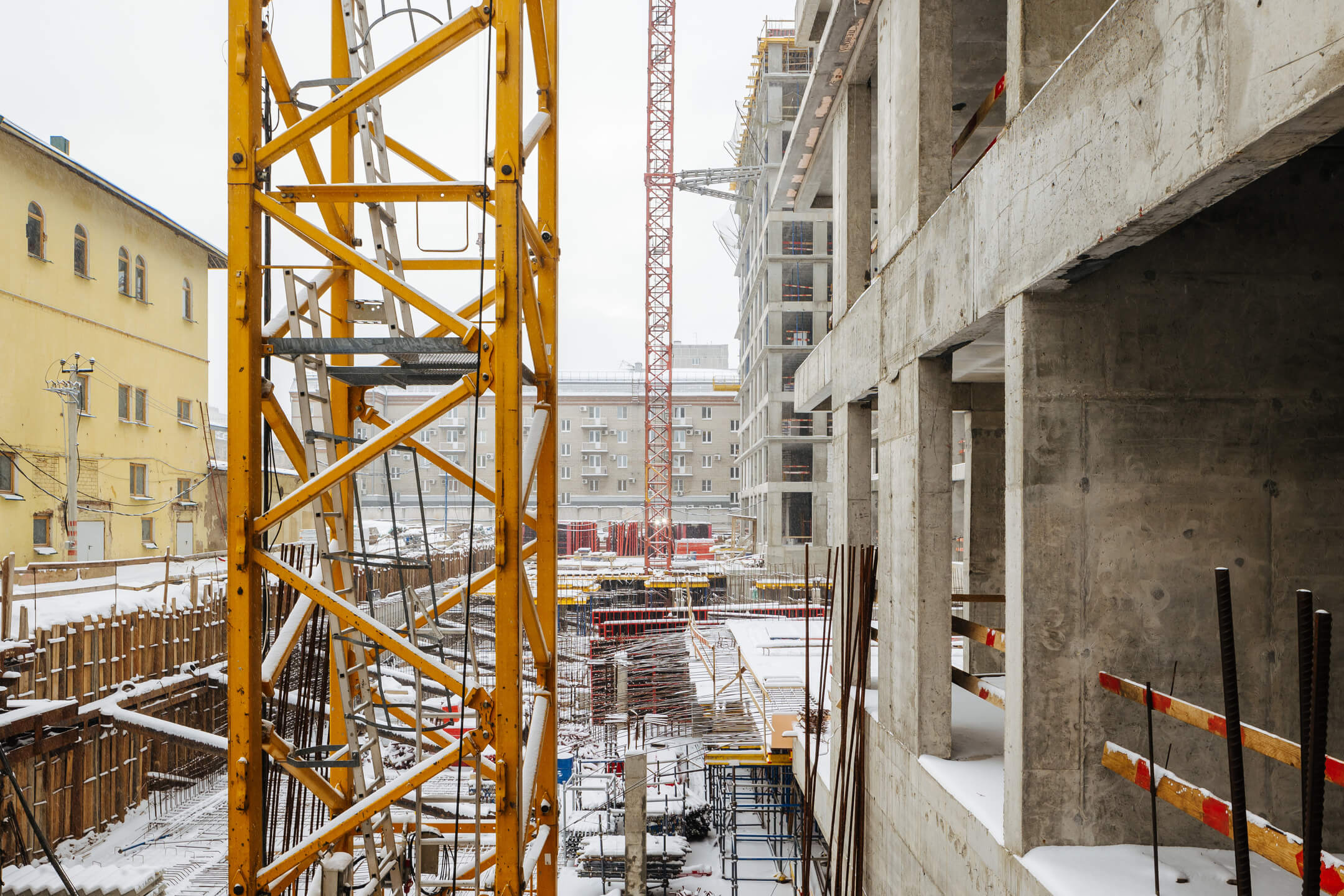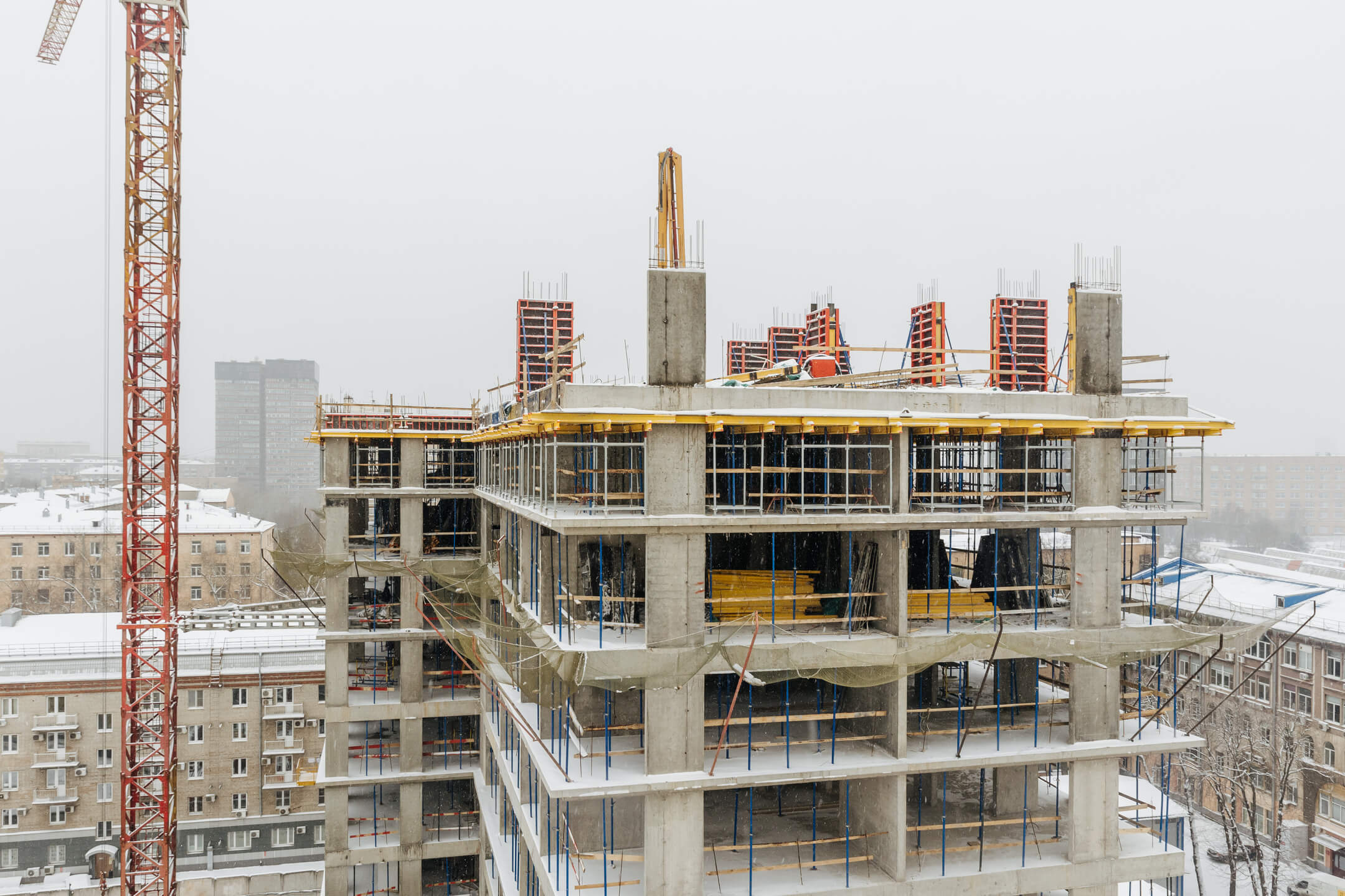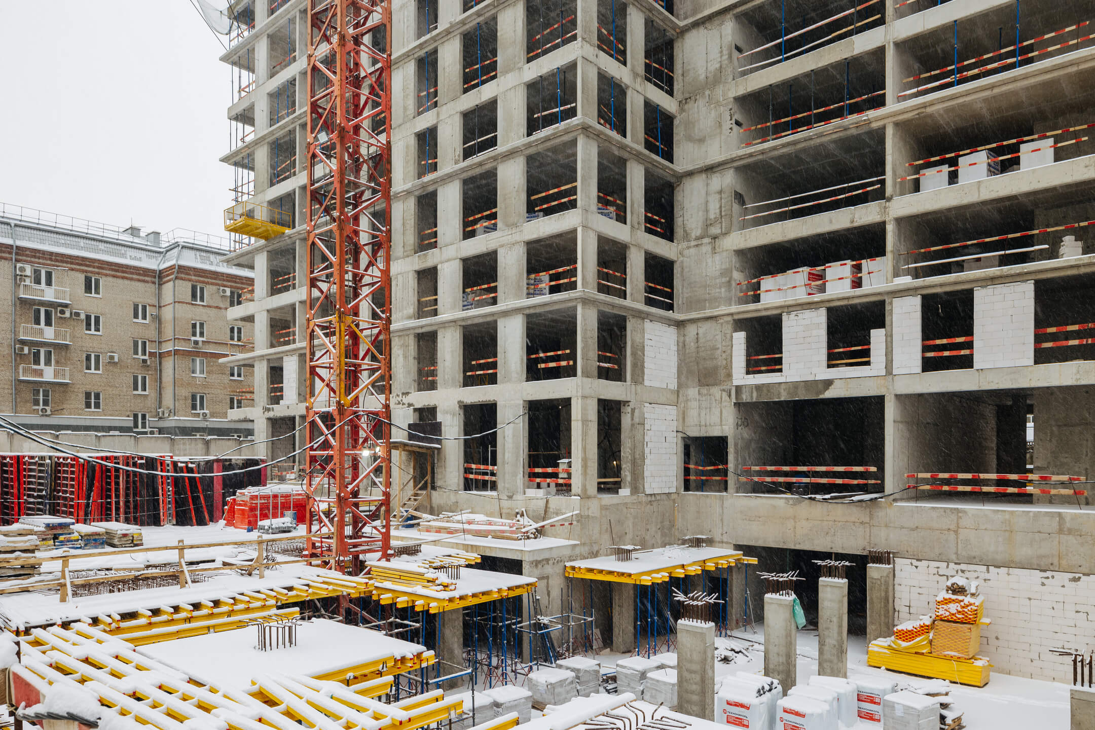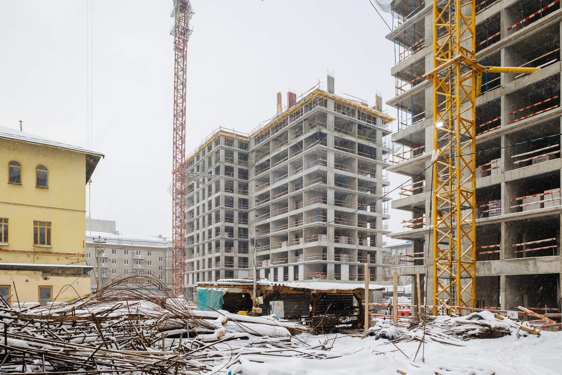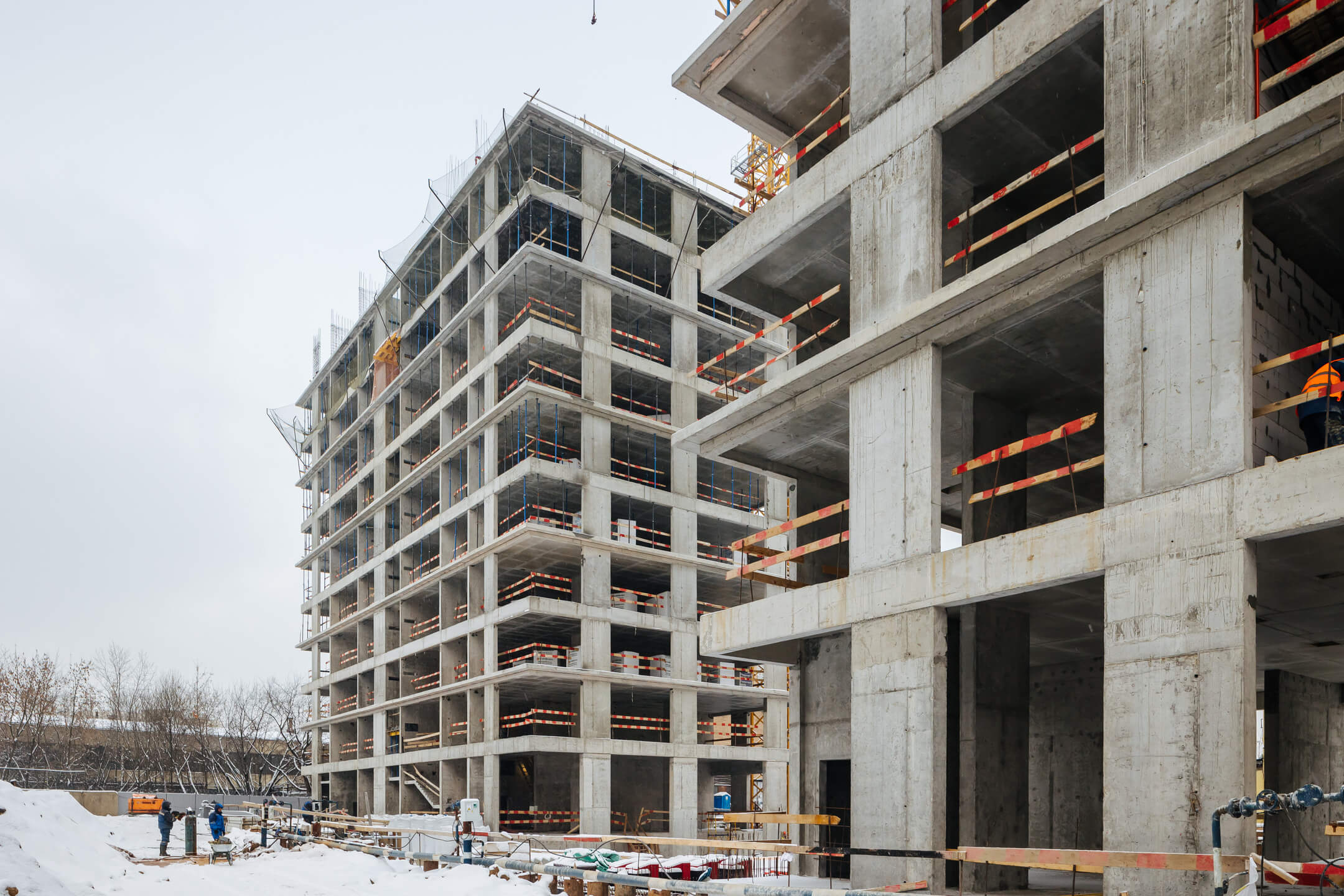 Этап 1.1 (корпус 1 и 2): ведутся работы по армированию и бетонированию стен и плит перекрытия 11 и 12 этажей, в также кладочные работы на 3, 4, 5 этажах;