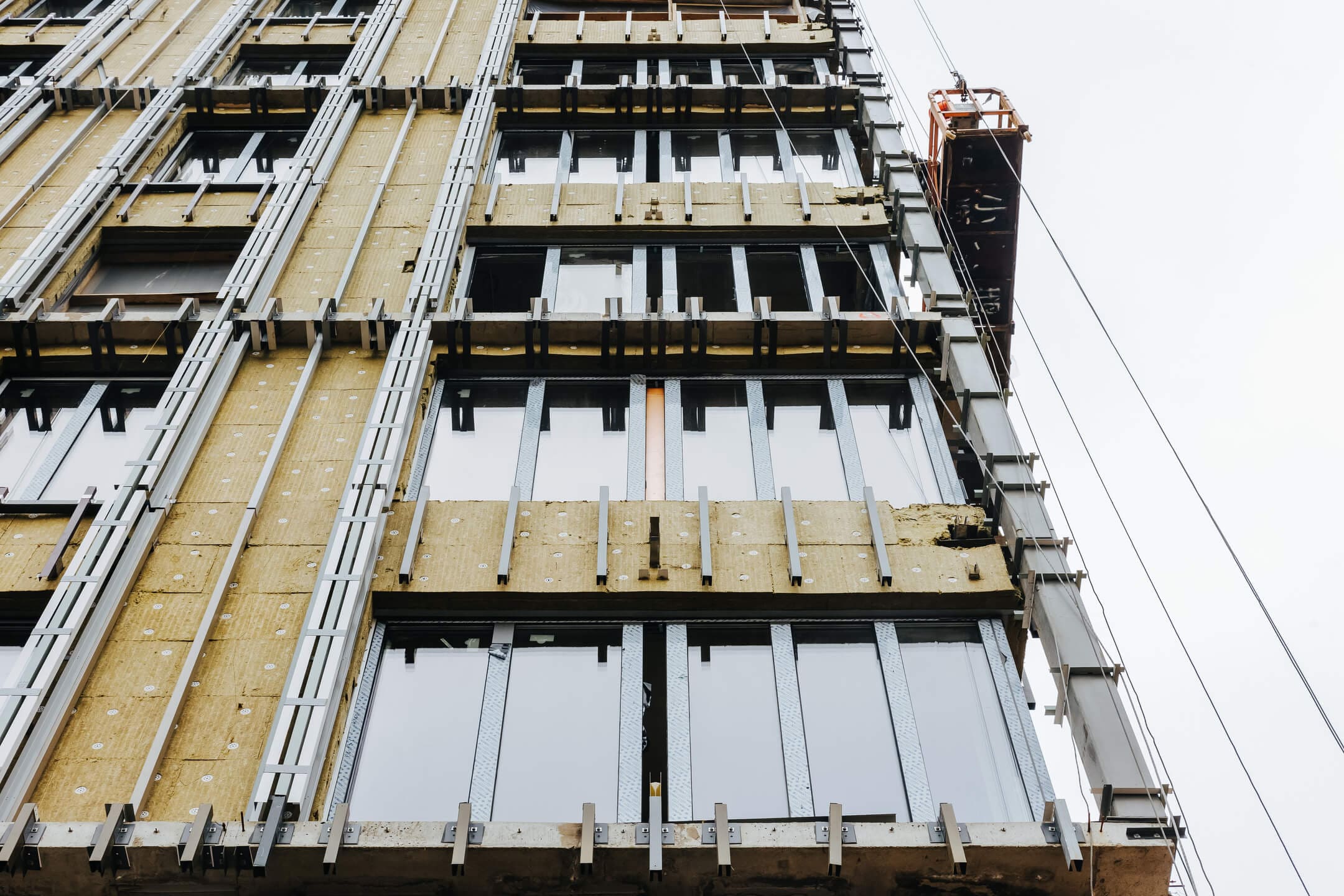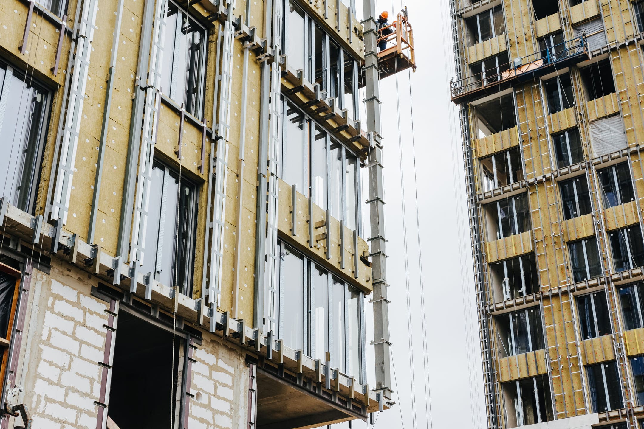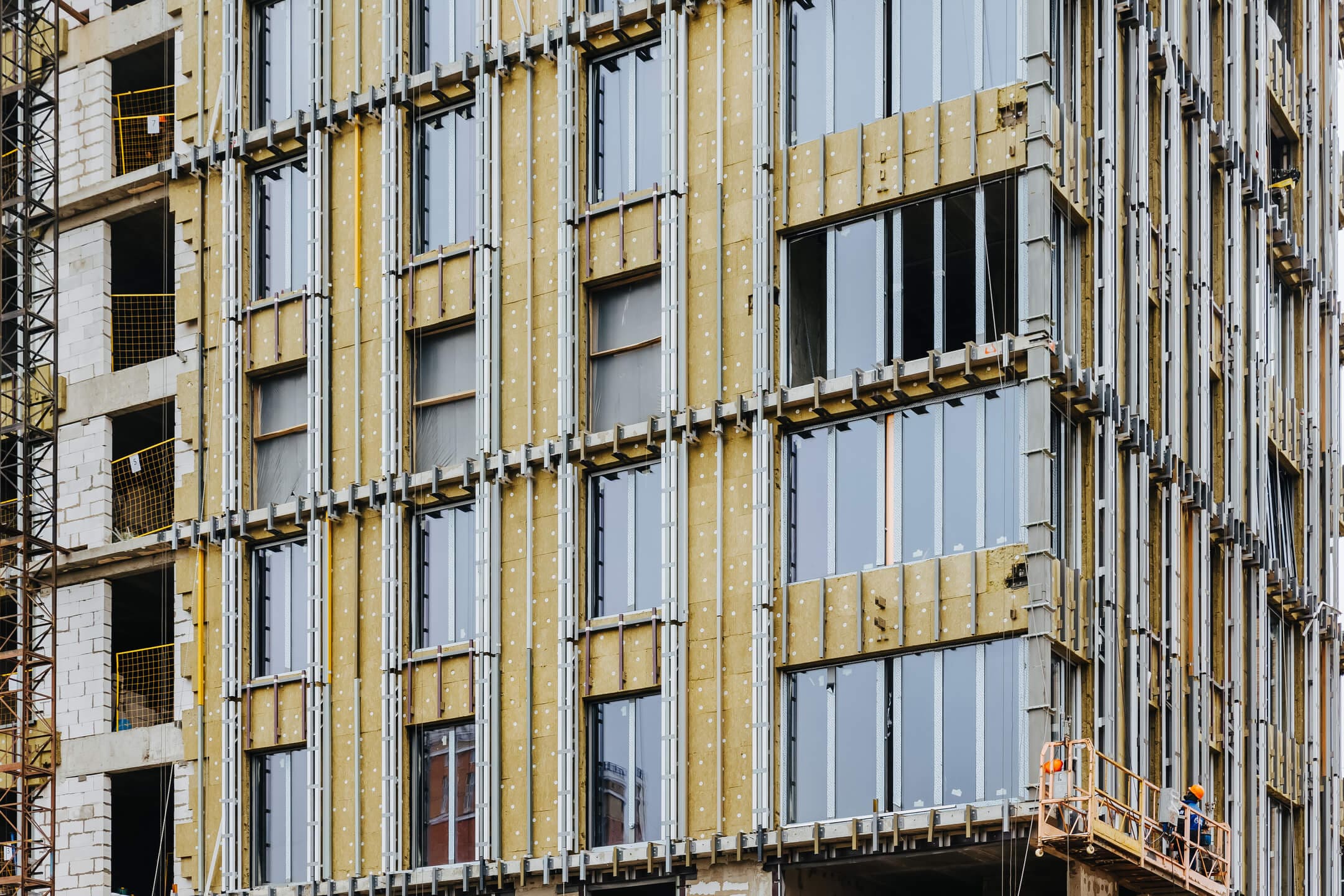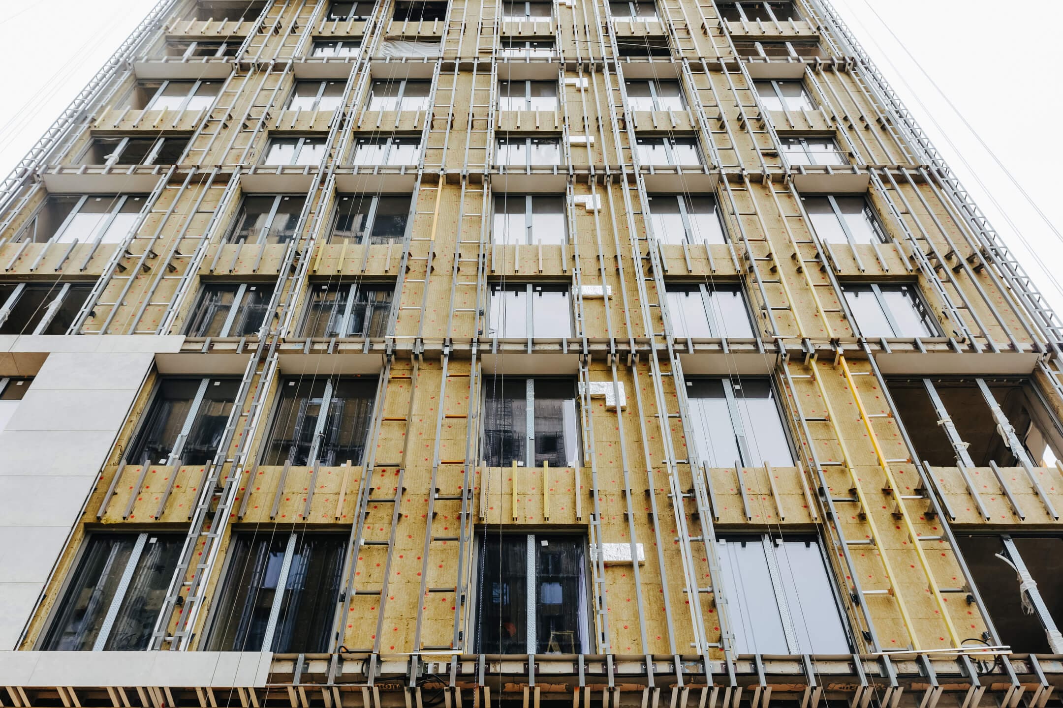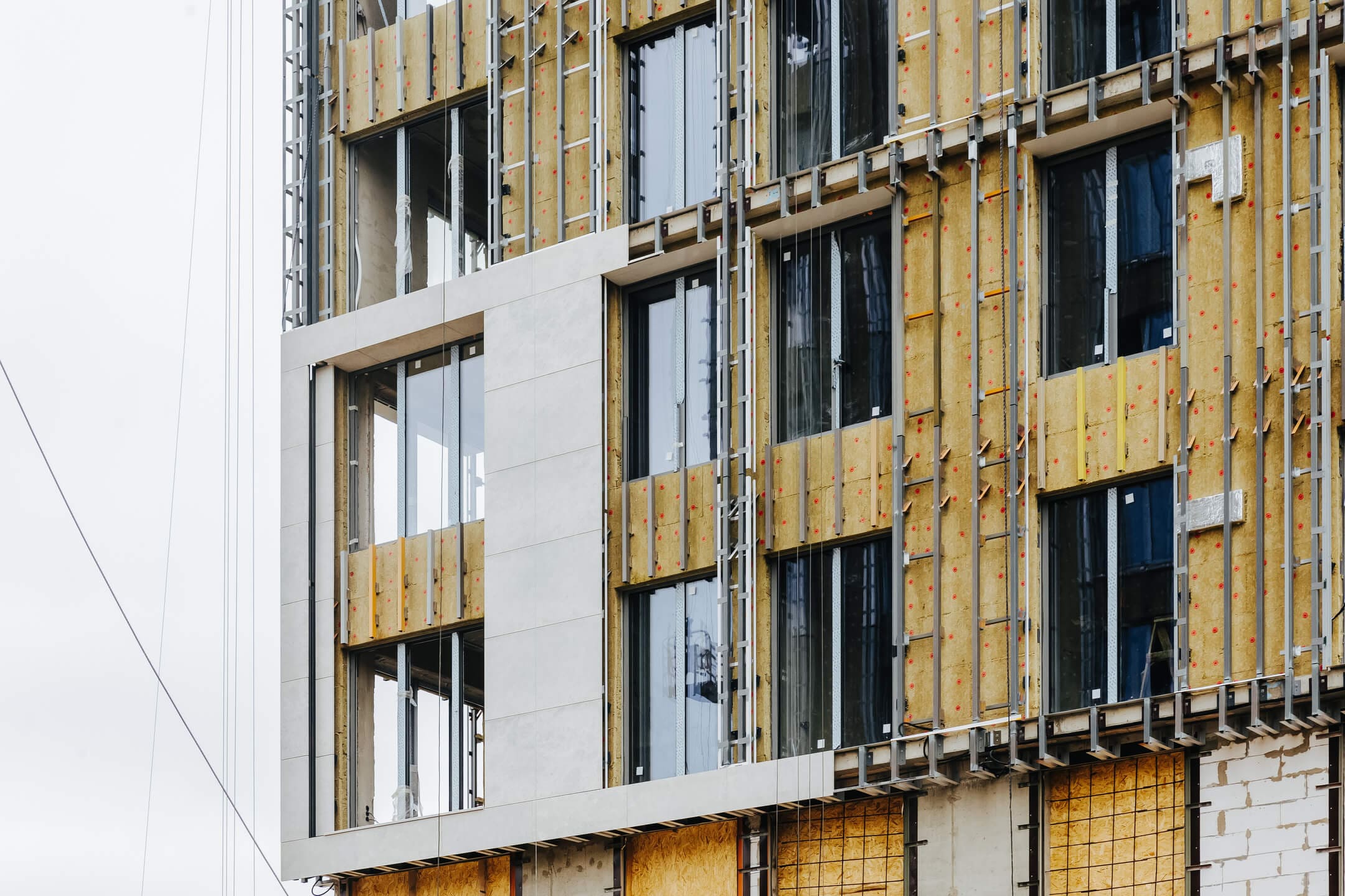- Фасад. Монтаж противопожарной отсечки. Монтаж минераловатного утеплителя. Монтаж подсистемы. Монтаж облицовки из натурального камня. Монтаж окон типовых этажей.