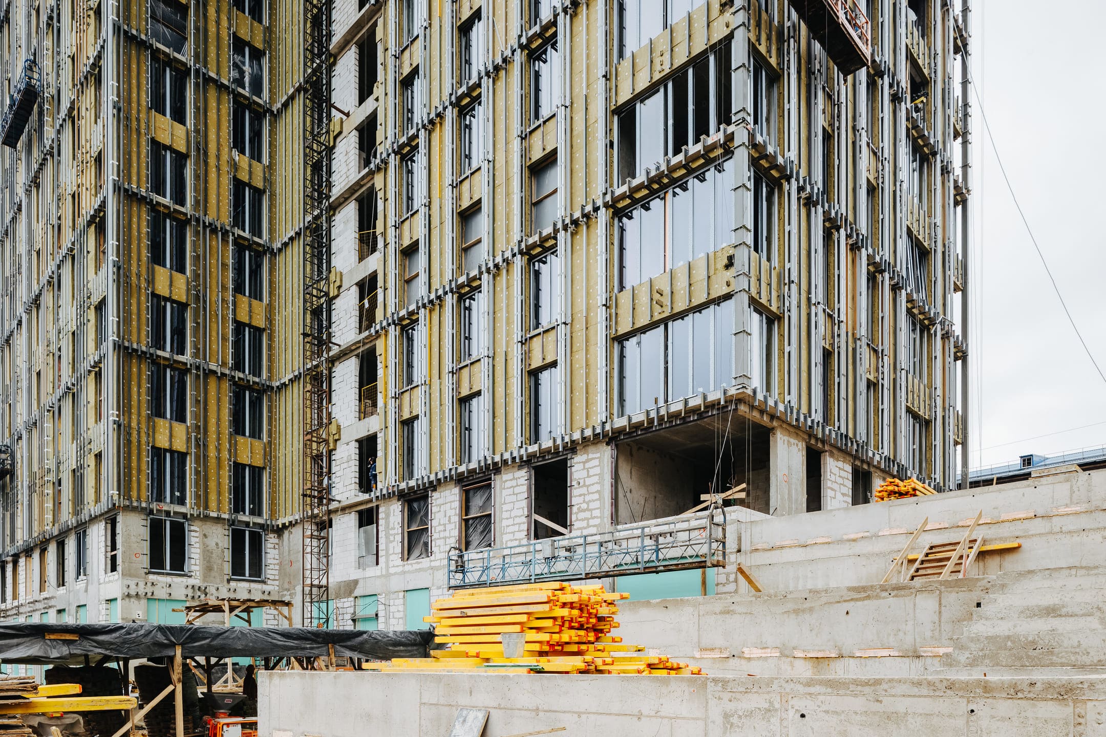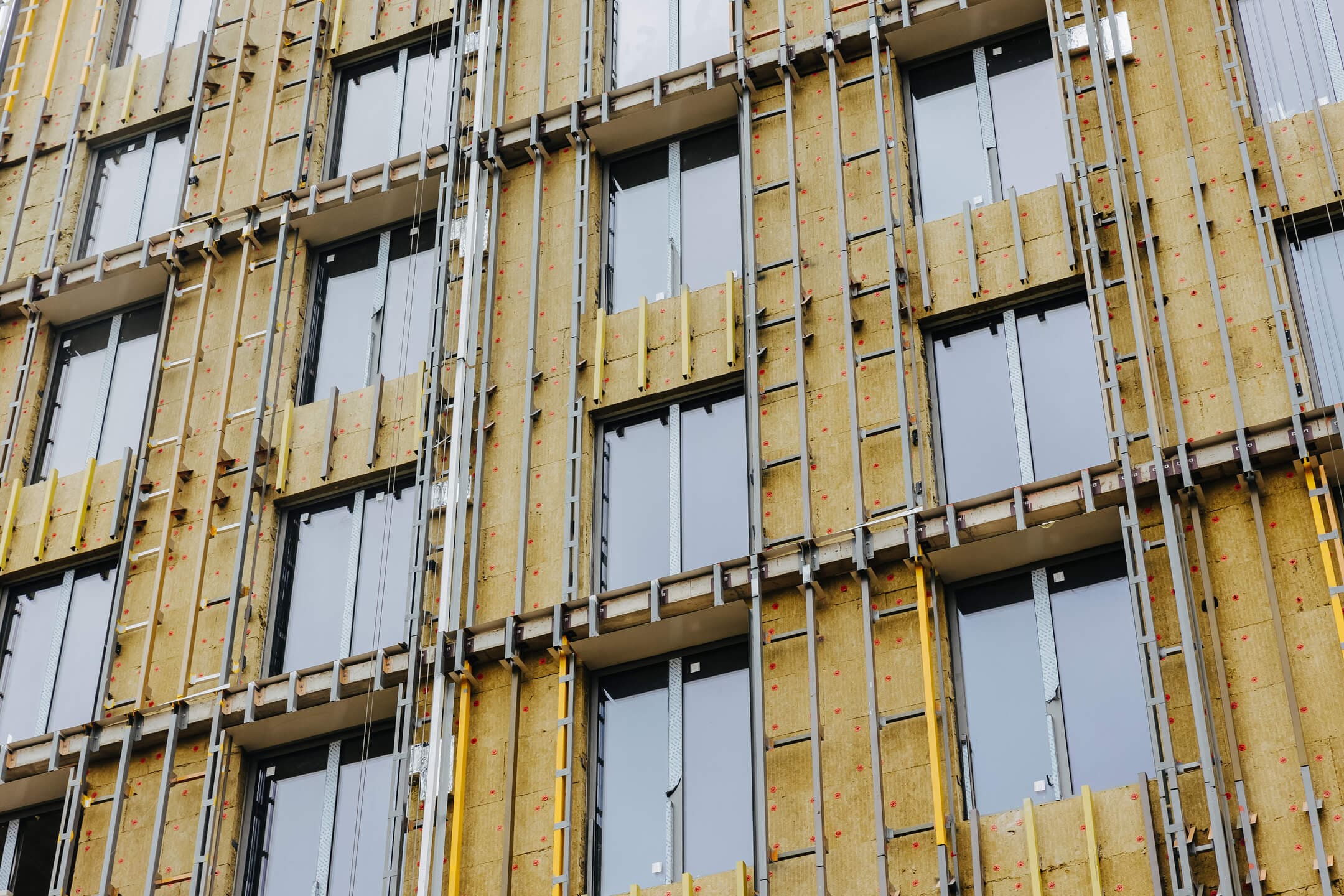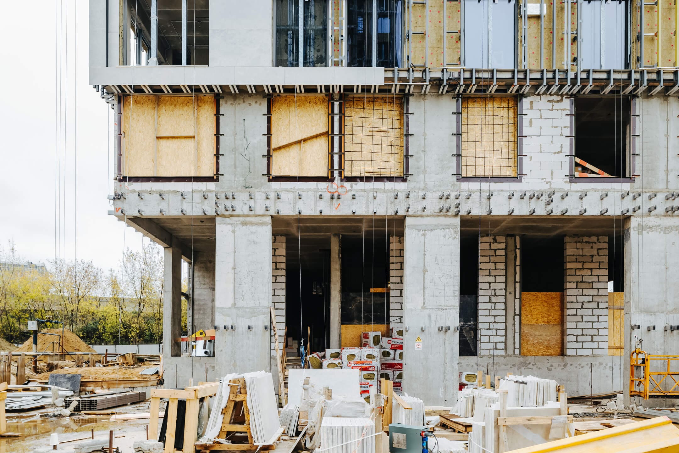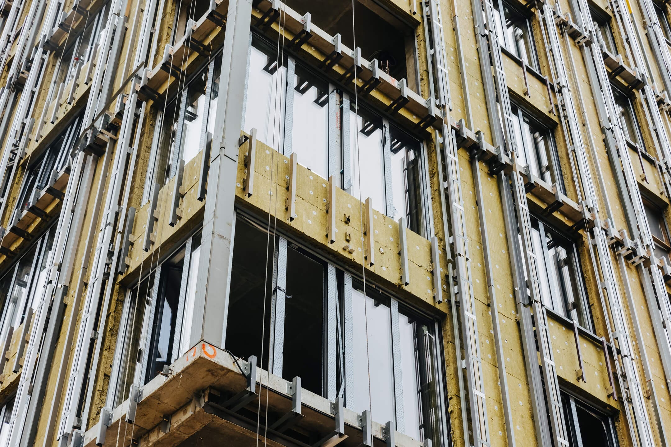 - Фасад. Монтаж противопожарной отсечки. Монтаж минераловатного утеплителя. Монтаж подсистемы. Монтаж облицовки из натурального камня. Монтаж окон типовых этажей.