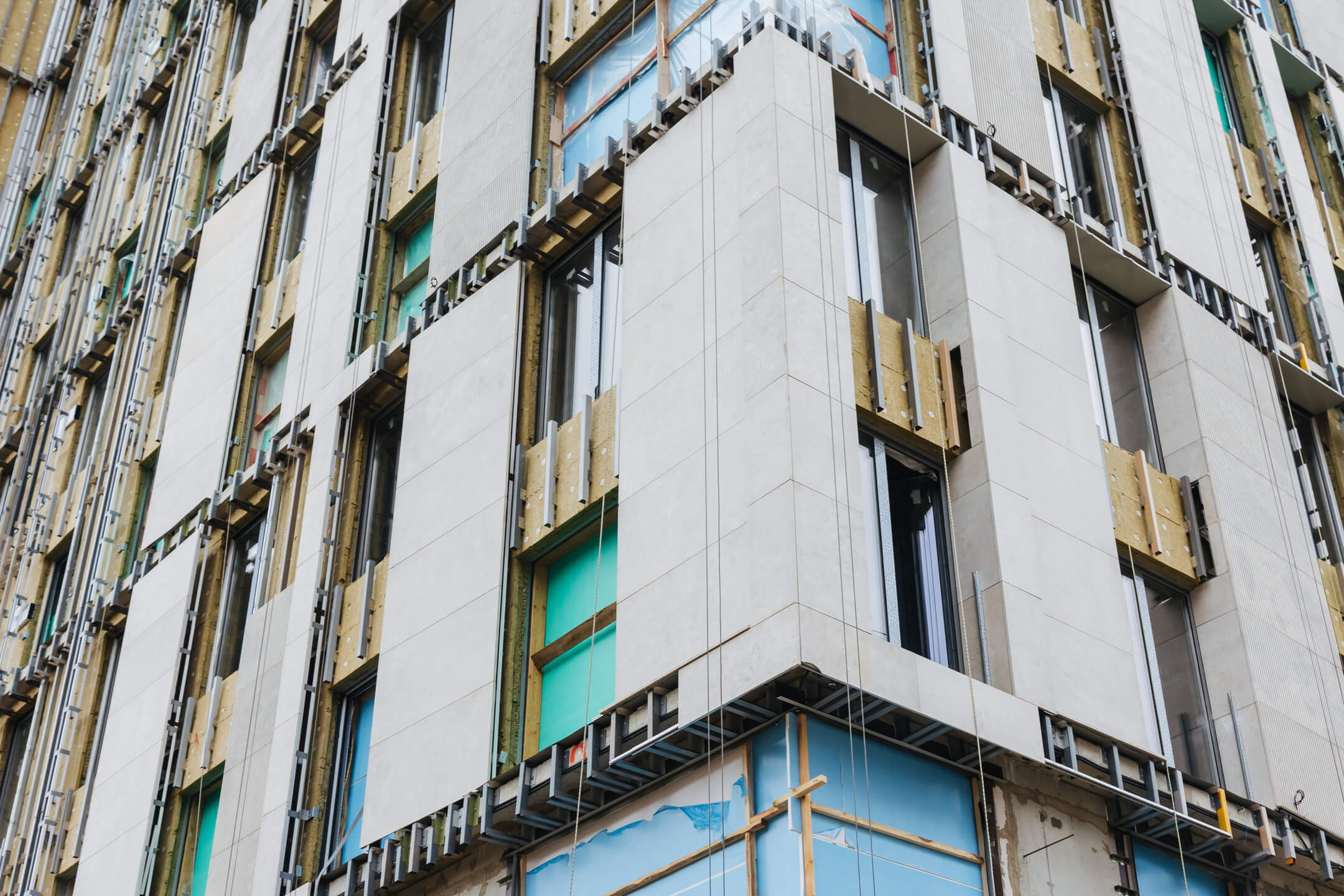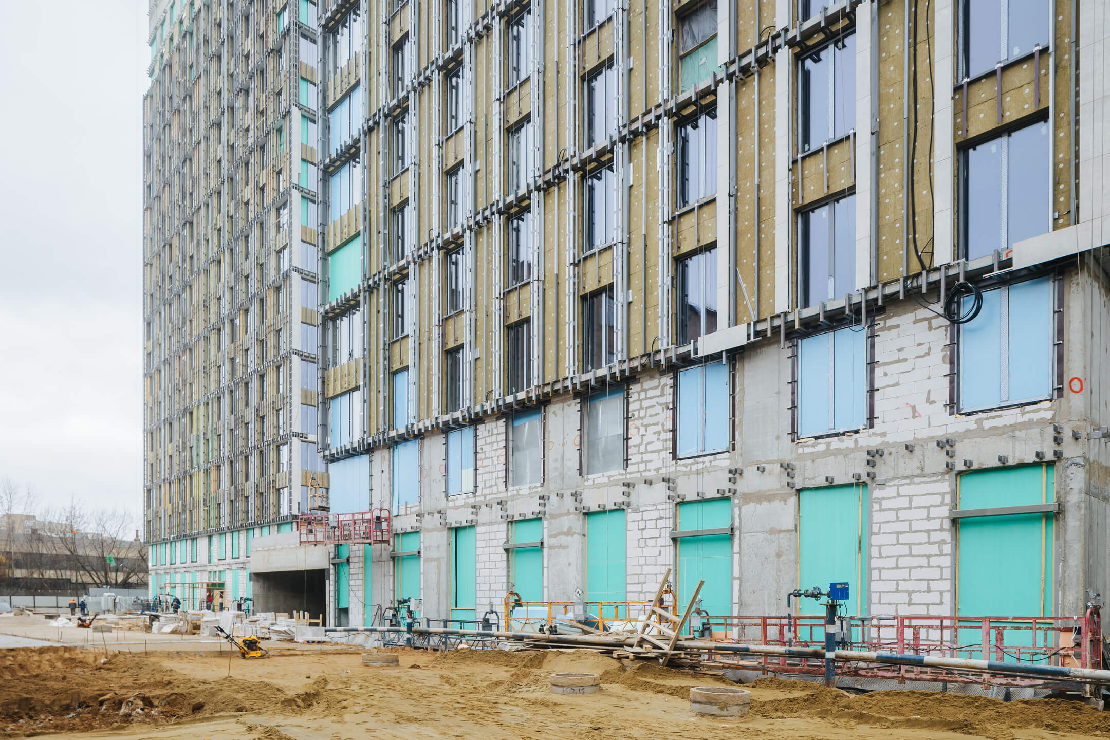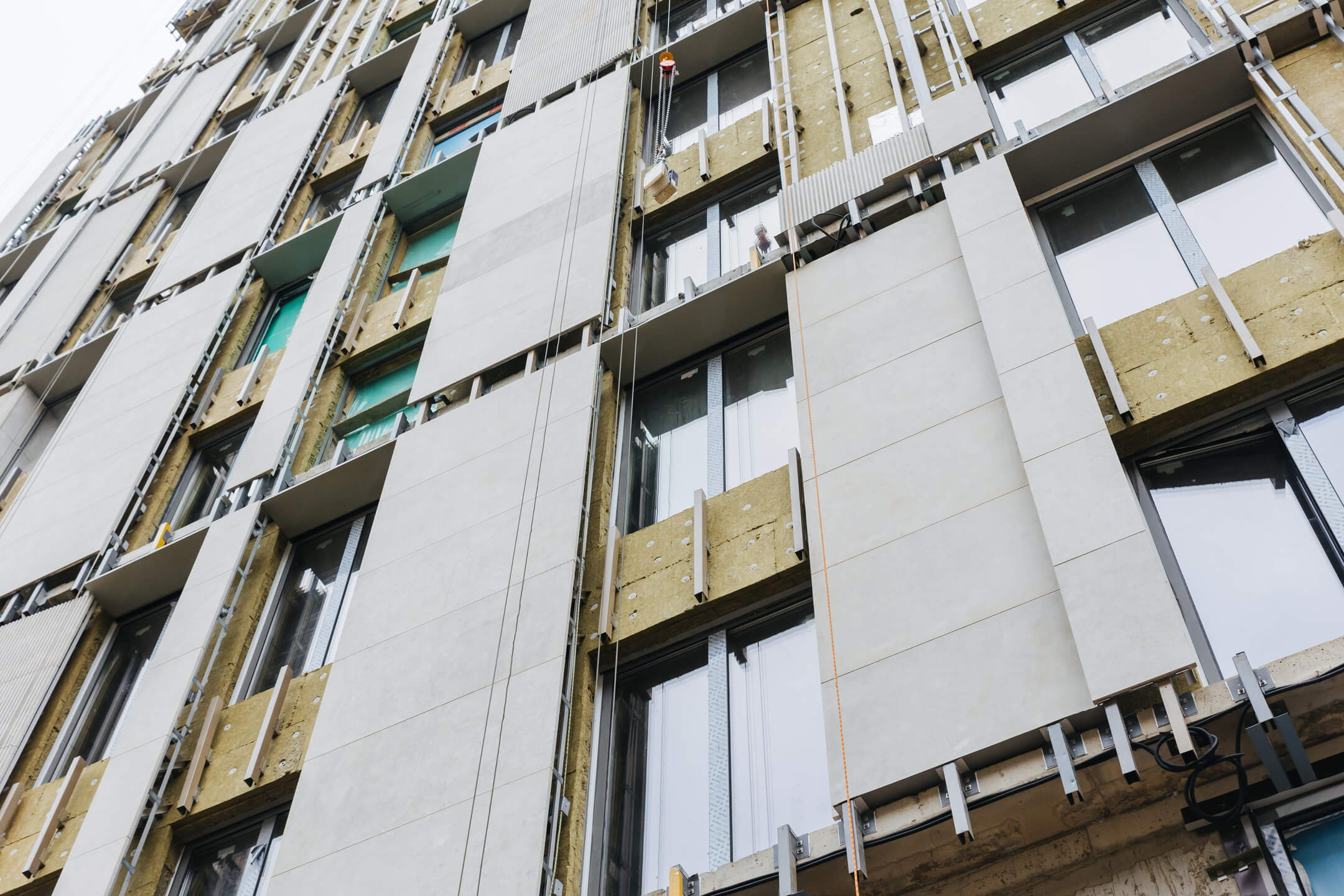 - Фасад. Монтаж минераловатного утеплителя. Монтаж подсистемы. Монтаж облицовки из натурального камня. Монтаж окон типовых этажей.