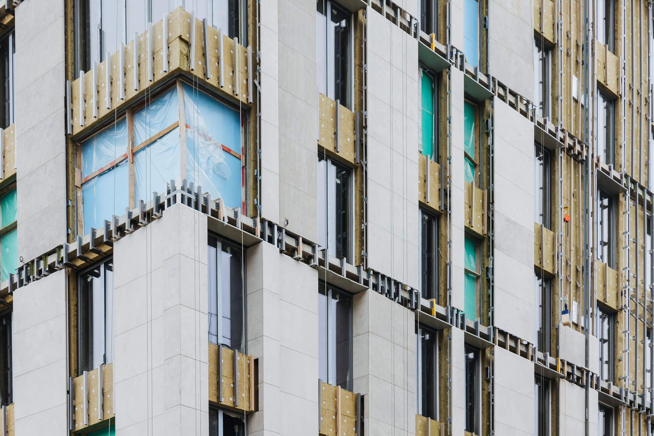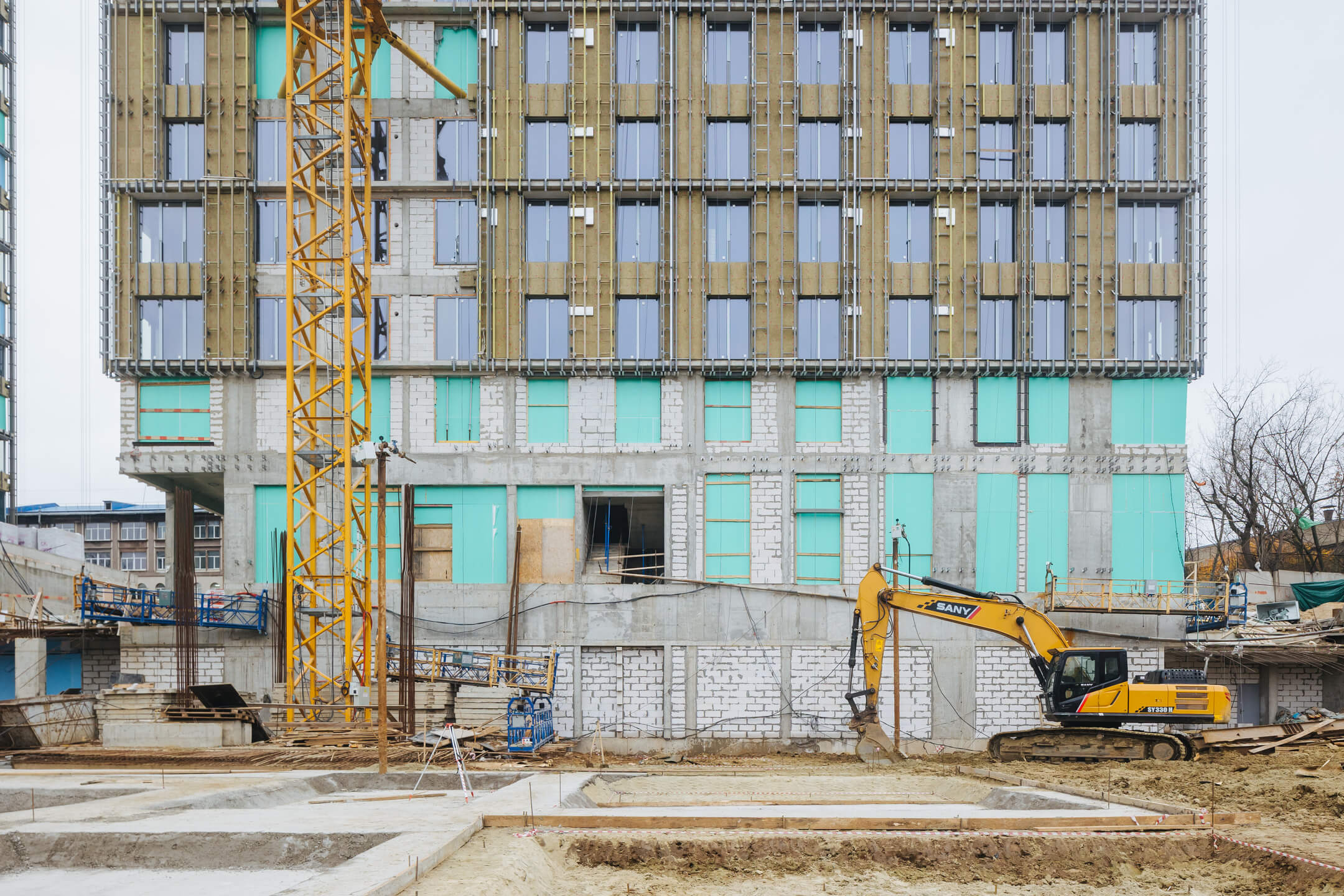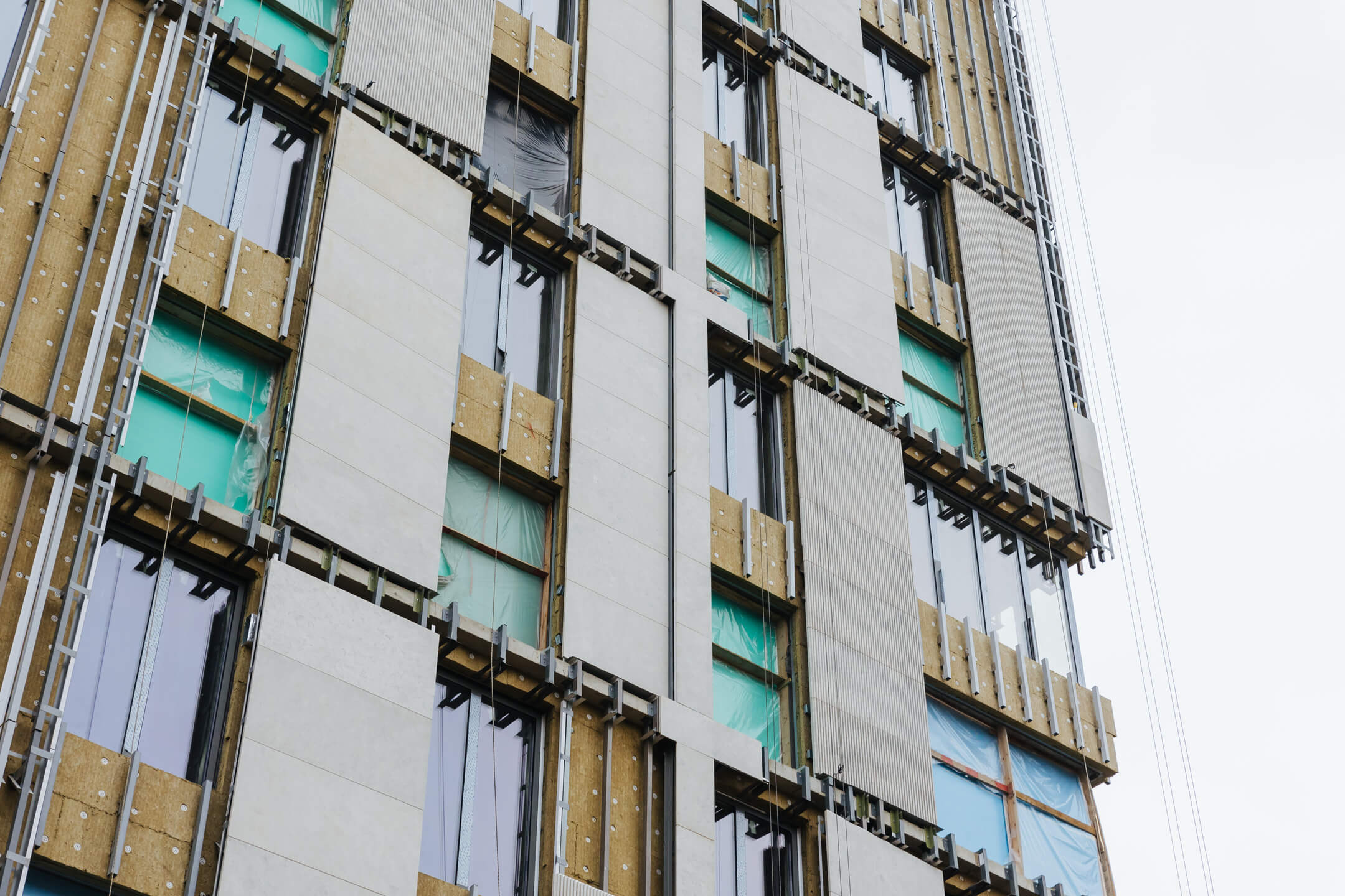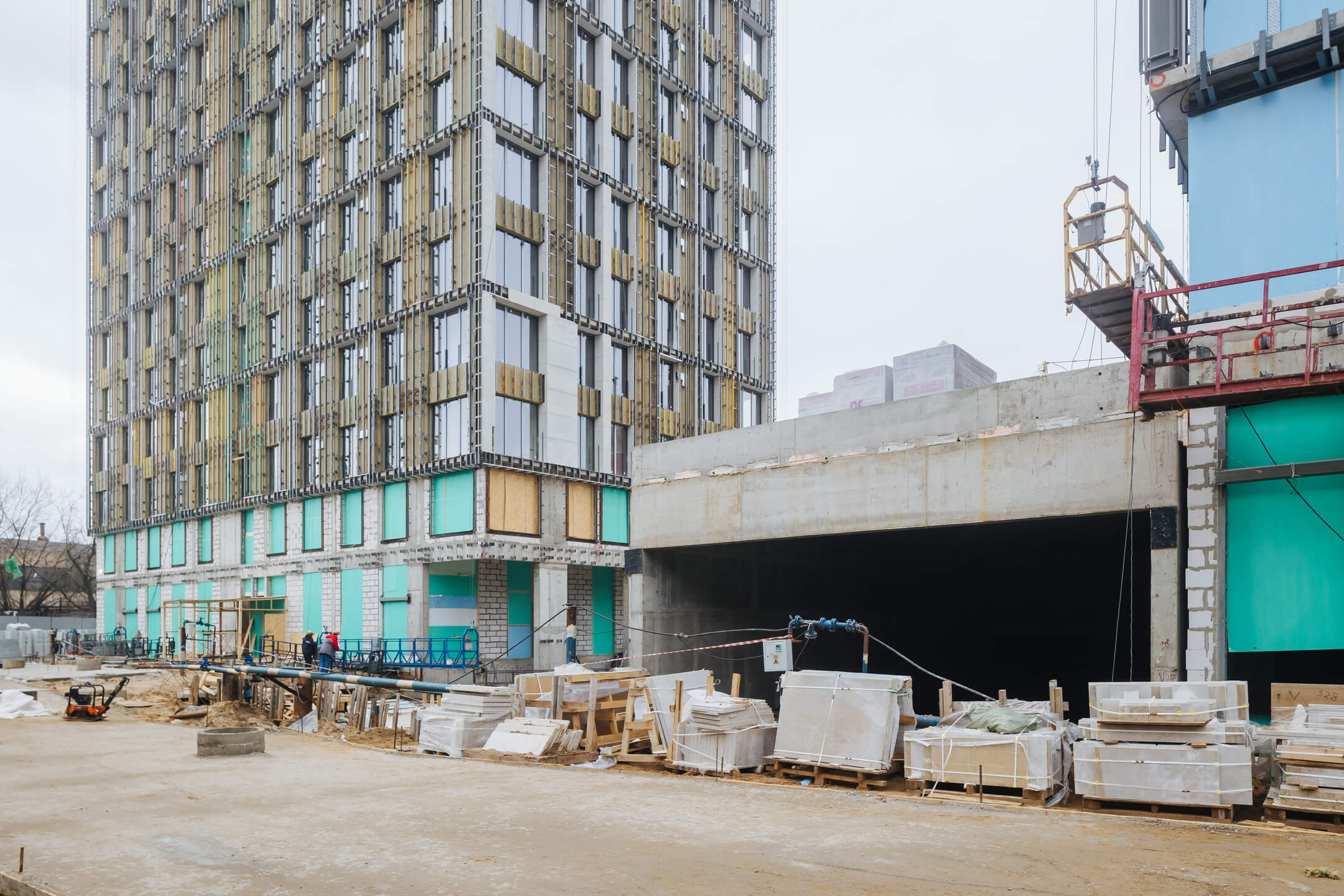- Фасад. Монтаж минераловатного утеплителя. Монтаж подсистемы. Монтаж облицовки из натурального камня. Монтаж окон типовых этажей.