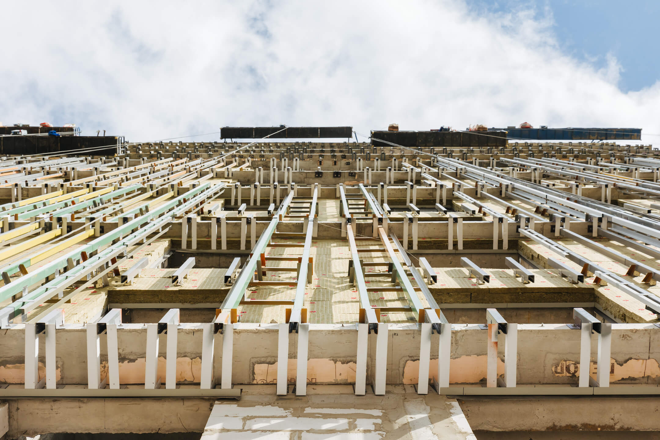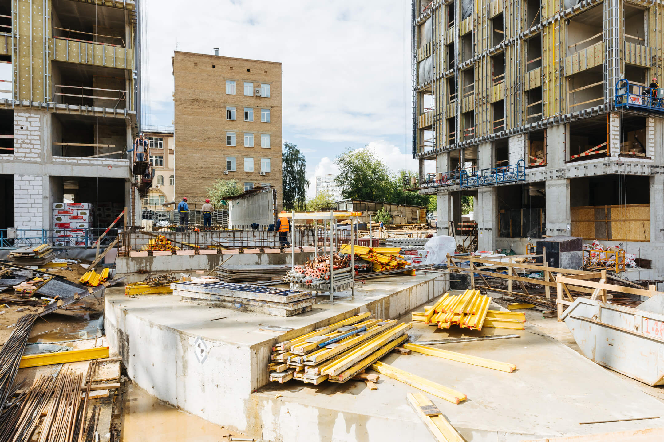 Этап 1.1 (паркинг): Армирование/бетонирование стен и покрытия паркинга и рампы. Гидроизоляция наружных стен и кровли стилобата. Устройство пристенного дренажа, прокладка наружных инженерных систем. Отсыпка пазух котлована, кладка стен и перегородок подземного этажа. Отделка технических помещений. Отделка кладовых. Продолжаются работы по устройству отопления, вентиляции, противопожарного водопровода в рамках внутренних инженерных систем.