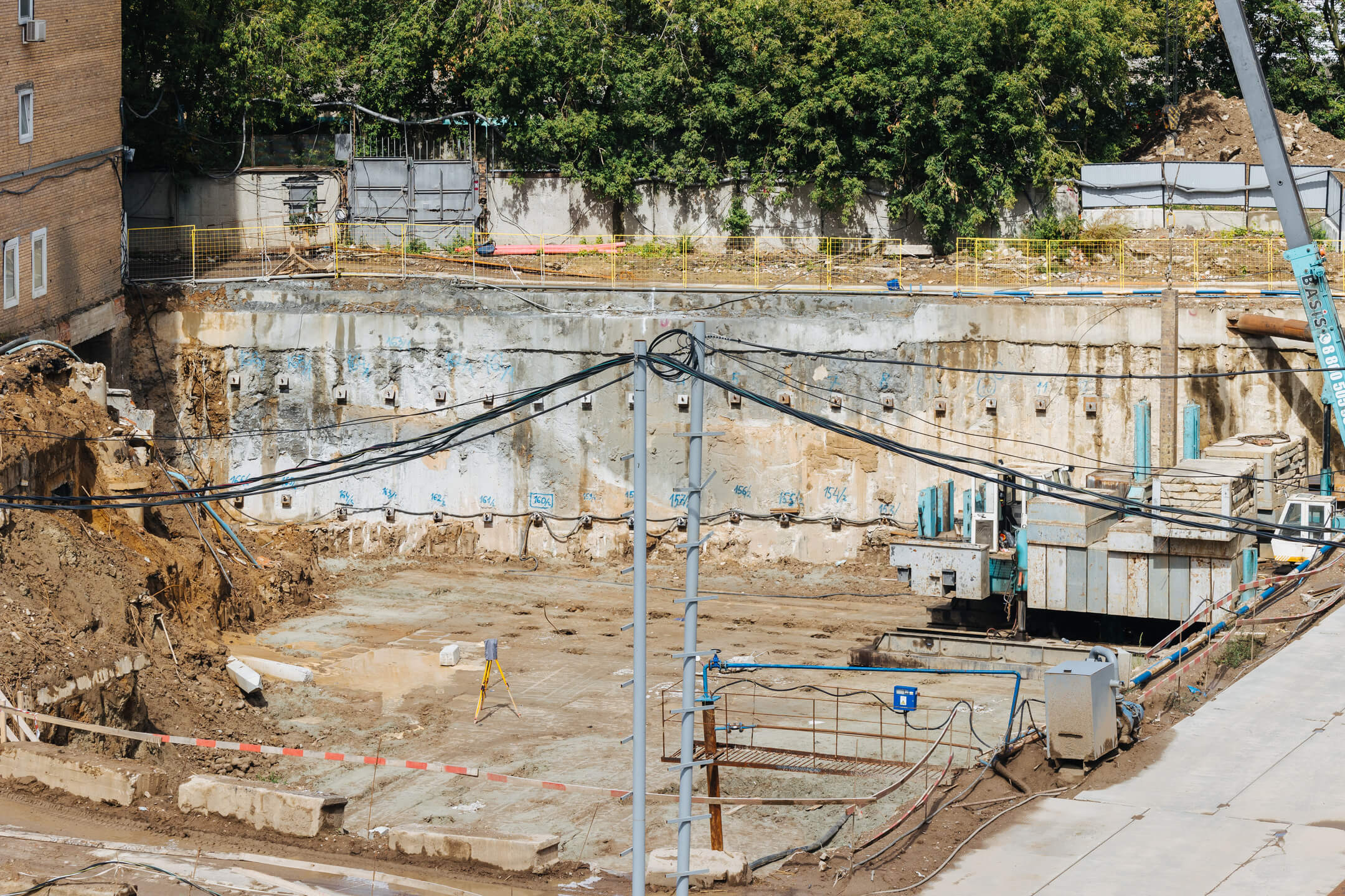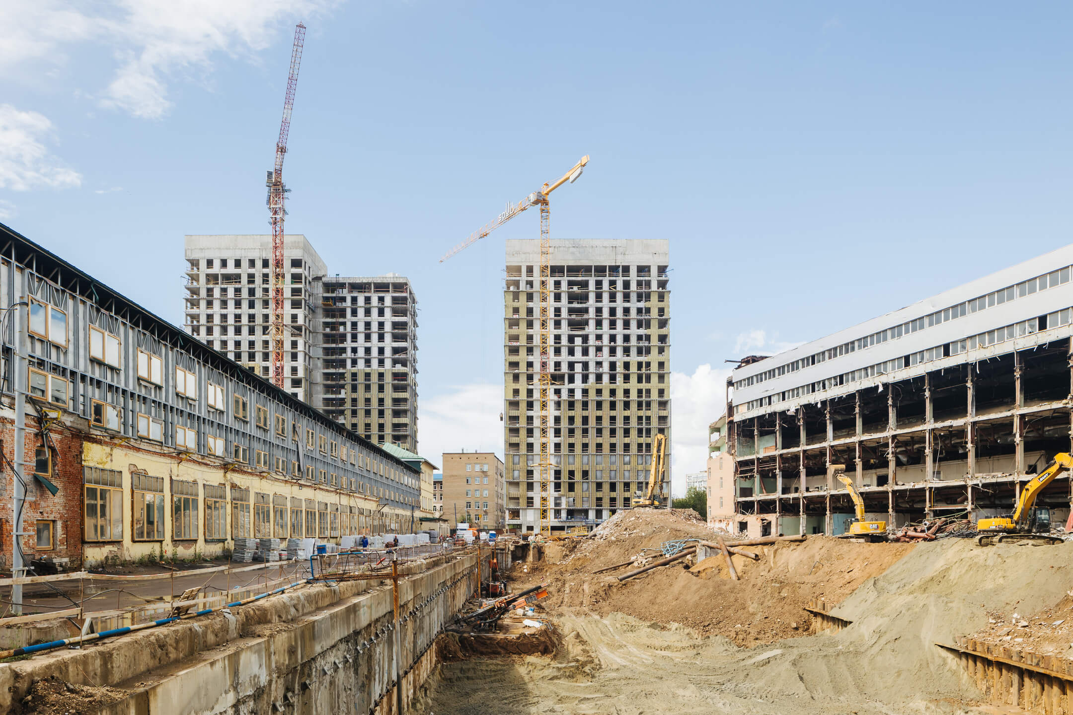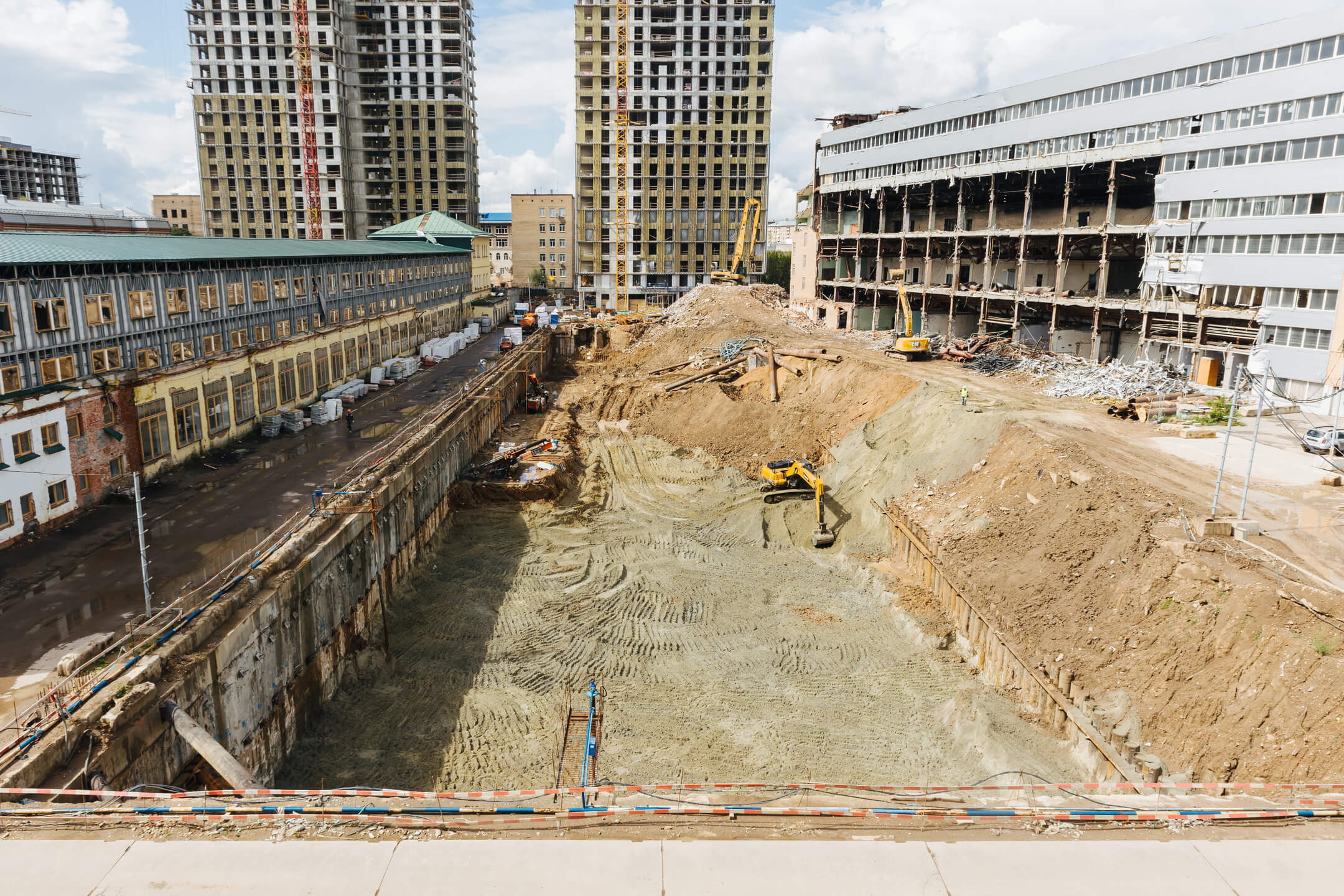 Этап 1.2: устройство свайного поля, шпунтового ограждения, распорной системы, грунтовых анкеров, водопонижения. Разработка котлована, снос зданий и сооружений. Мобилизация подрядчика на монолитные работы.