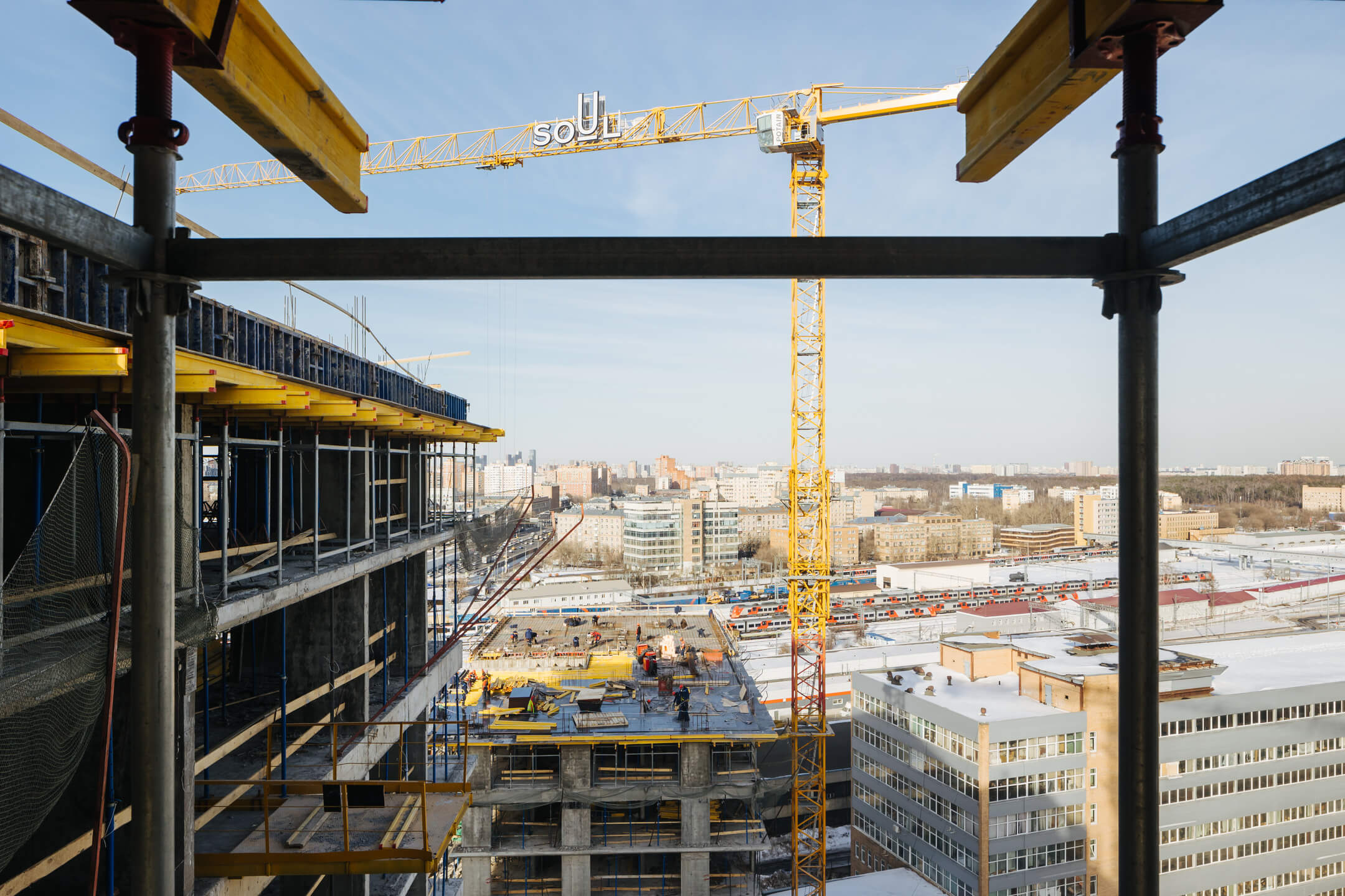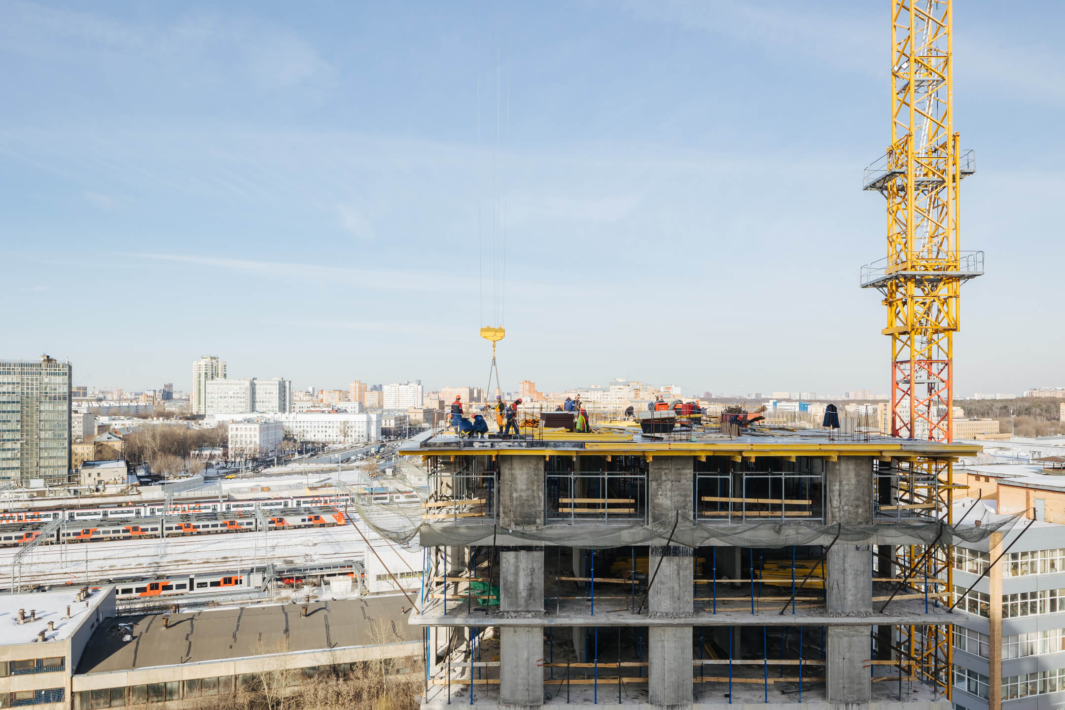 Этап 1.1 (корпус 1): работы по армированию/бетонированию плиты перекрытия 17 этажа и вертикальных конструкций 18 этажа, кладочные работы на 2-10 этажах, мобилизация фасадной организации.