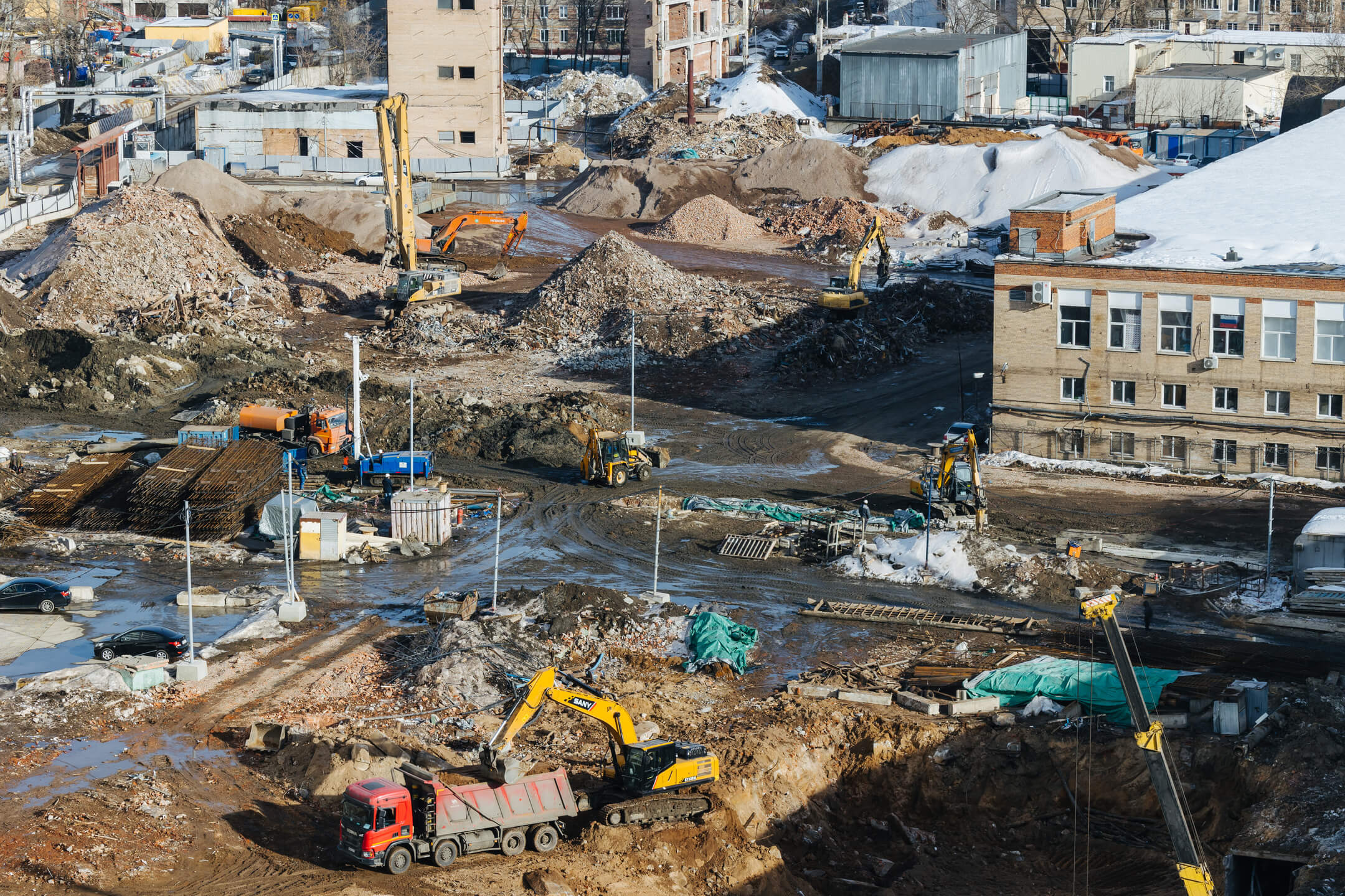 Этап 1.2 (корпуса 3, 4, 5, 6): устройство стены в грунте и обвязочной балки, устройство водопонижения, разработка котлована, снос зданий и сооружений, демонтаж фундаментов сносимых зданий.