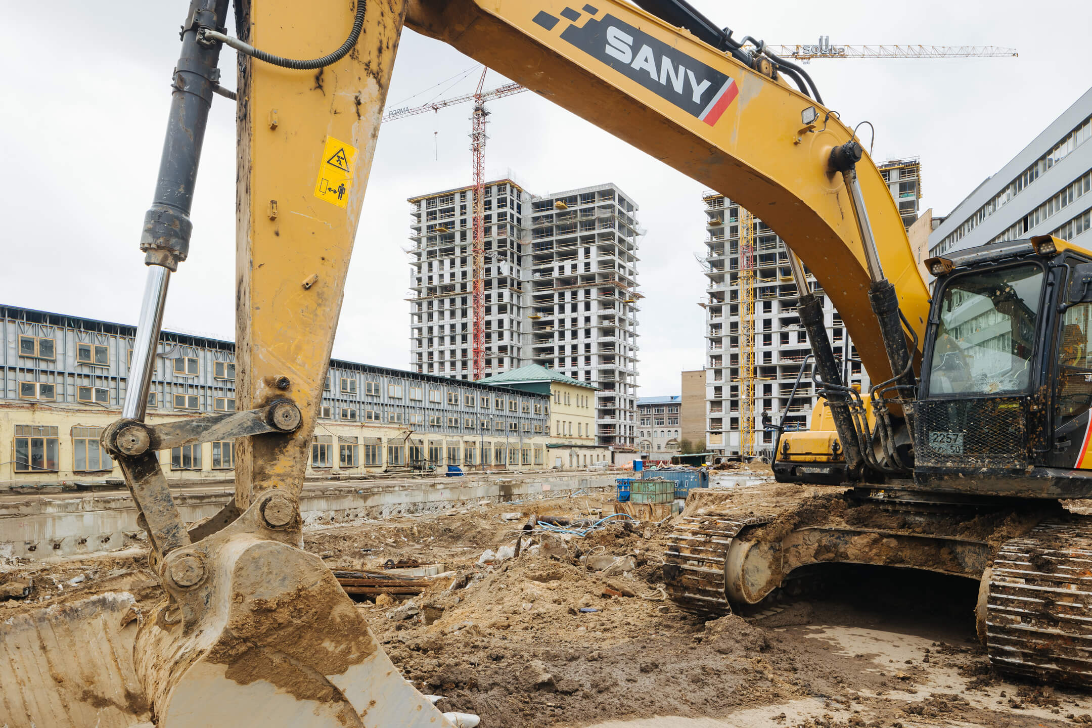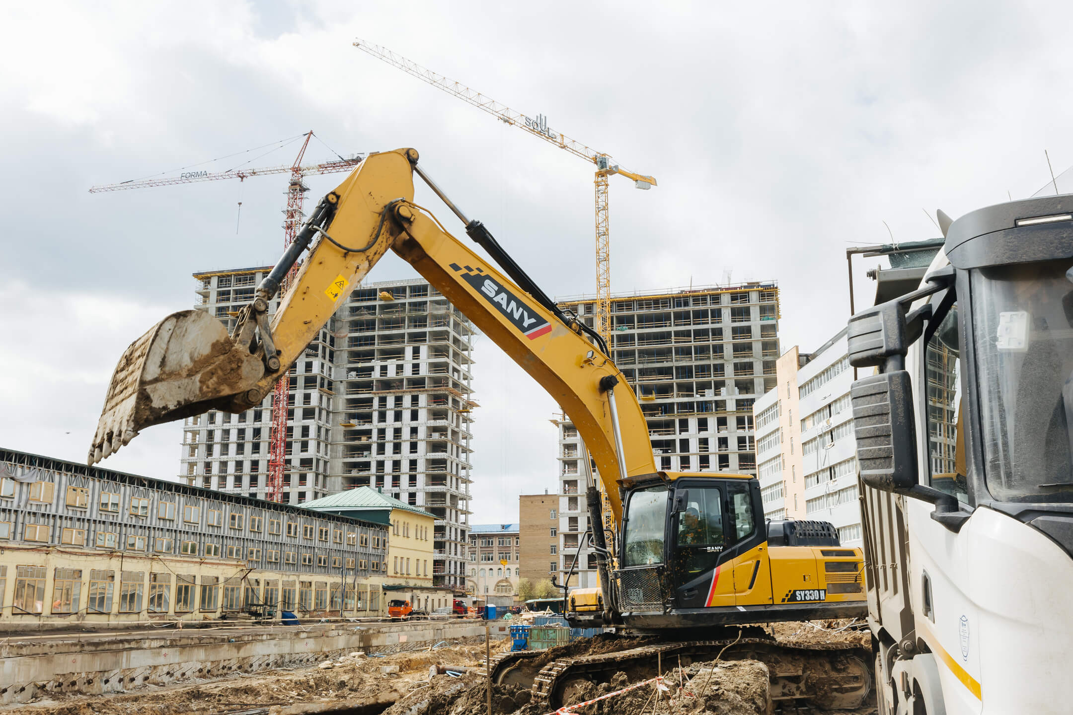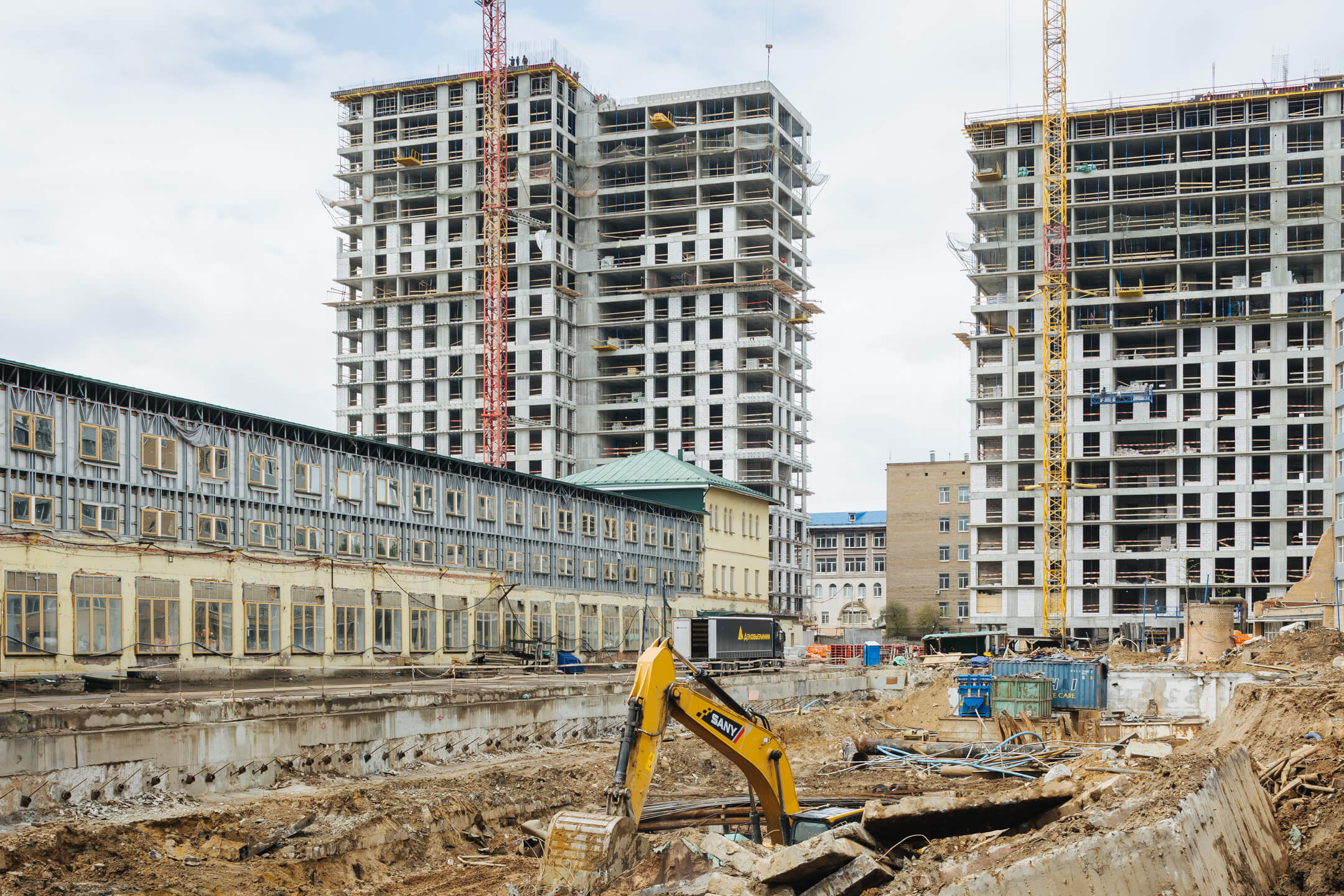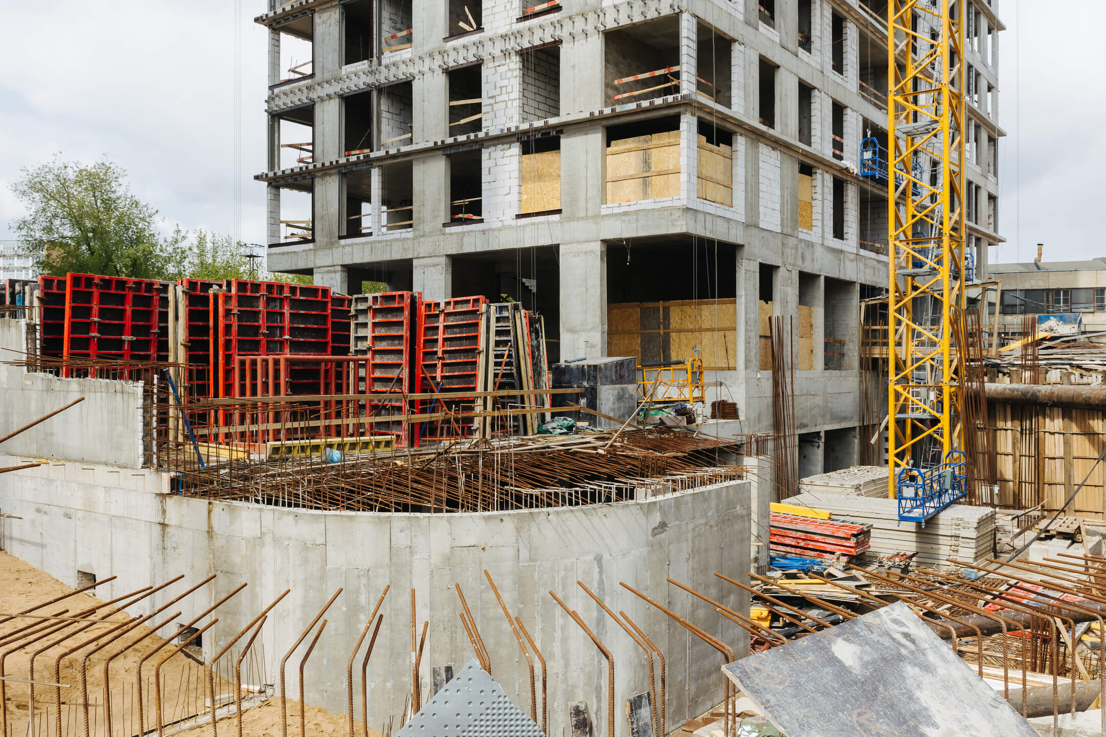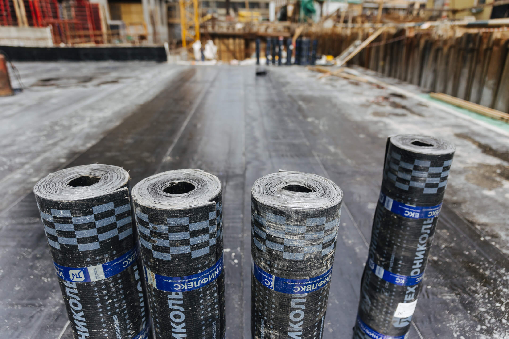 Этап 1.1 (паркинг): армирование/бетонирование стен и покрытия паркинга и рампы. Гидроизоляция наружных стен и кровли стилобата, устройство пристенного дренажа, прокладка наружных инженерных систем. Отсыпка пазух котлована, кладка стен и перегородок подземного этажа. Старт работ по устройству отопления, вентиляции, противопожарного водопровода.