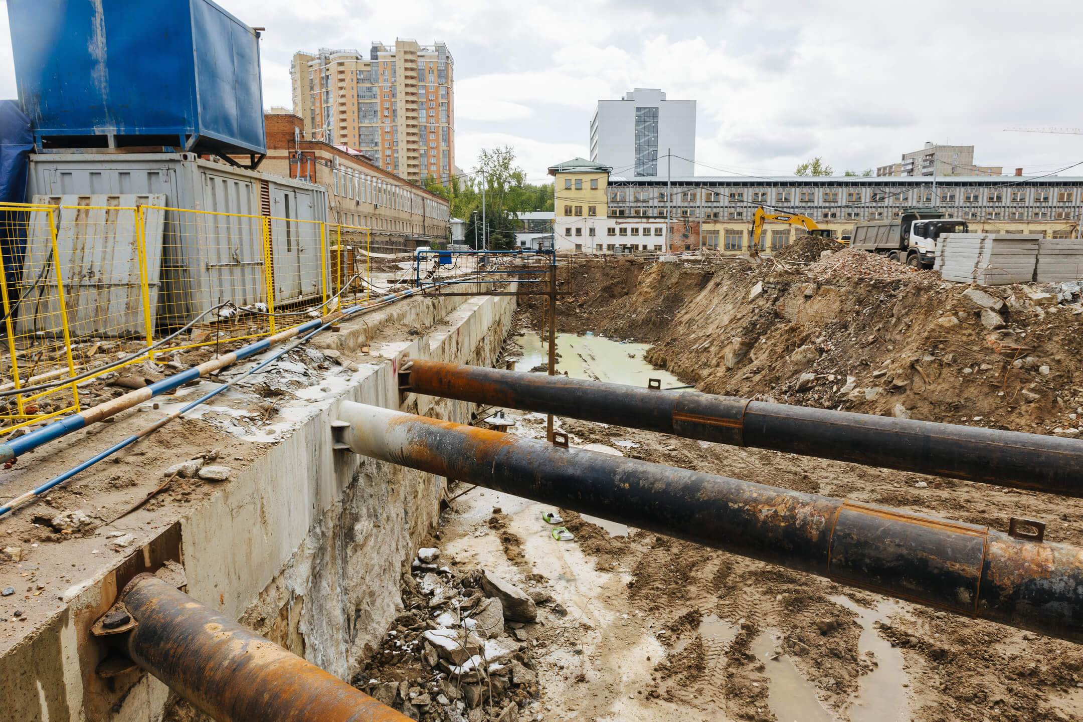 Этап 1.2: устройство стены в грунте и обвязочной балки, распорной системы и грунтовых анкеров, водопонижения. Разработка котлована, снос зданий и сооружений.