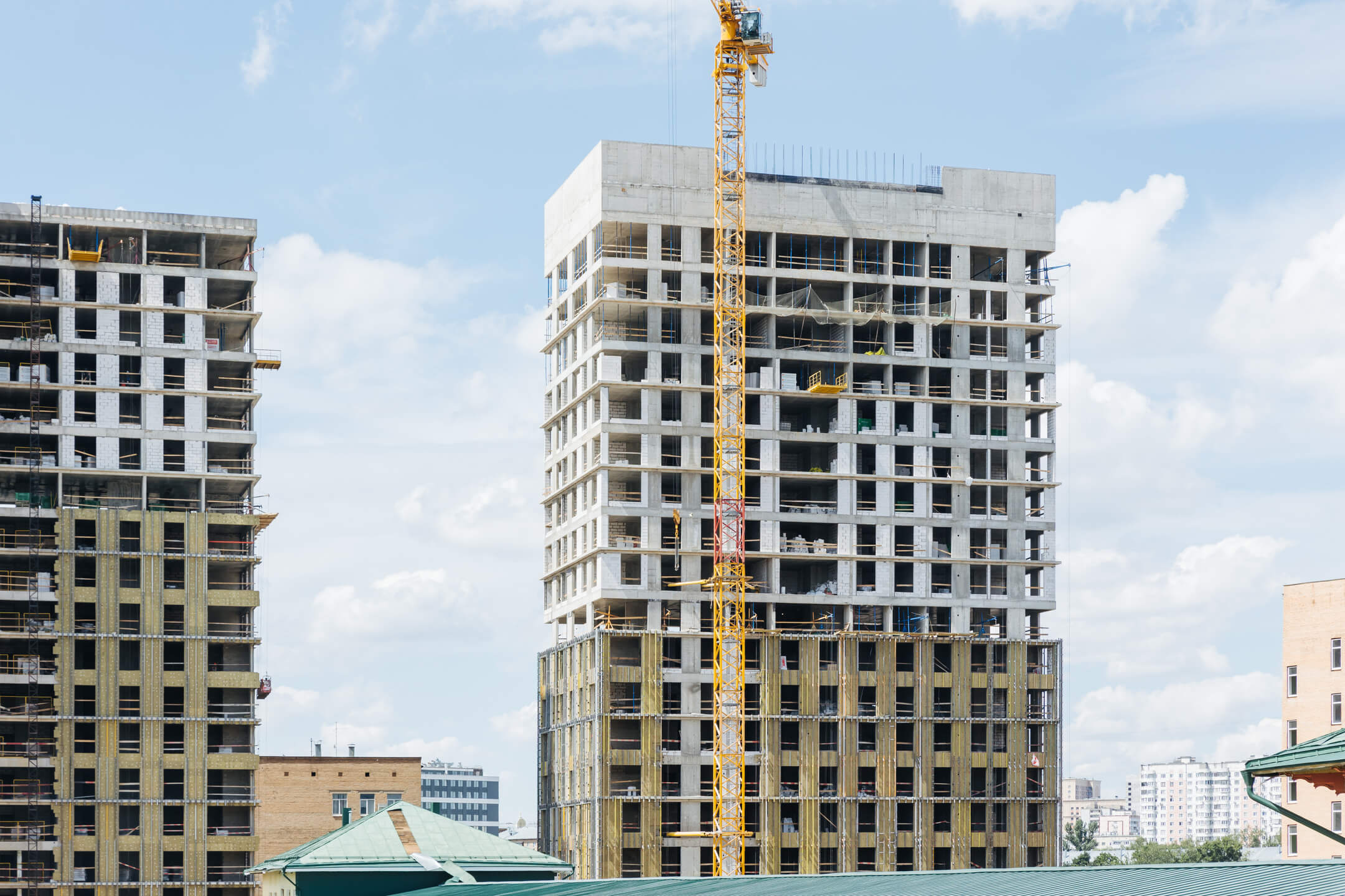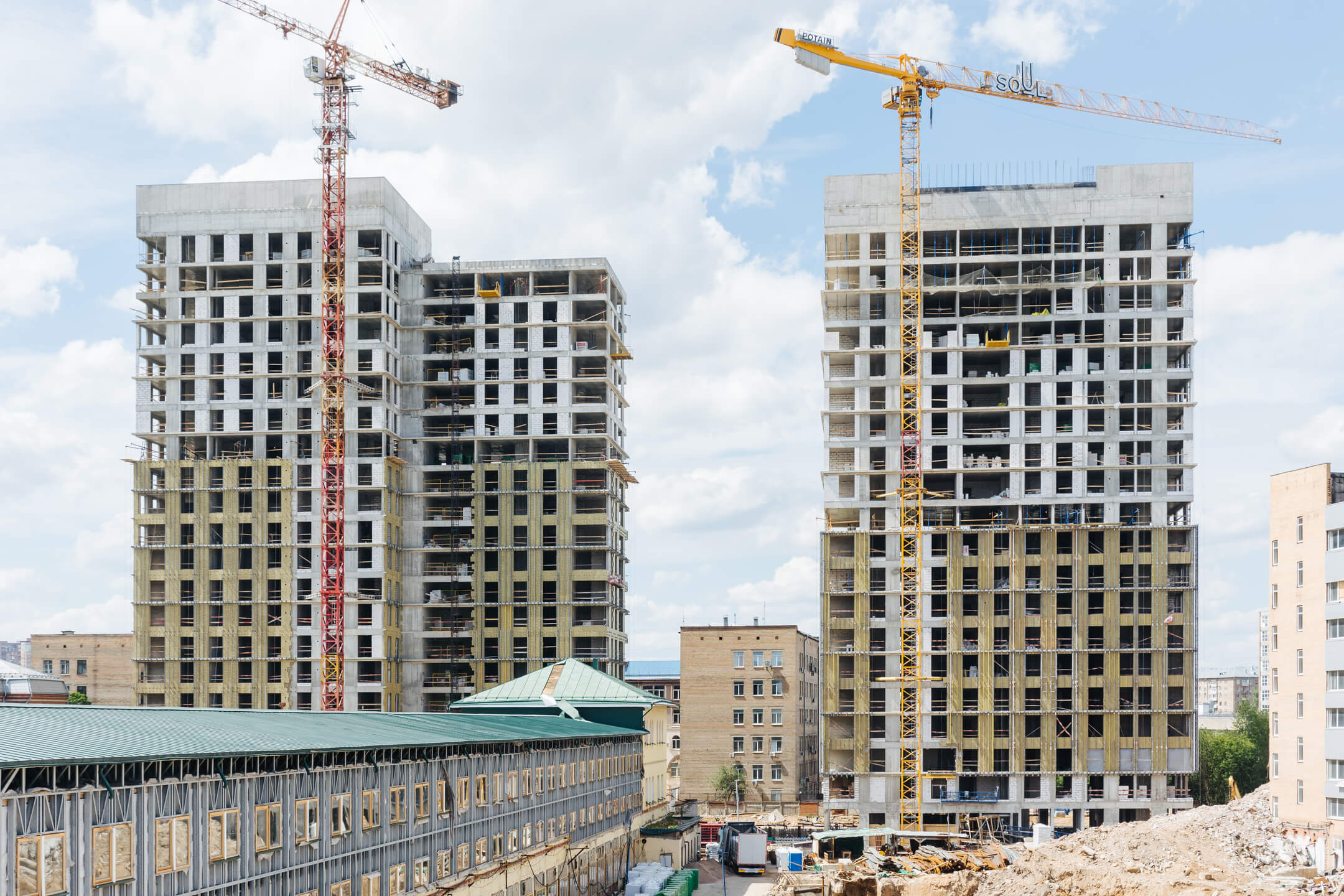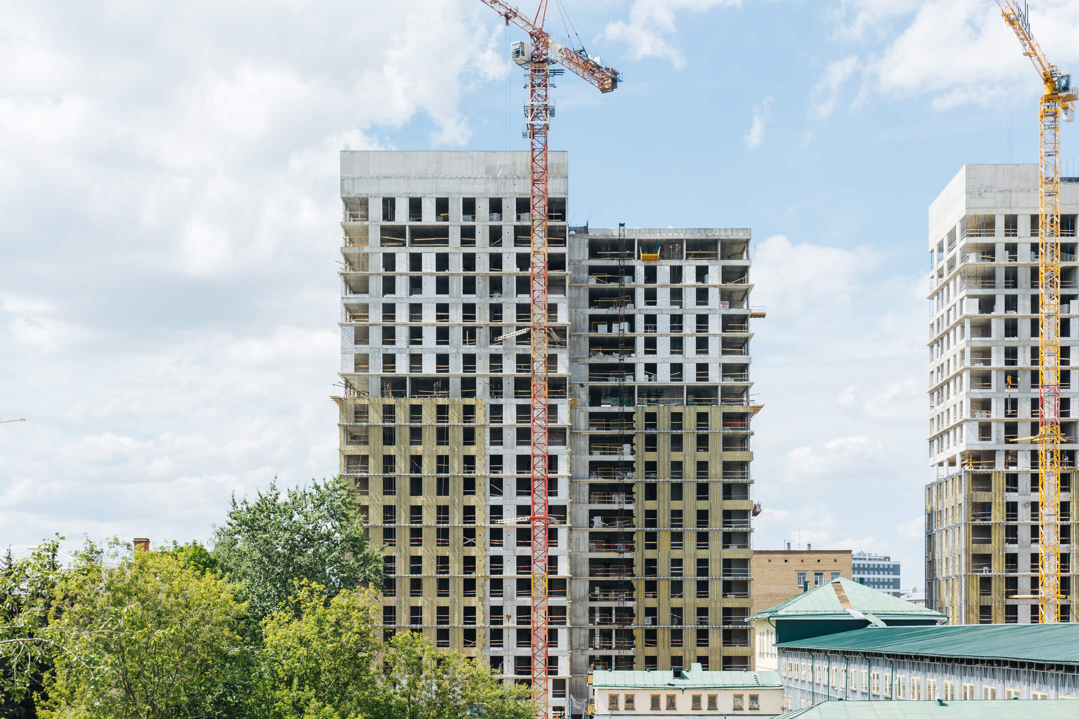 Этап 1.1 (корпус 1): подготовка к кровельным работам. Продолжаются каменные работы на 10-20 этажах, монтируются лестничные марши на 21 этаже. В части внутренних инженерных систем ведется устройство отопления, вентиляции, ведутся электромонтажные работы. Фасад: монтаж противопожарной отсечки, минераловатного утеплителя, подсистемы.