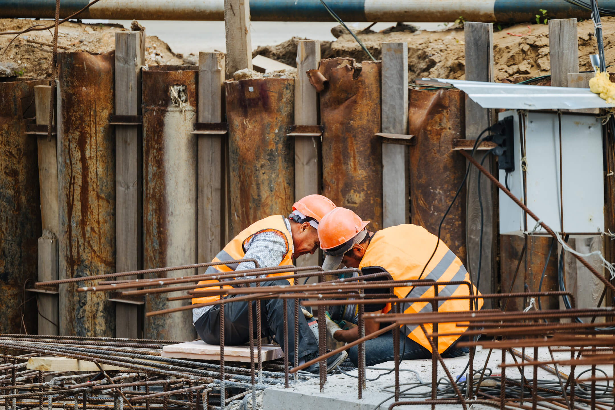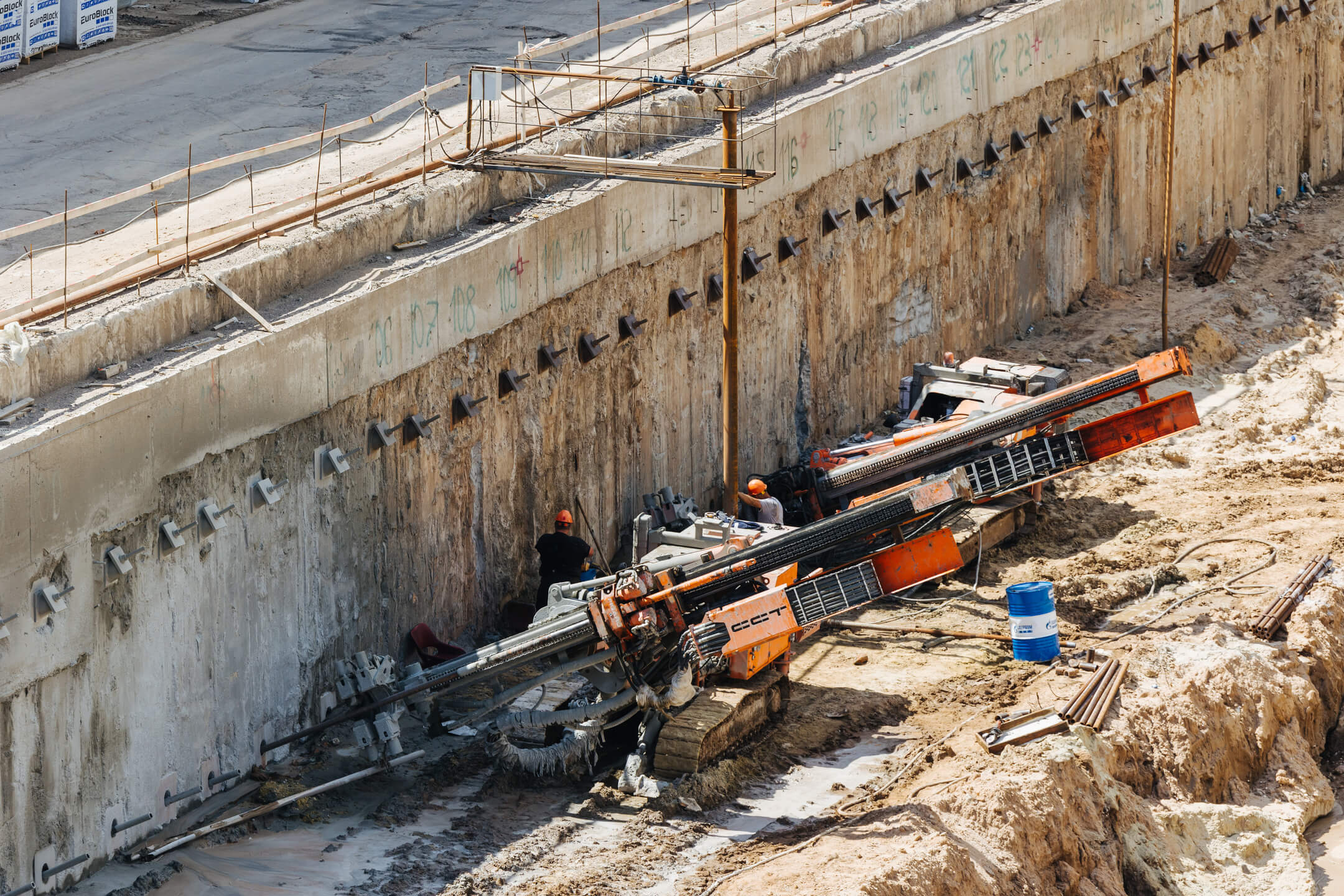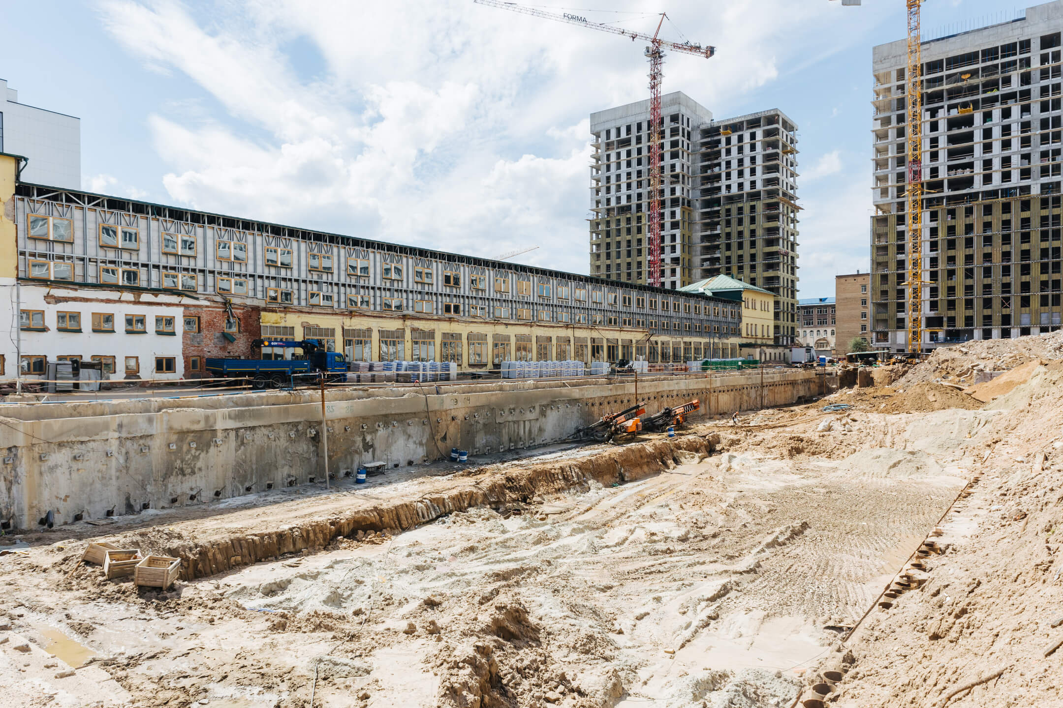 Этап 1.2: устройство шпунтового ограждения, распорной системы, грунтовых анкеров, водопонижения. Разработка котлована, снос зданий и сооружений.