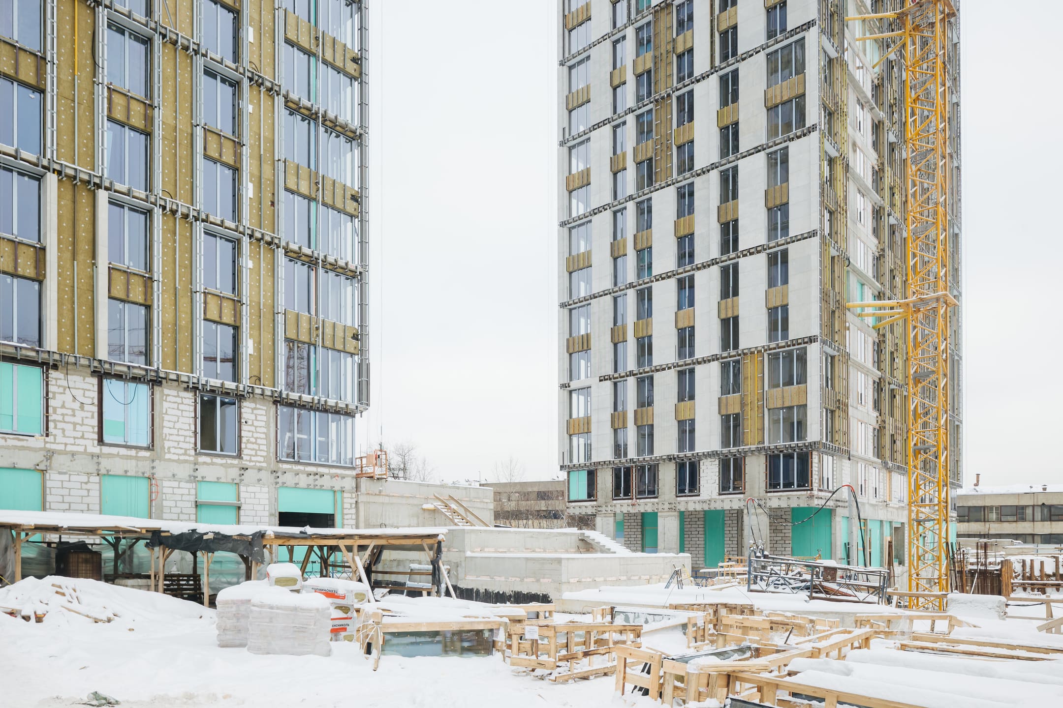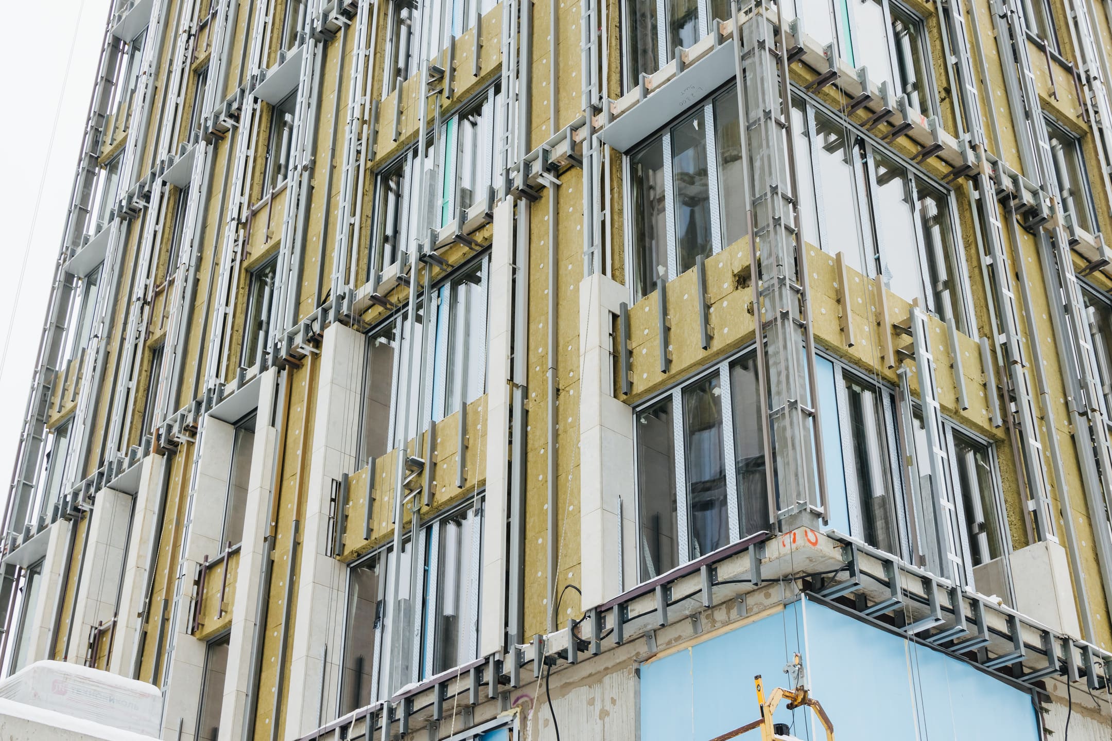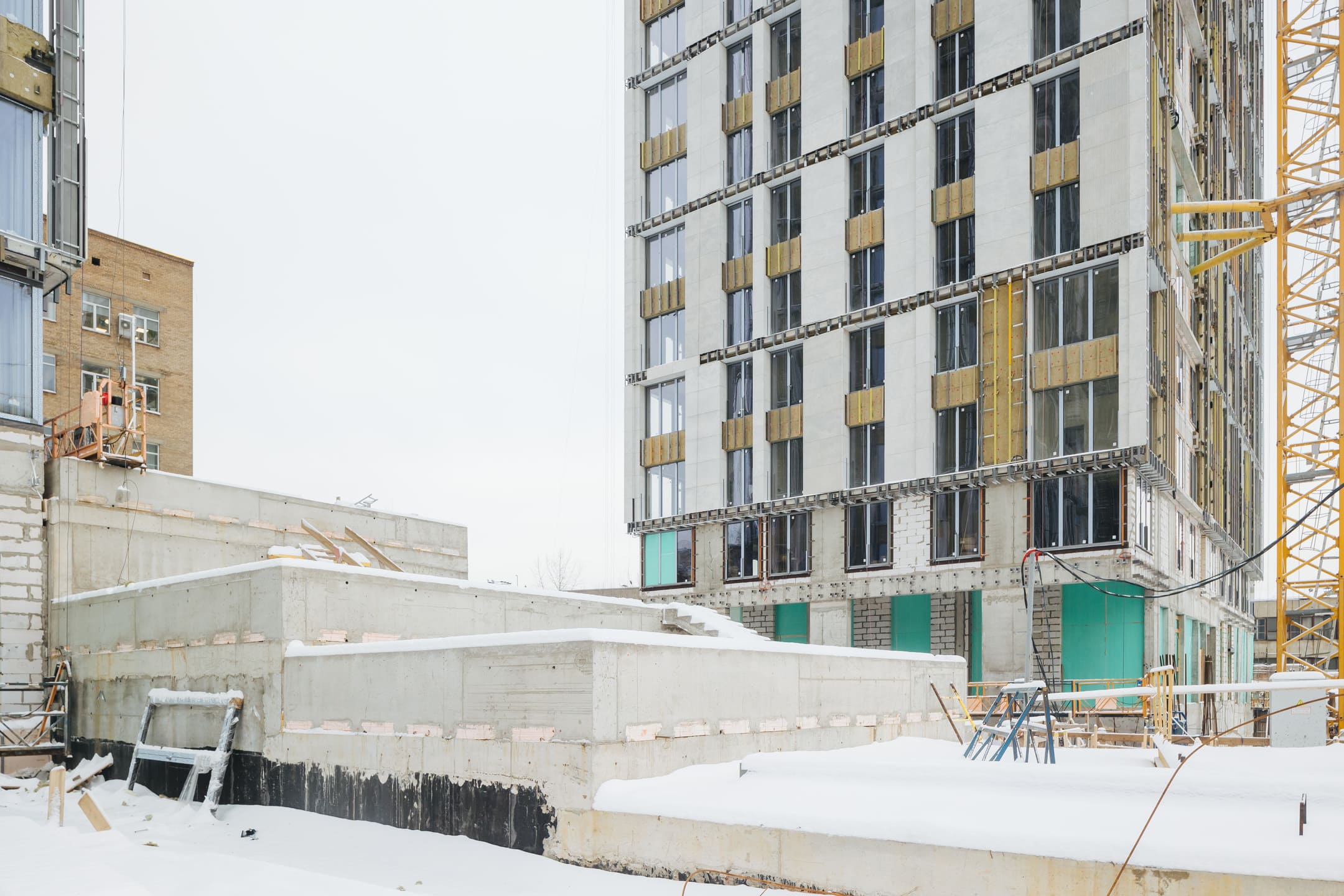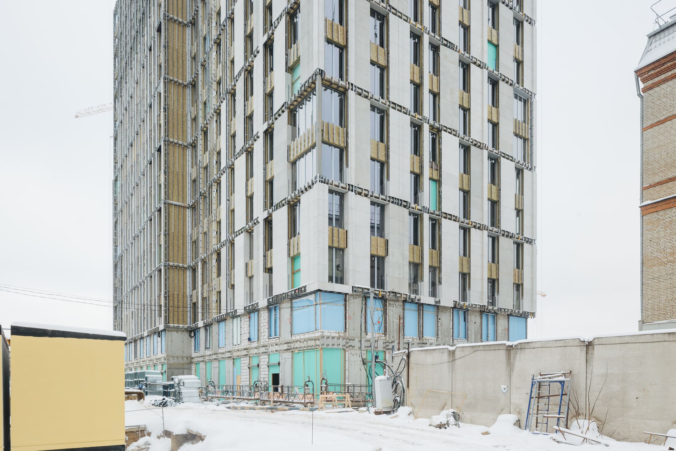 - Фасад. Монтаж минераловатного утеплителя. Монтаж подсистемы. Монтаж облицовки из натурального камня. Монтаж окон типовых этажей.