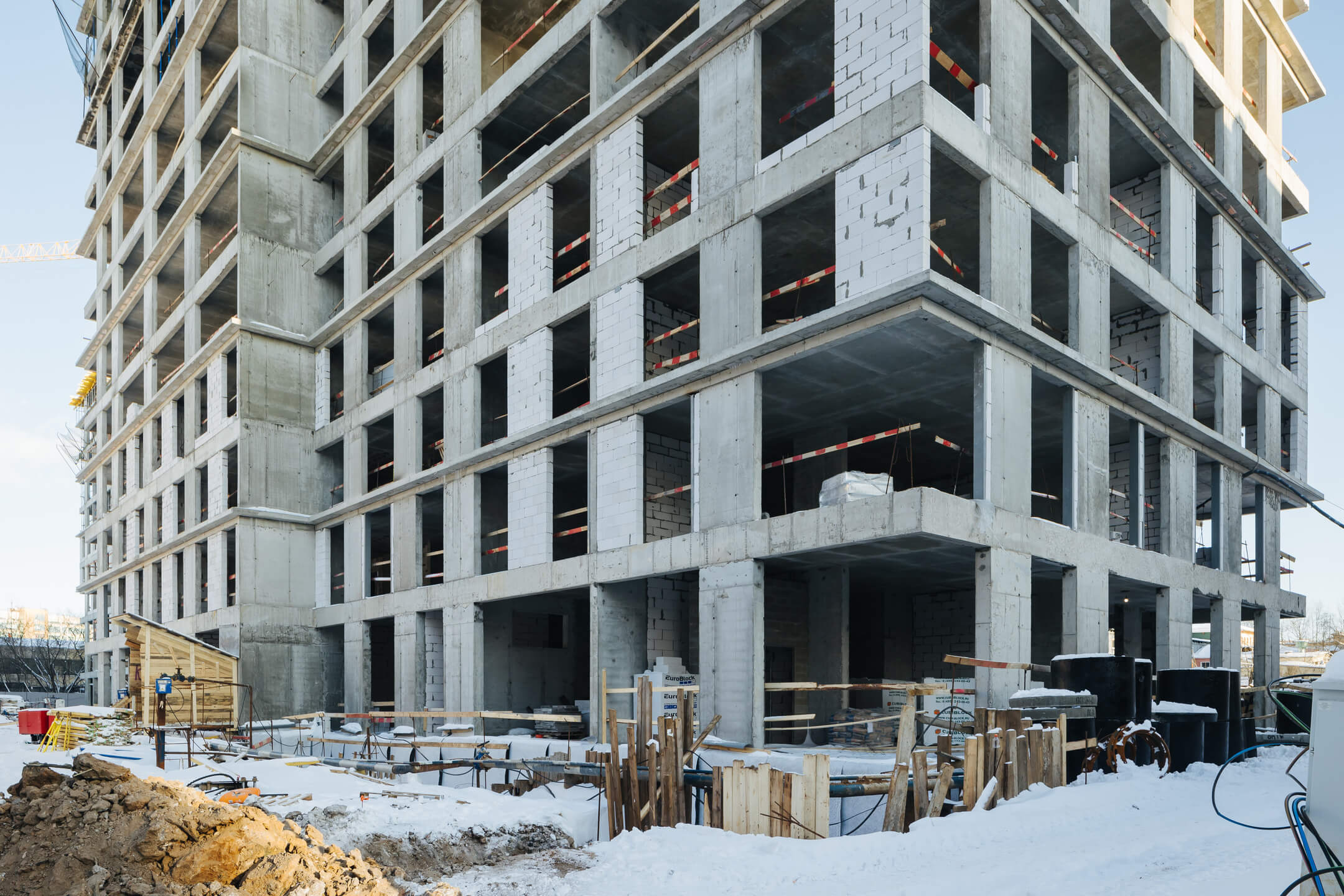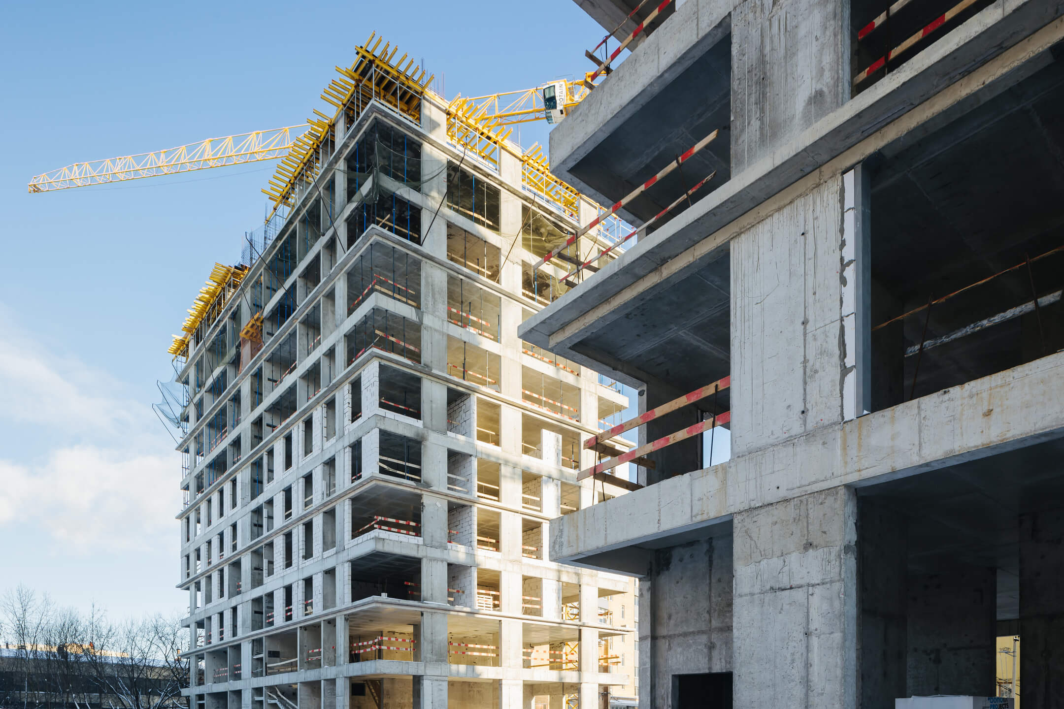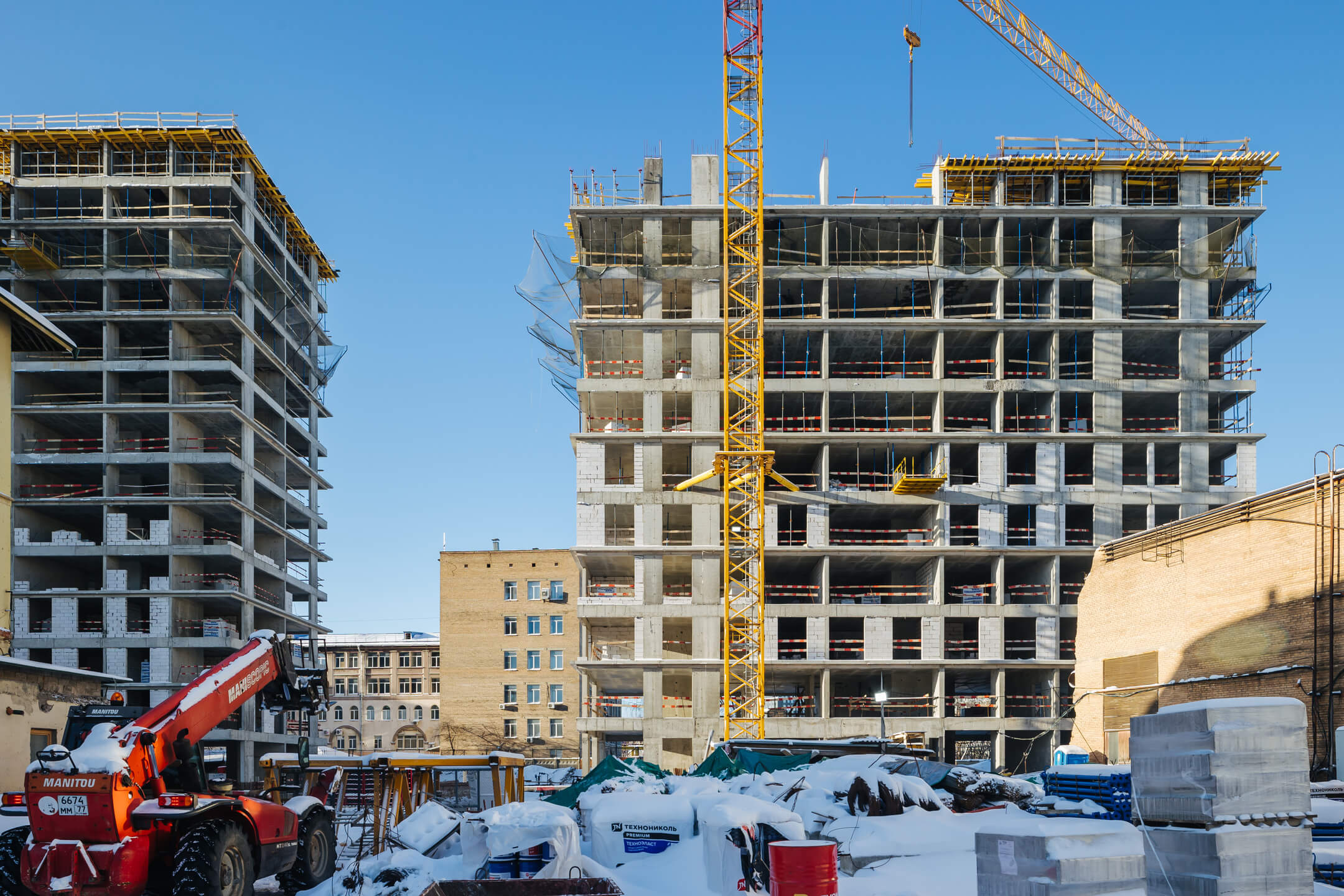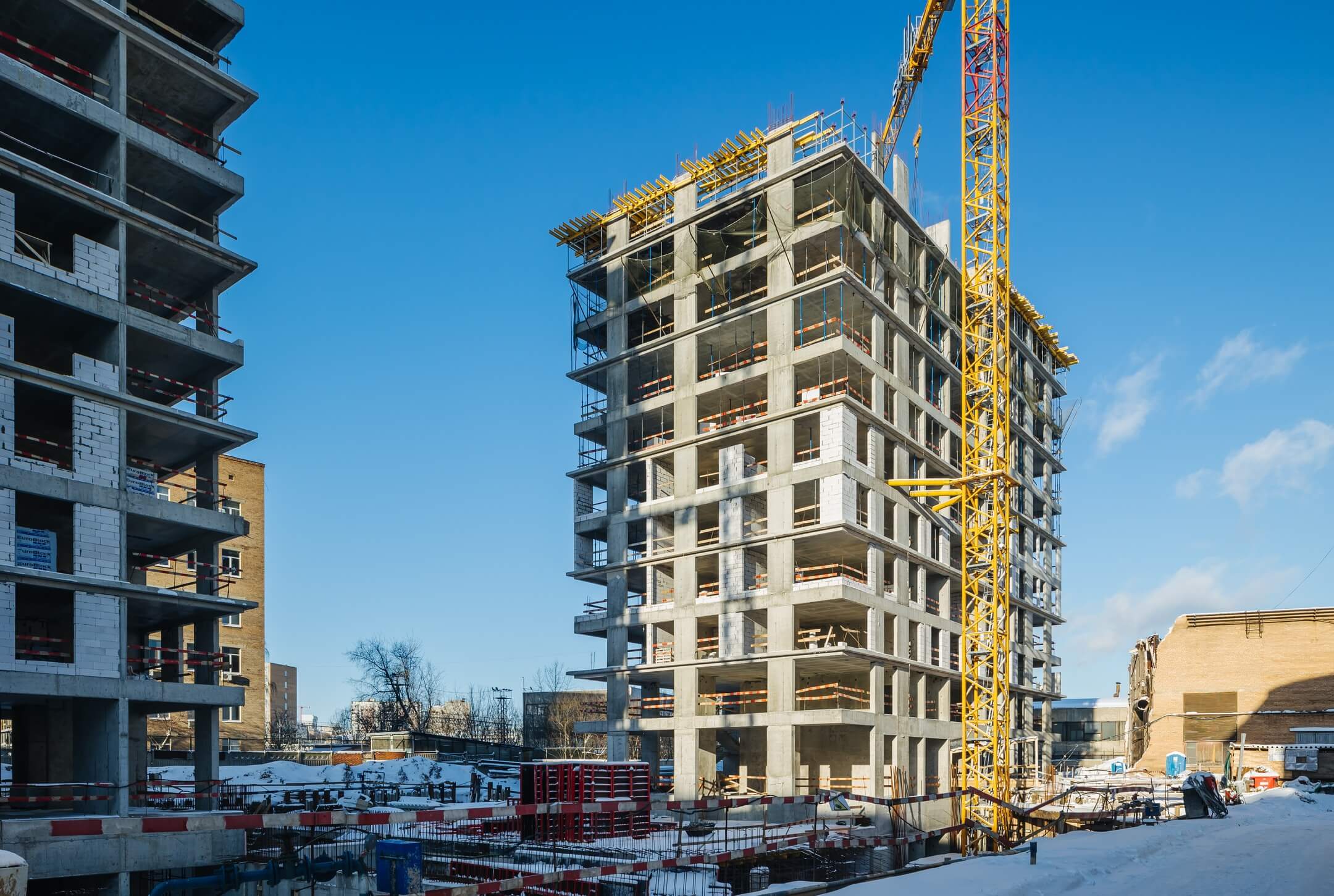 Этап 1.1 (корп. 1 и 2): ведутся работы по армированию/бетонированию плит перекрытия 11-13 этажей и вертикальных конструкций 12-14 этажей, а также кладочные работы на 2, 3, 4, 5, 6 этажах.