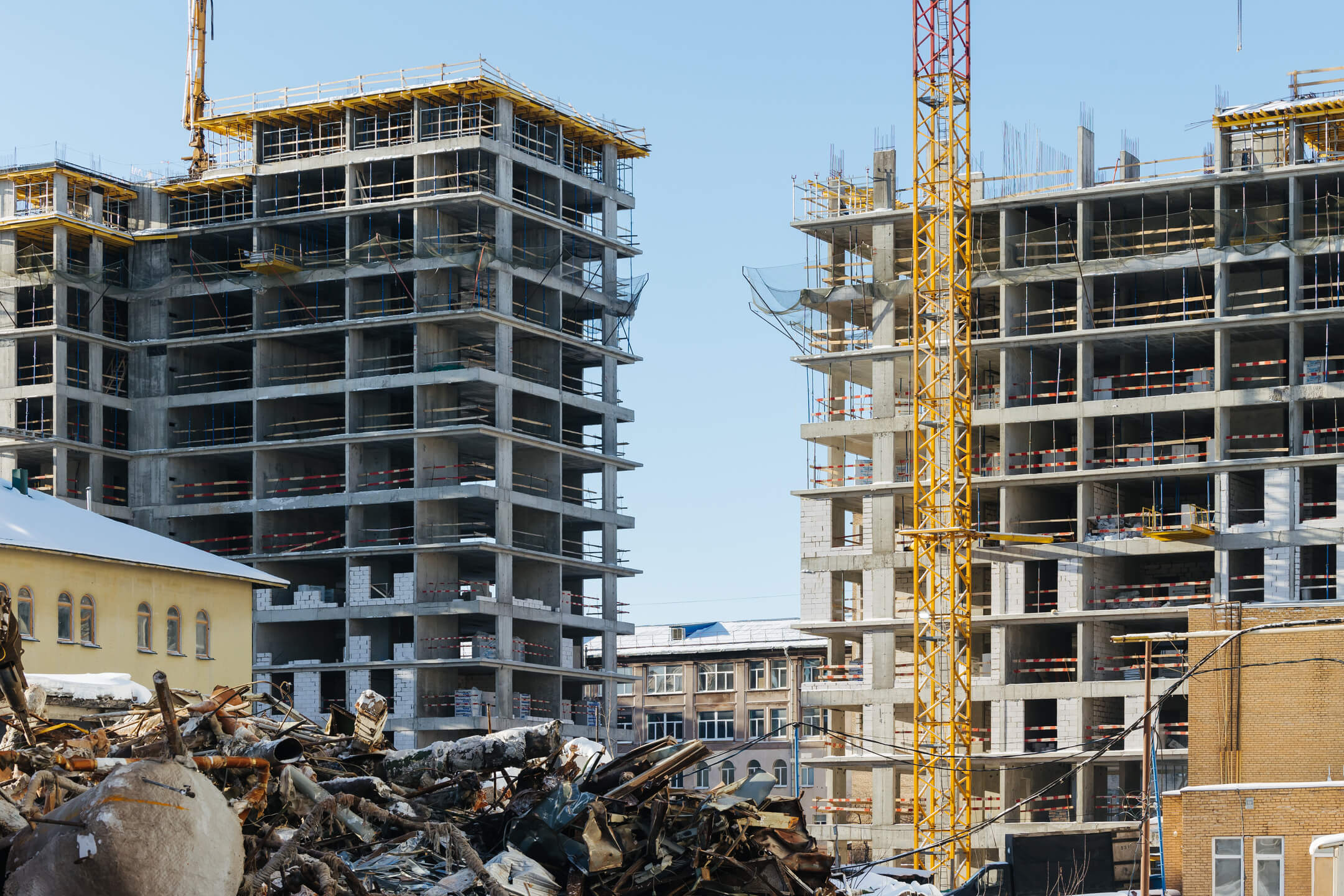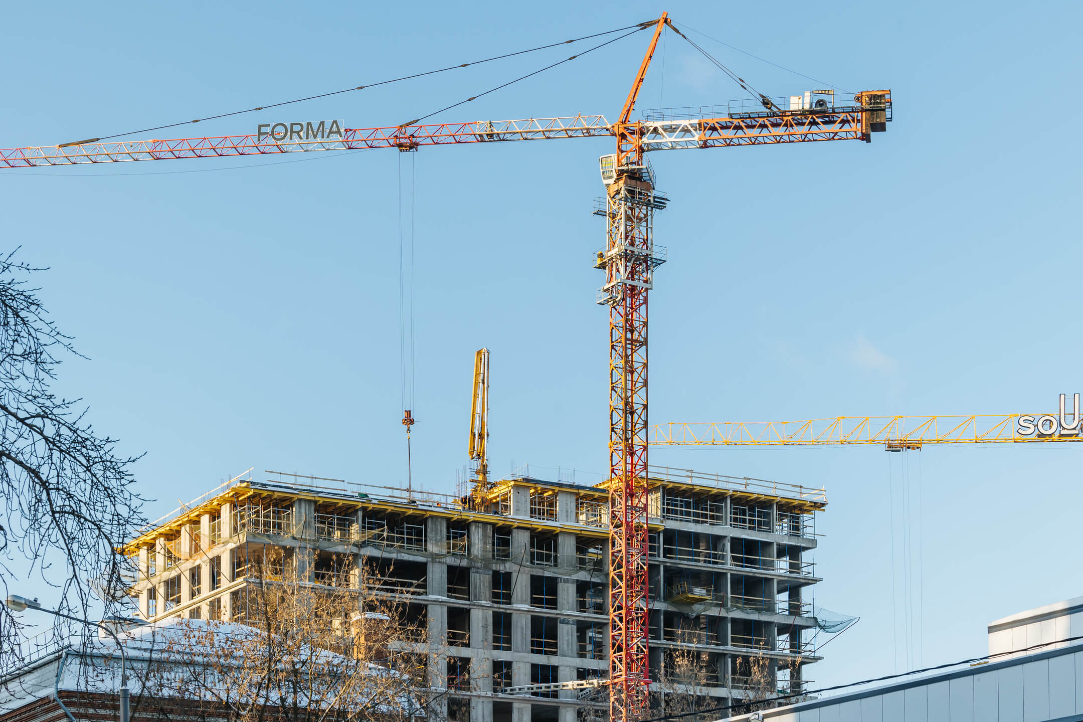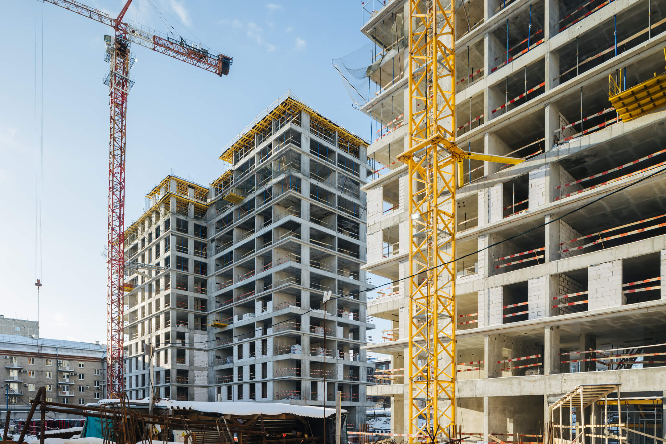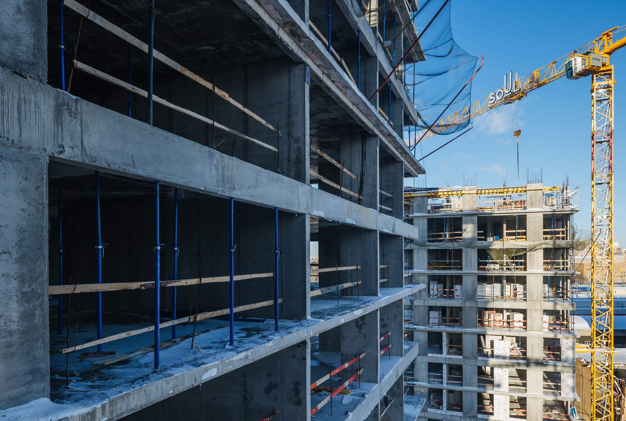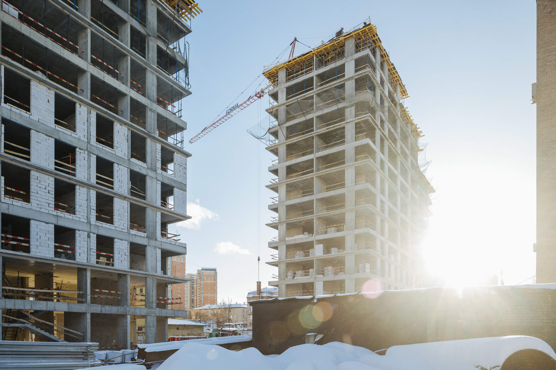 Этап 1.1 (корп. 1 и 2): ведутся работы по армированию/бетонированию плит перекрытия 11-13 этажей и вертикальных конструкций 12-14 этажей, а также кладочные работы на 2, 3, 4, 5, 6 этажах.