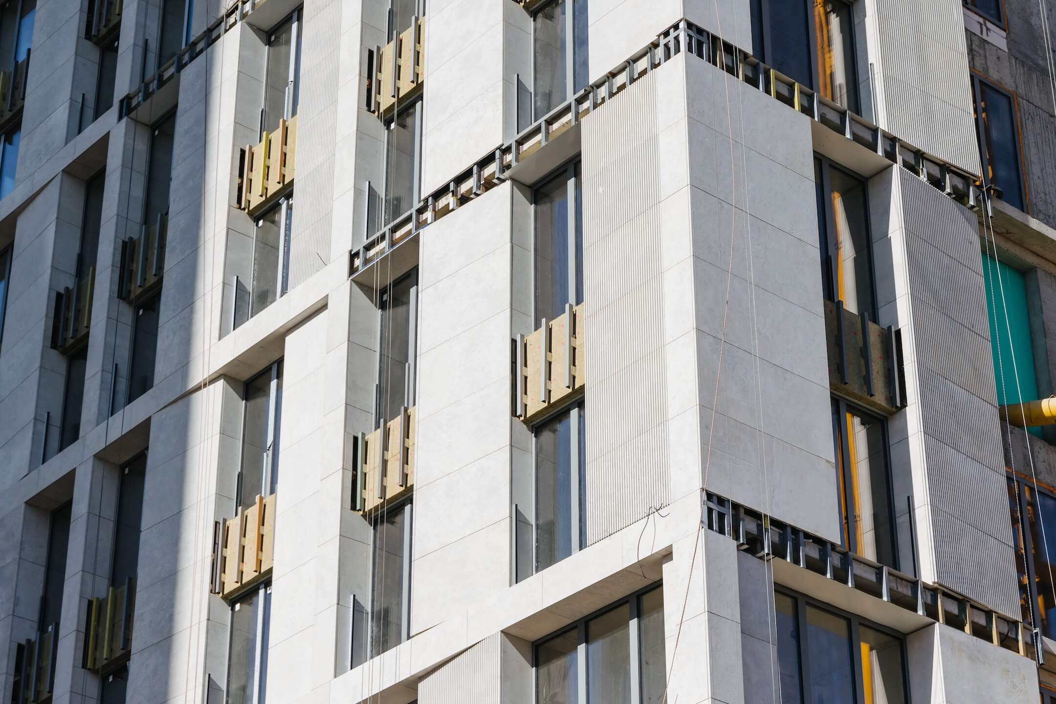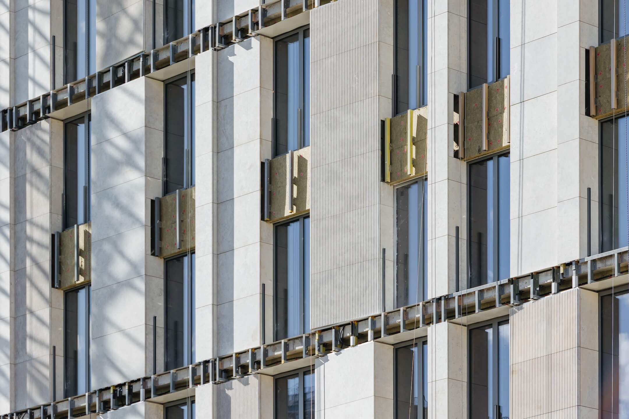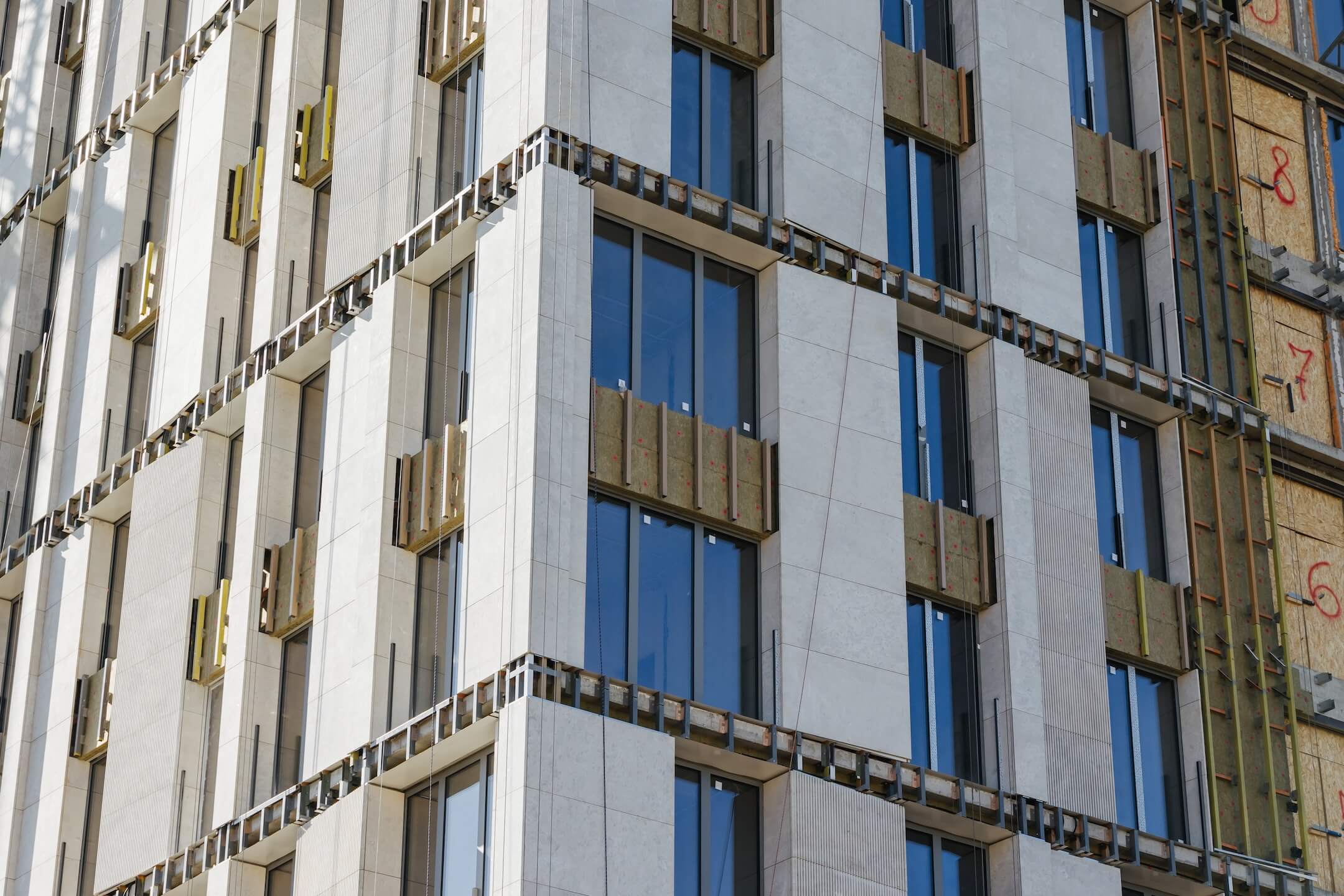 - Фасад. Монтаж минераловатного утеплителя. Монтаж подсистемы. Монтаж облицовки из натурального камня. Монтаж окон типовых этажей.