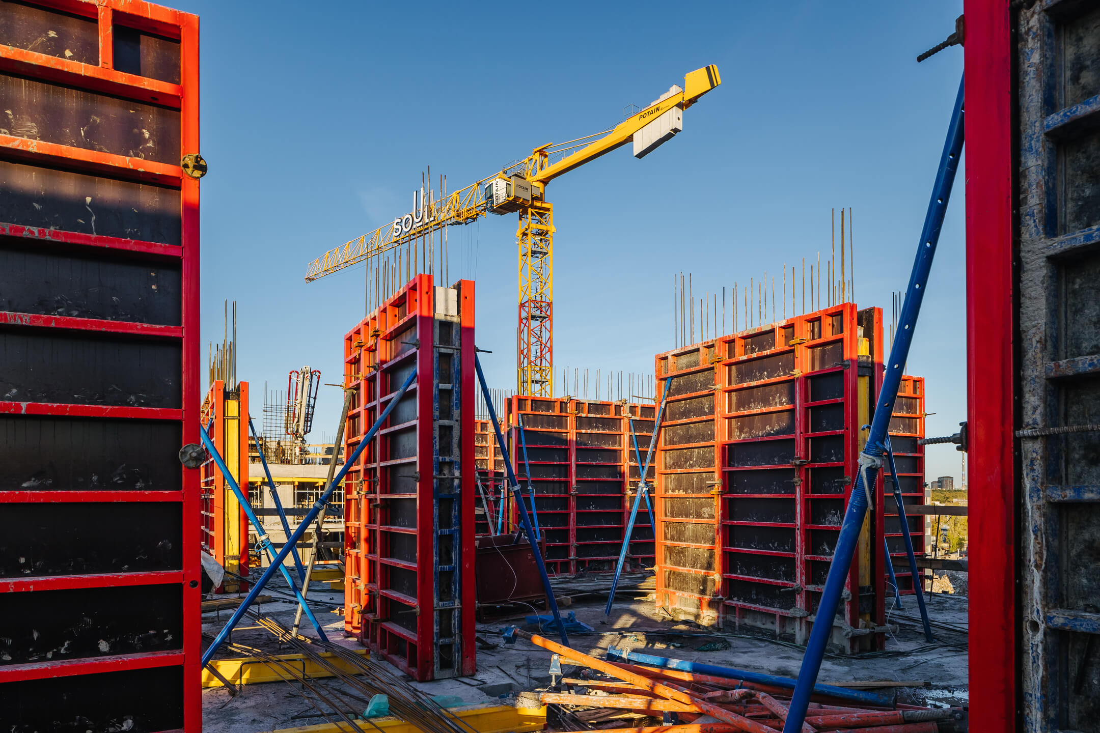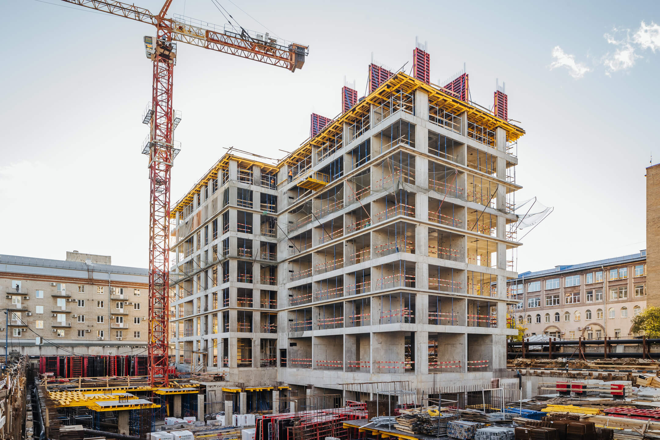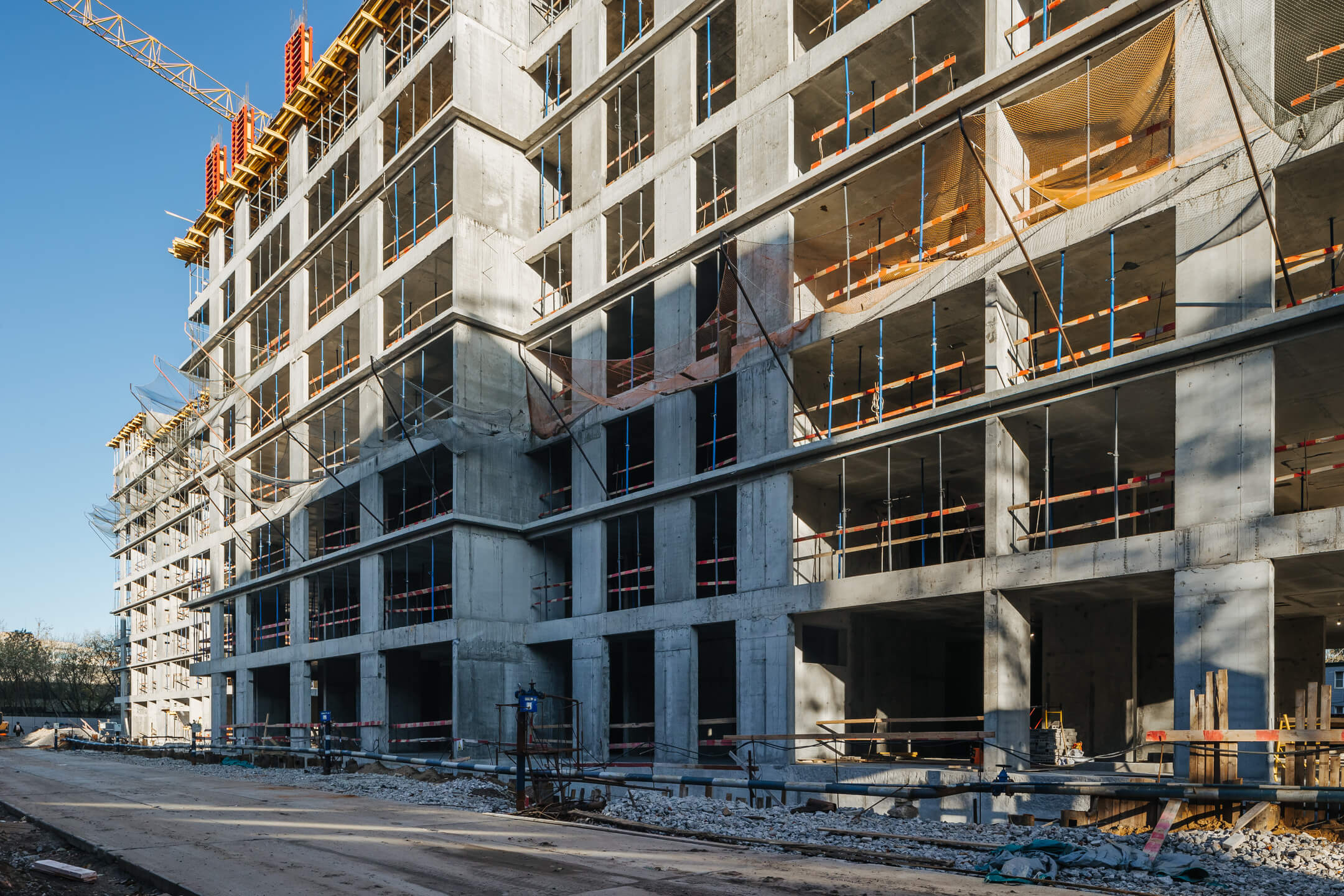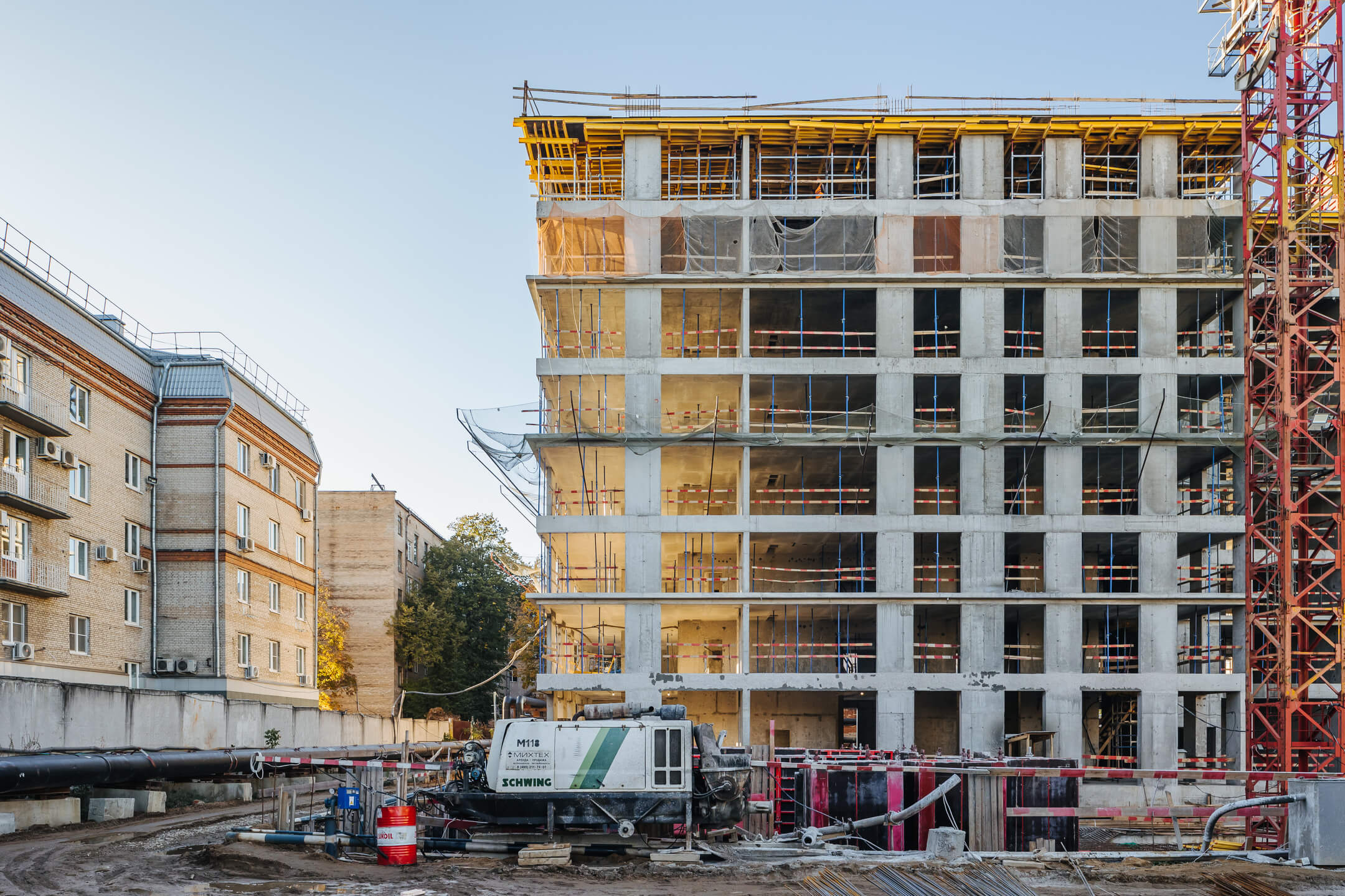 - Корпус 1: ведутся работы по армированию/бетонированию стен 9 этажей;