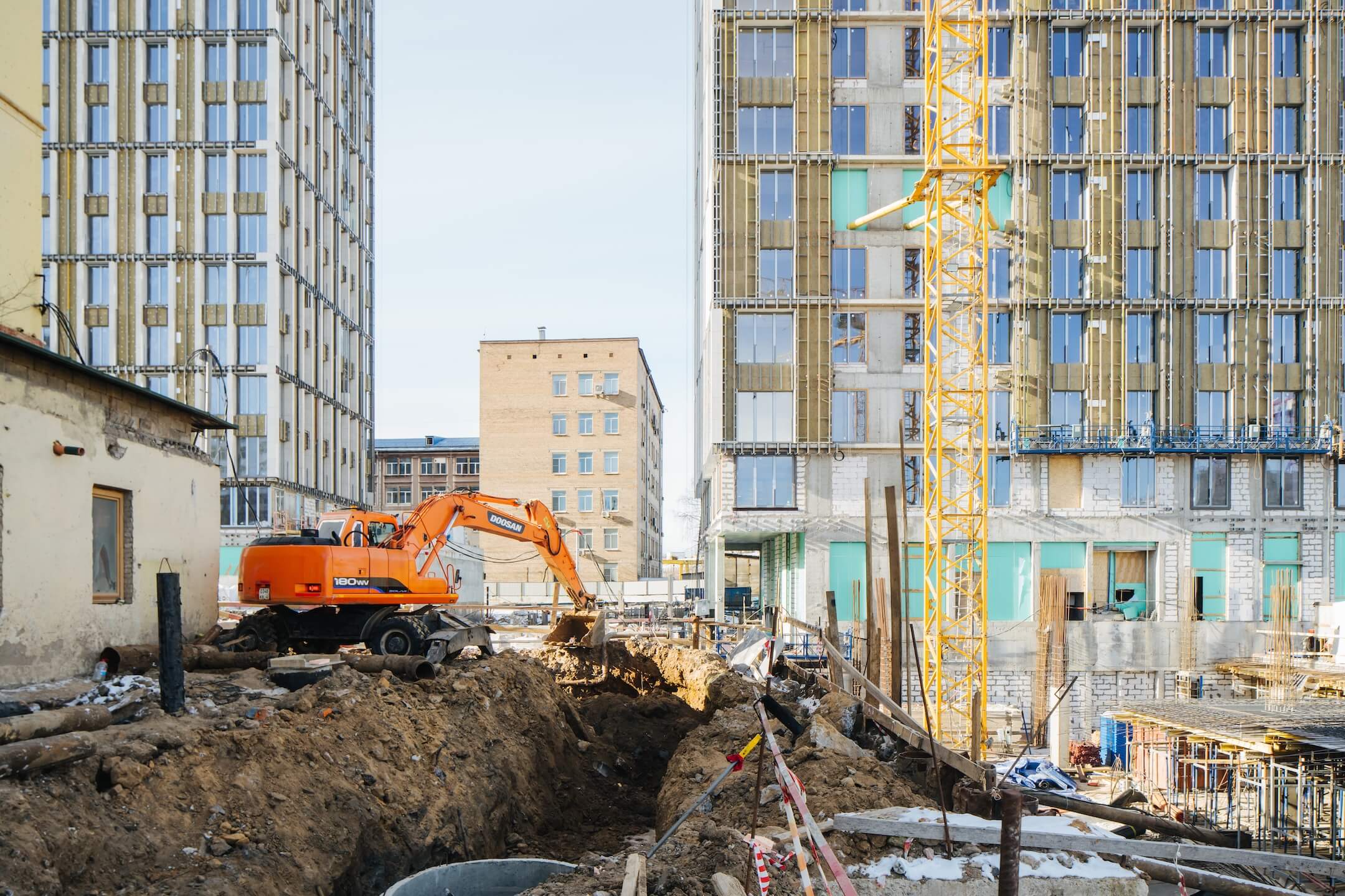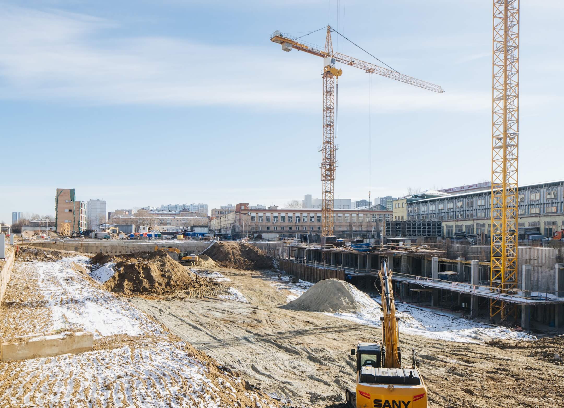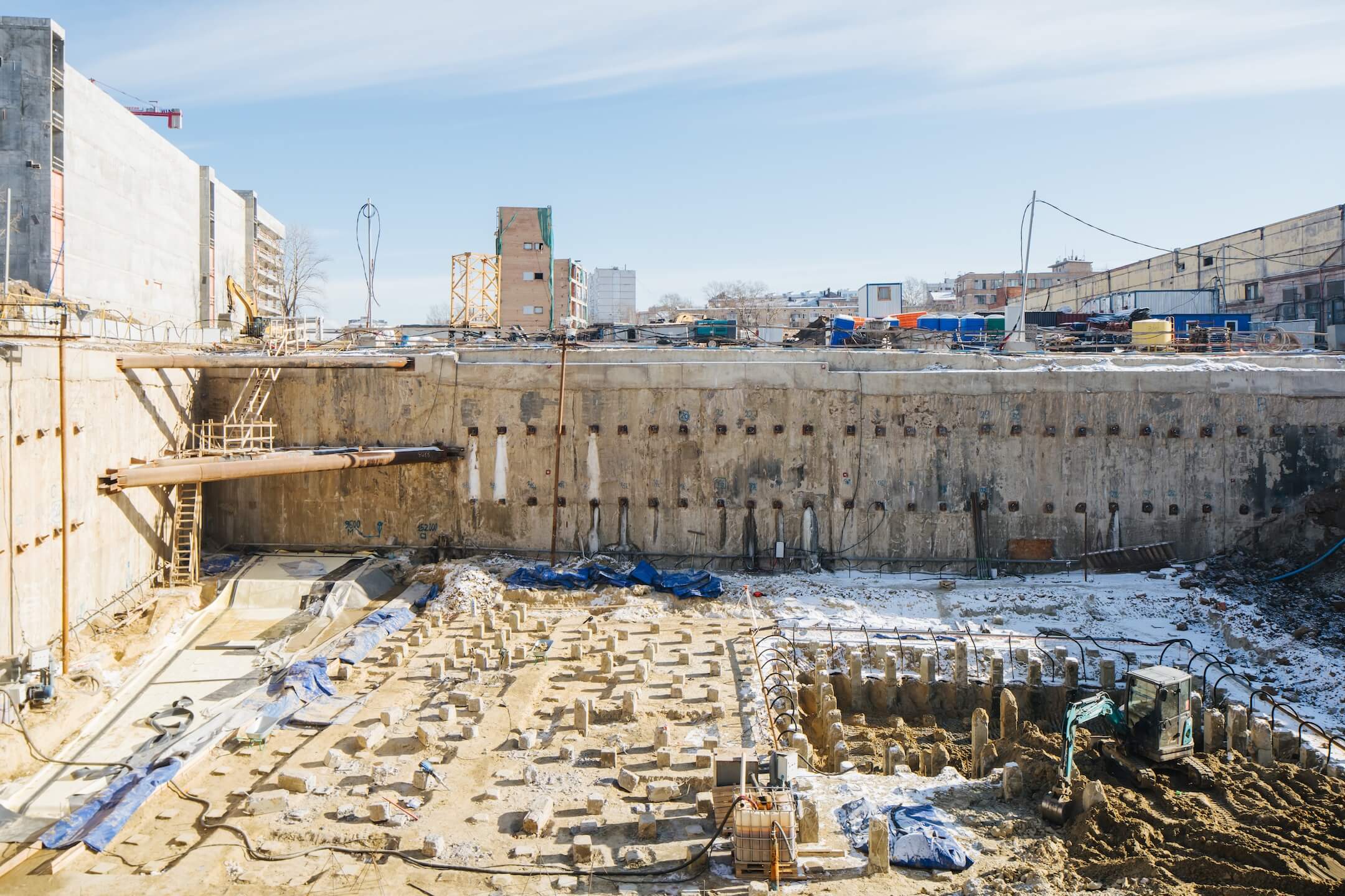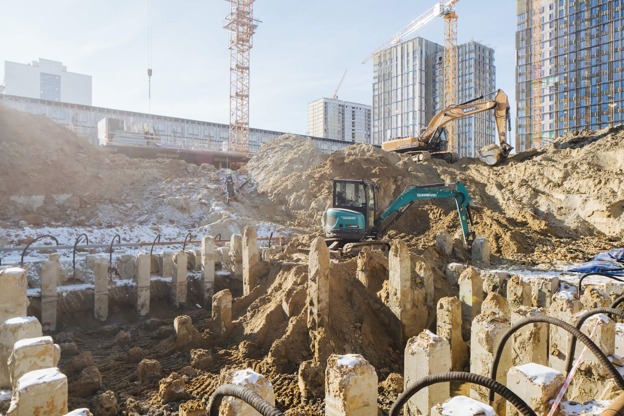 - Зона ДОУ. Разработка котлована. Устройство бетонной подготовки. Устройство пластового дренажа. Бетонирование фундаментной плиты. Бетонирование стен паркинга
