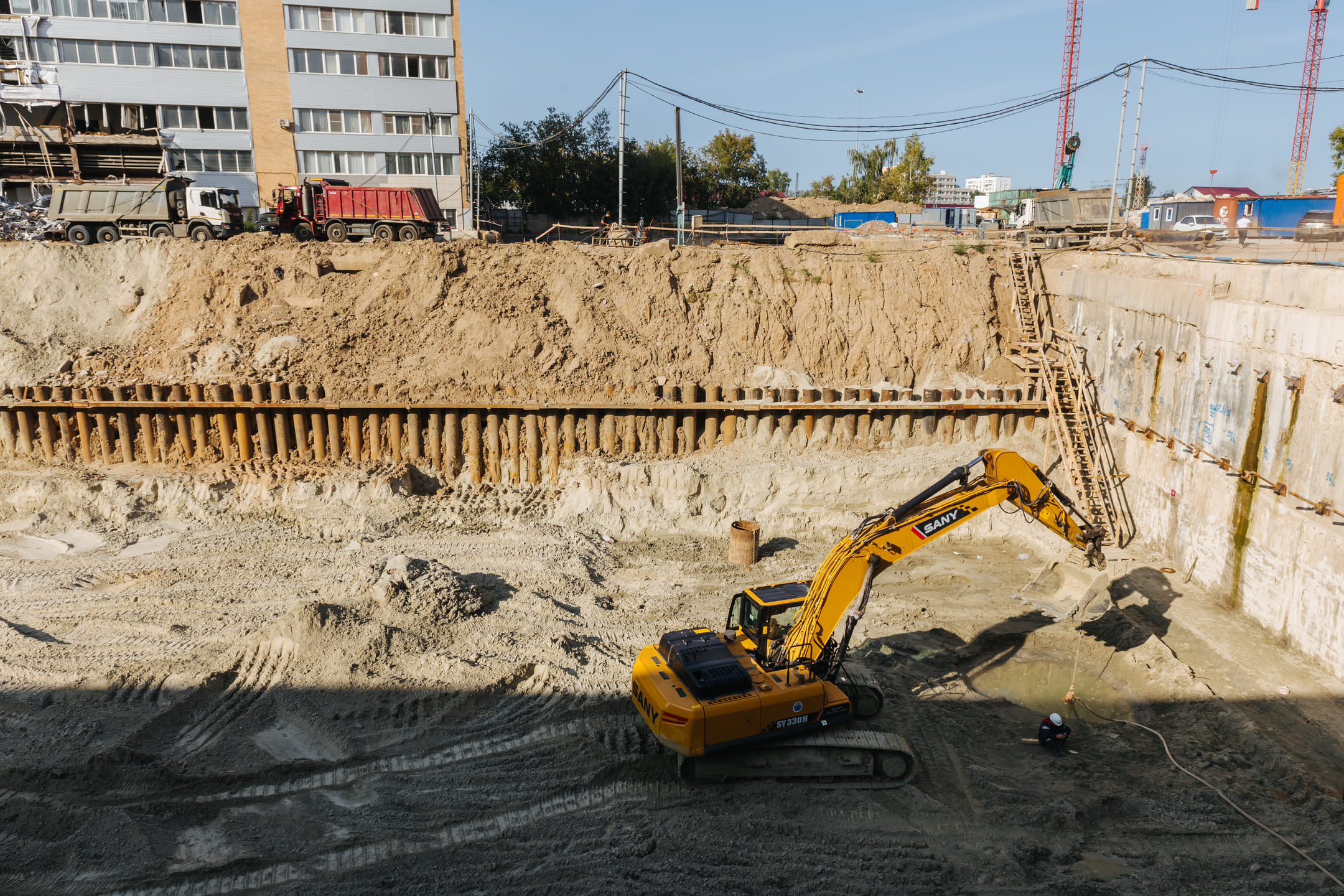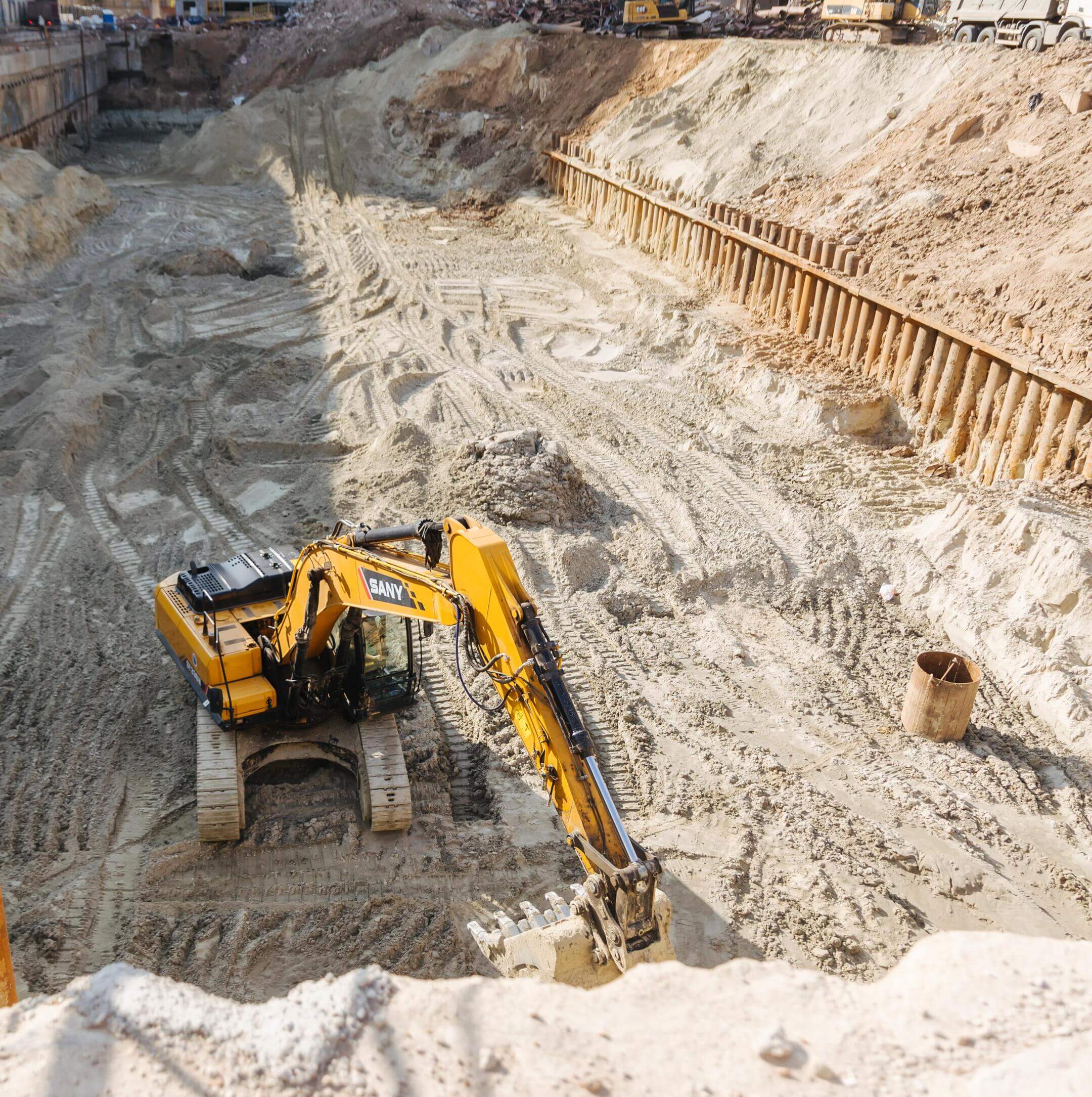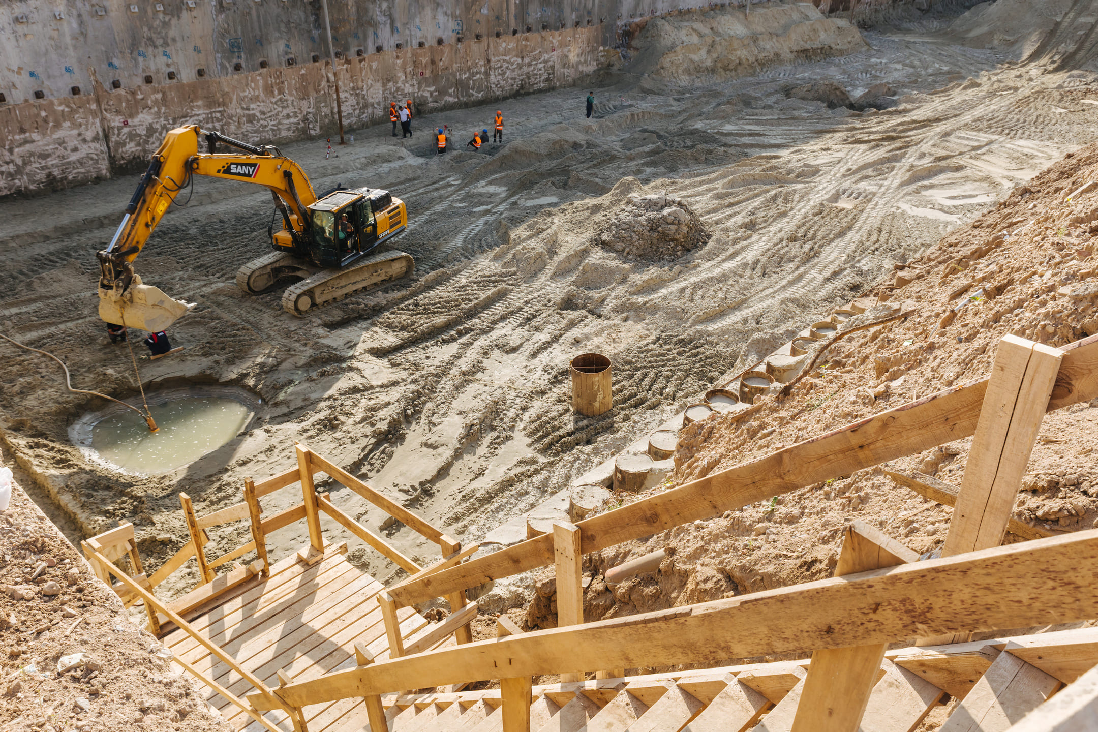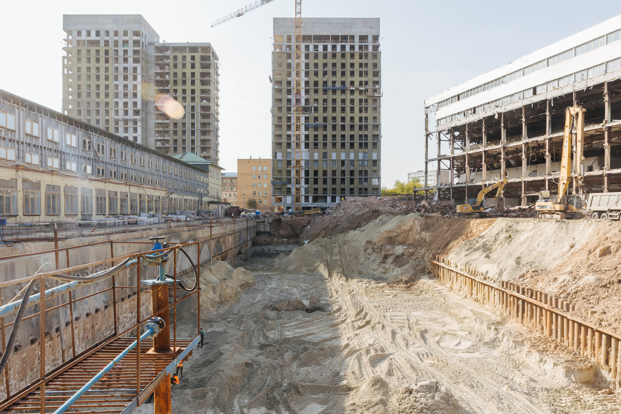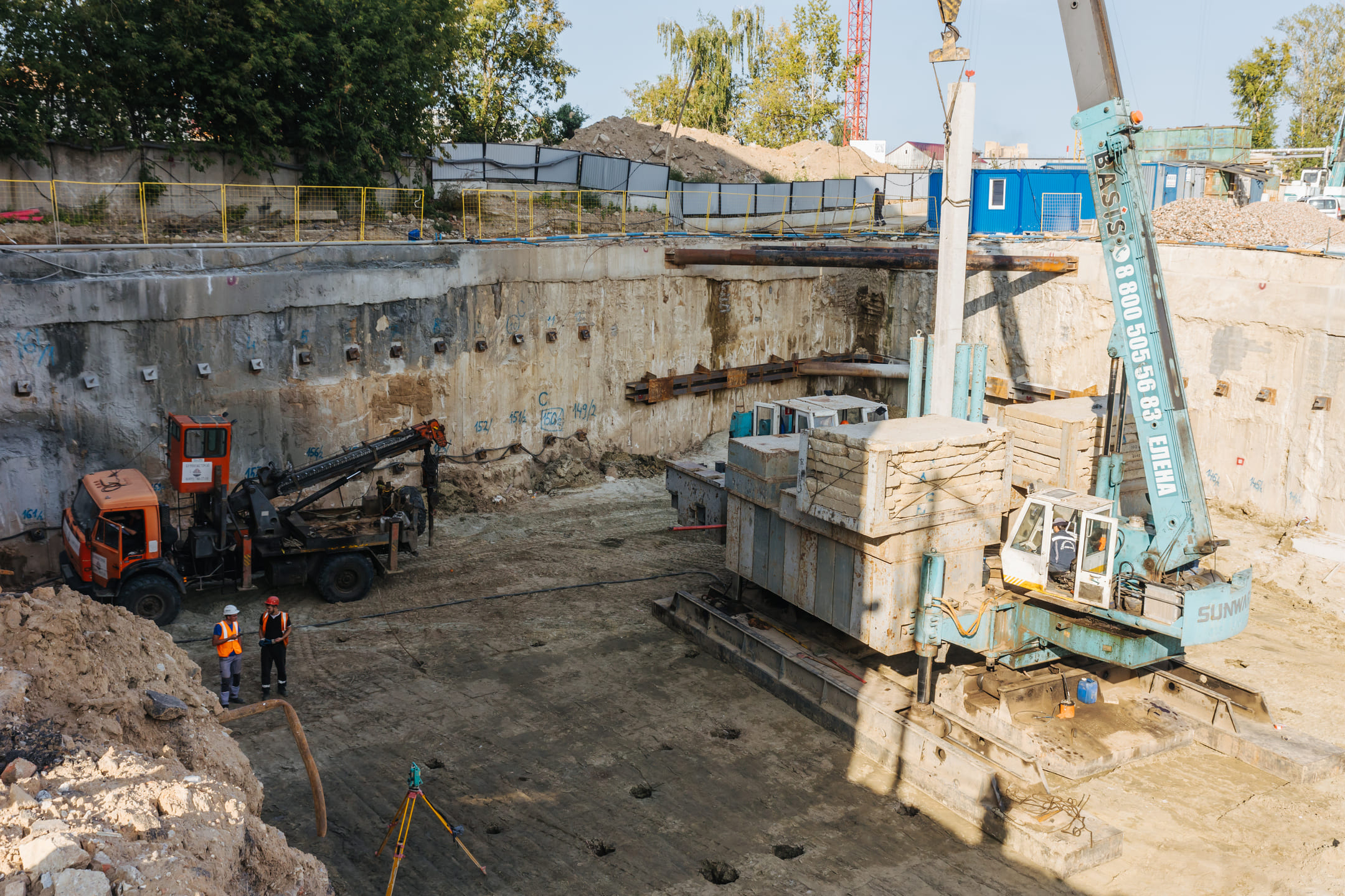 Этап 1.2: устройство свайного поля, шпунтового ограждения, распорной системы, грунтовых анкеров, водопонижения. Разработка котлована, снос зданий и сооружений. Устройство бетонной подготовки фундаментной плиты.