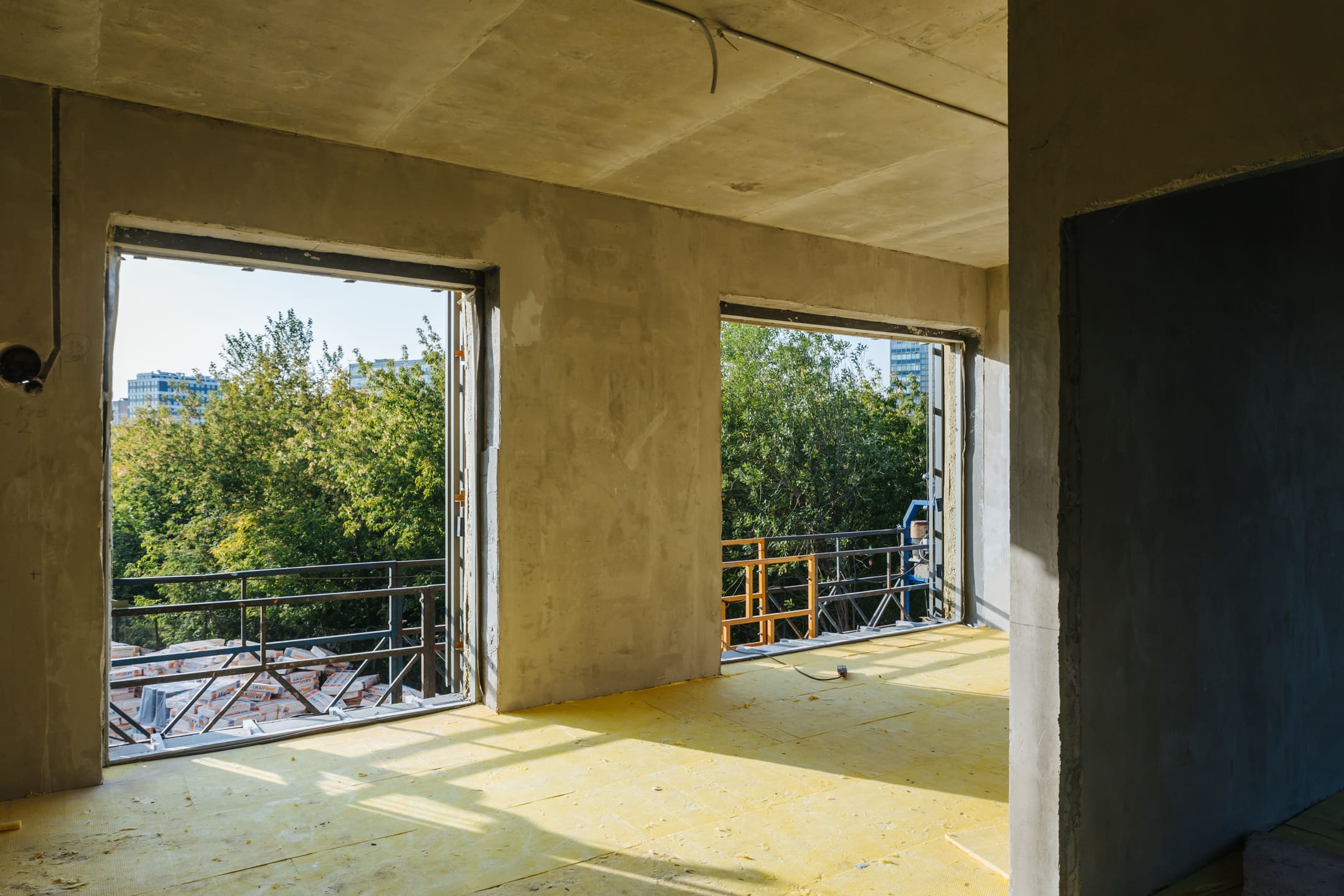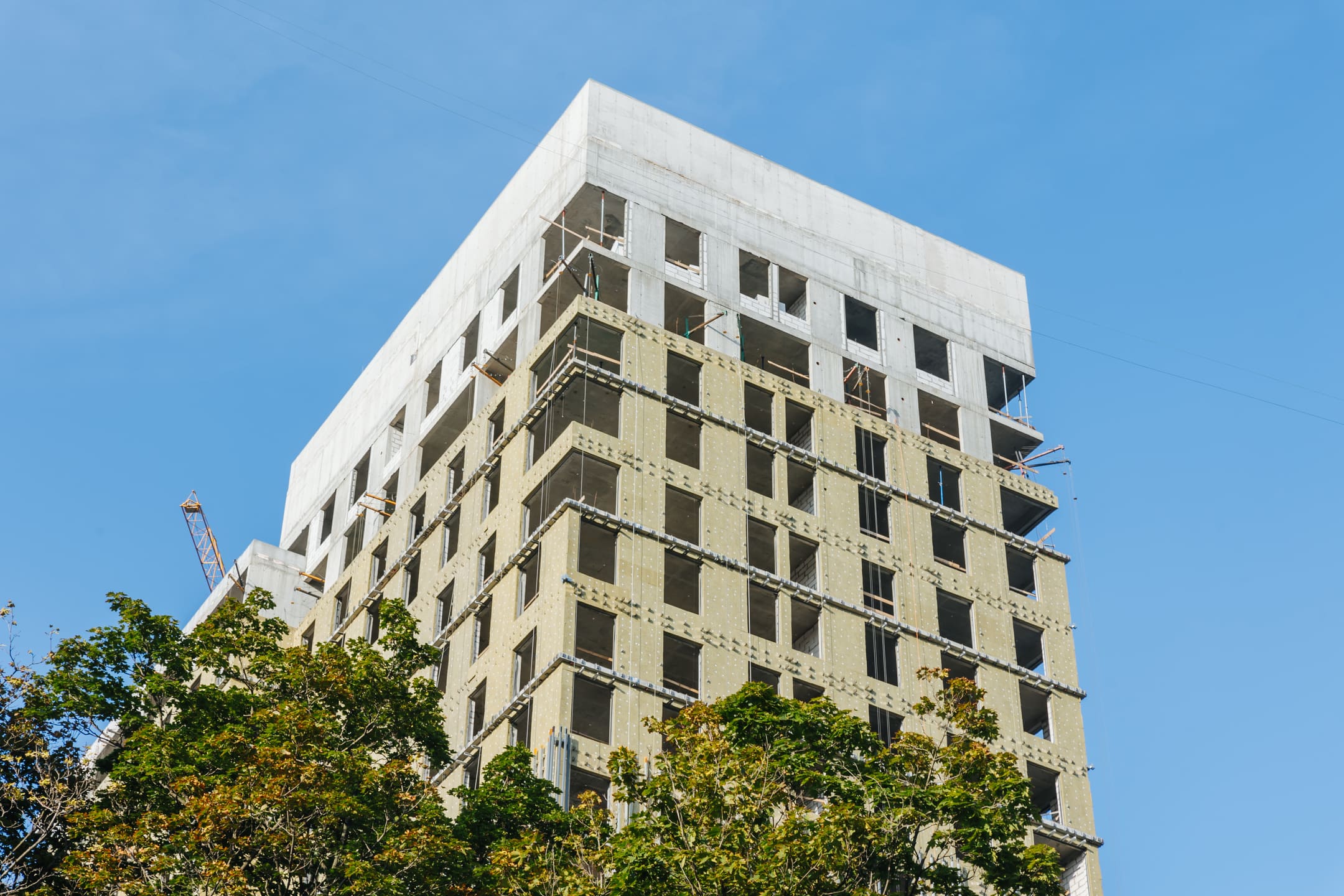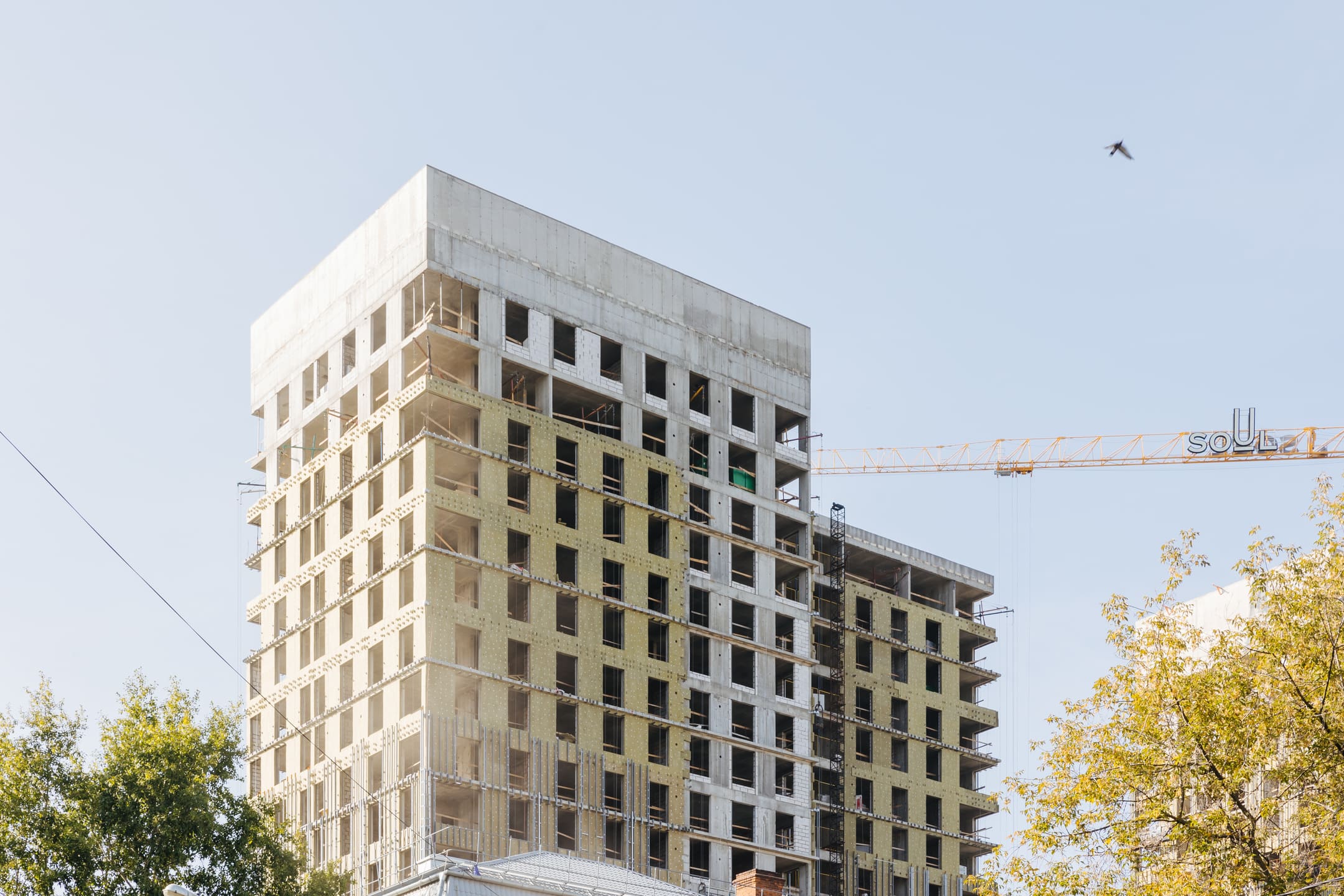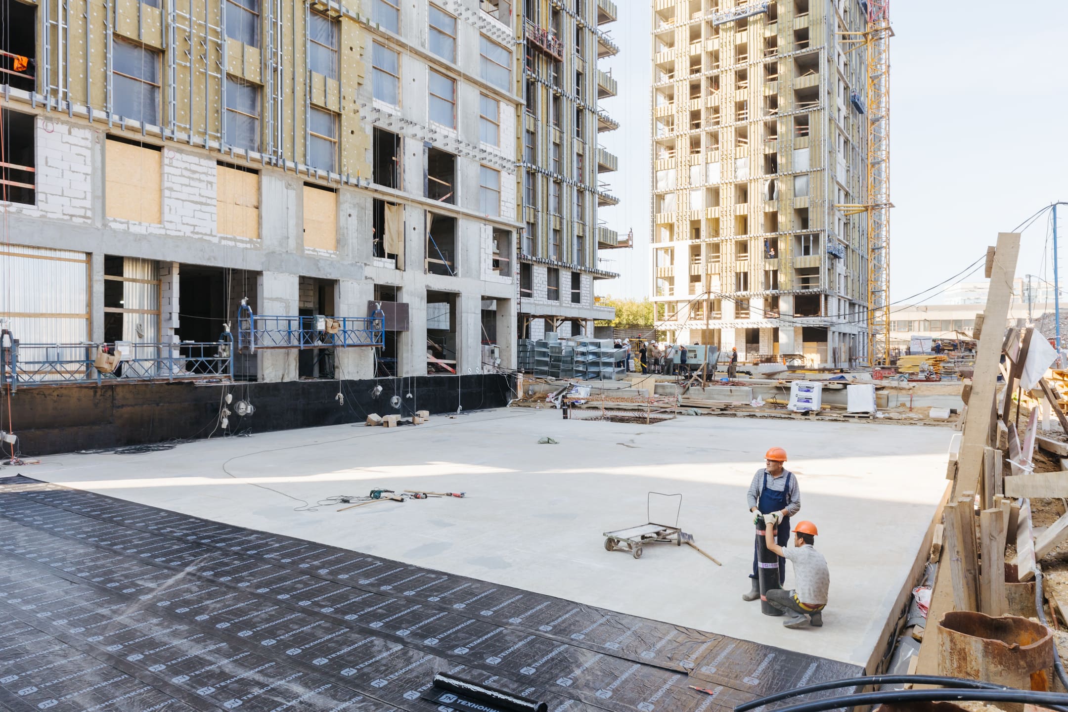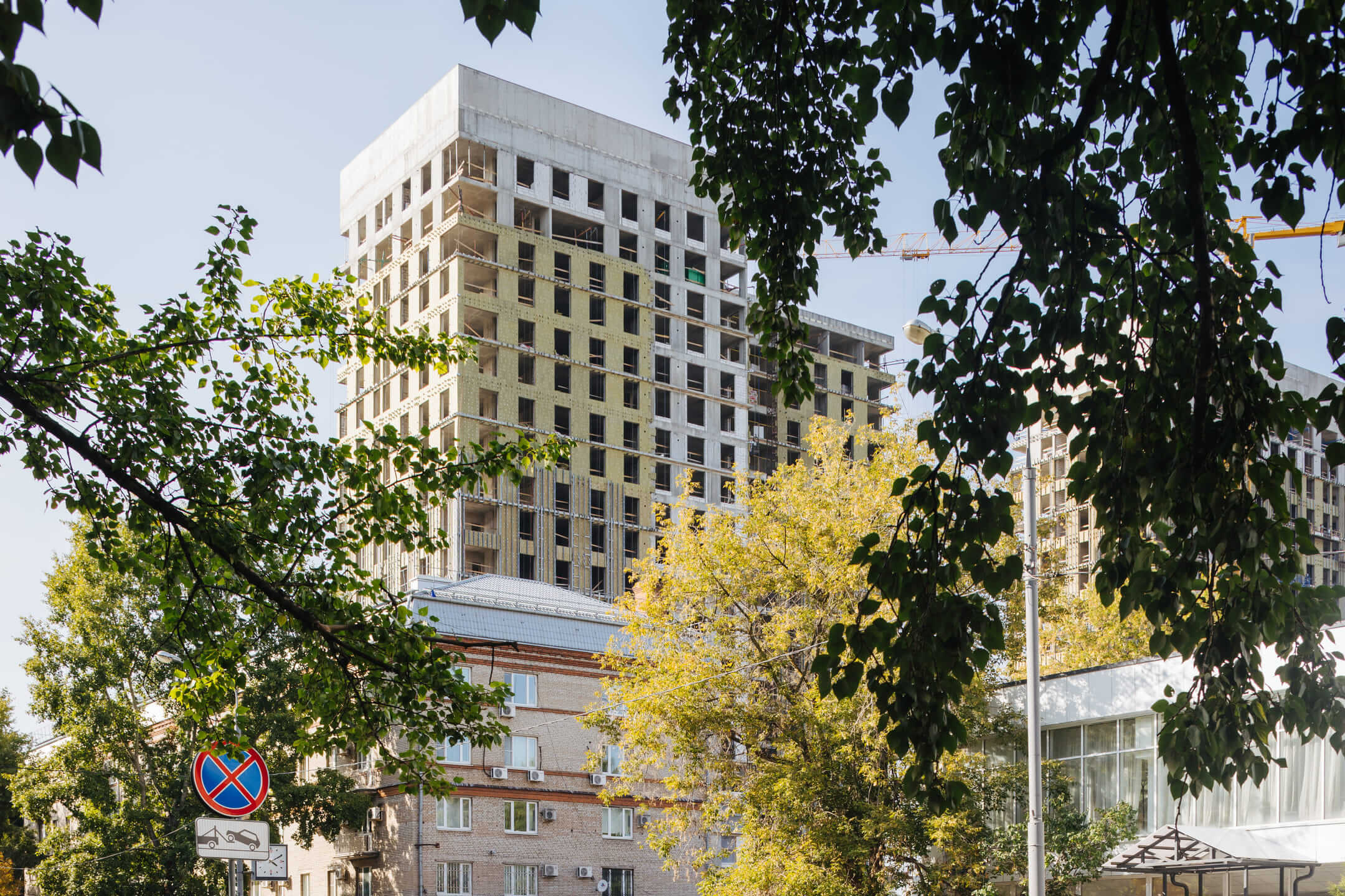 Этап 1.1 (паркинг): Армирование/бетонирование стен и покрытия паркинга и рампы. Гидроизоляция наружных стен и кровли стилобата. Устройство пристенного дренажа, прокладка наружных инженерных систем. Отсыпка пазух котлована, кладка стен и перегородок подземного этажа. Отделка технических помещений. Отделка кладовых. Отделка зоны паркинга. Продолжаются работы по устройству отопления, вентиляции, противопожарного водопровода в рамках внутренних инженерных систем.