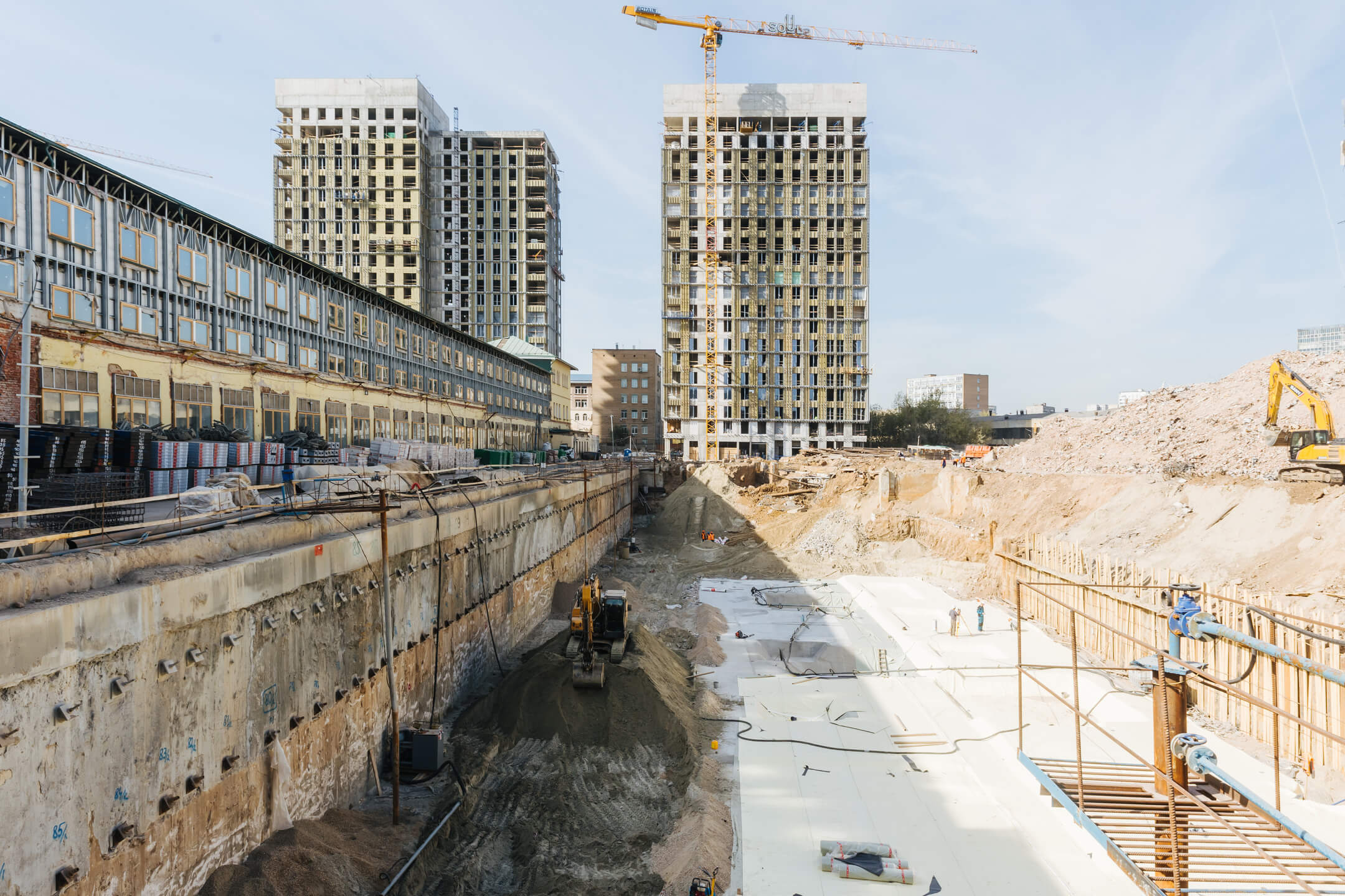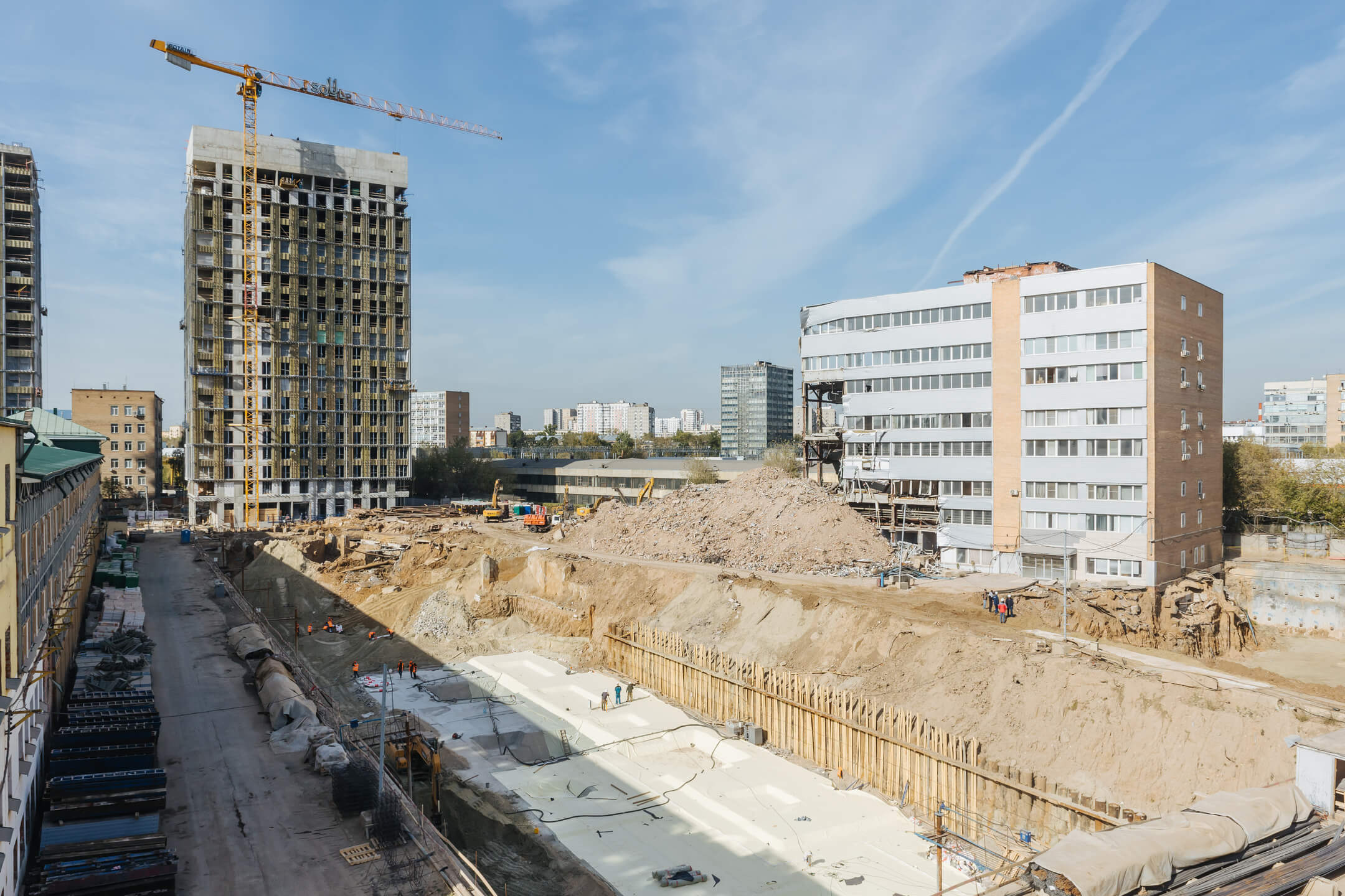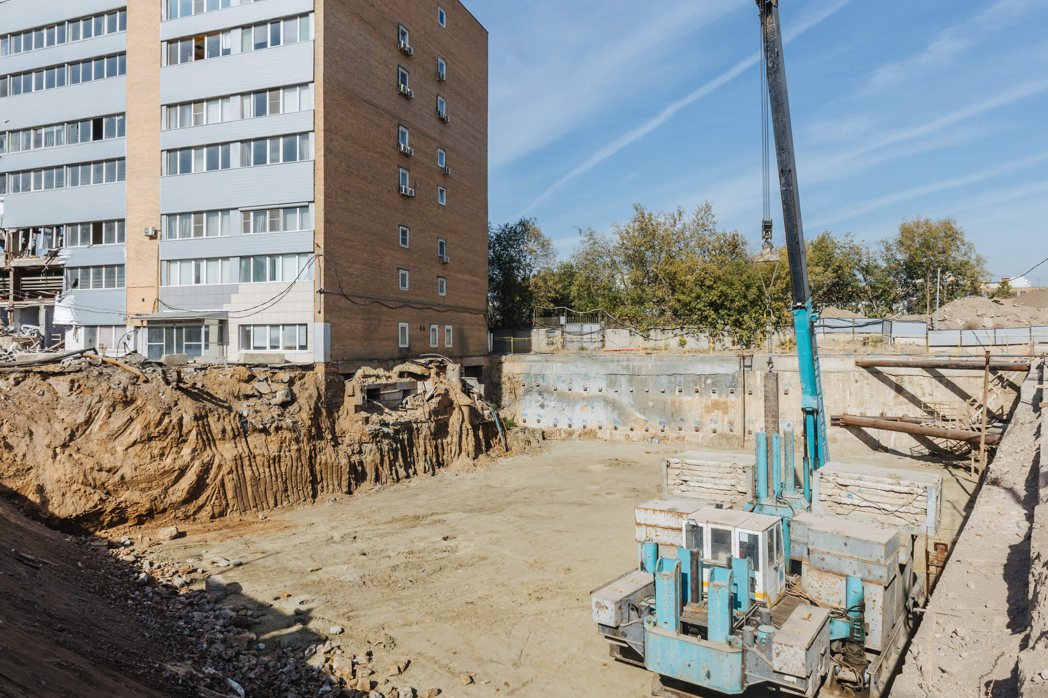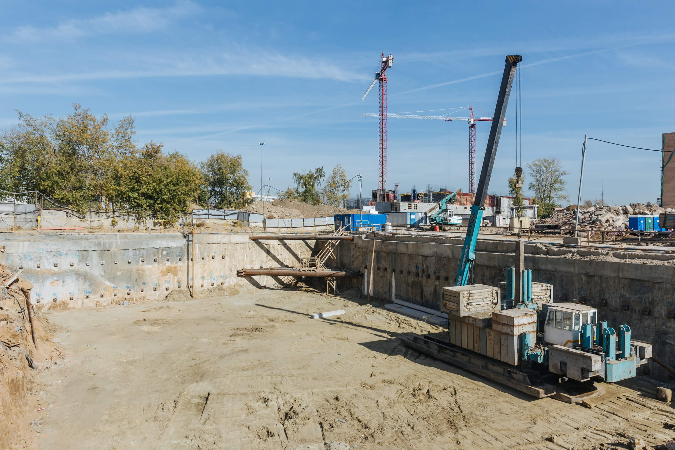 Этап 1.2. Устройство свайного поля. Устройство шпунтового ограждения; устройство распорной системы и грунтовых анкеров. Устройство водопонижения. Разработка котлована. Снос зданий и сооружений. Устройство бетонной подготовки фундаментной плиты. Устройство гидроизоляции и пластового дренажа.