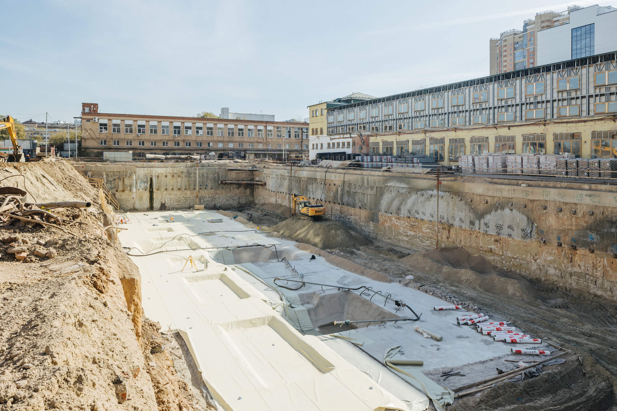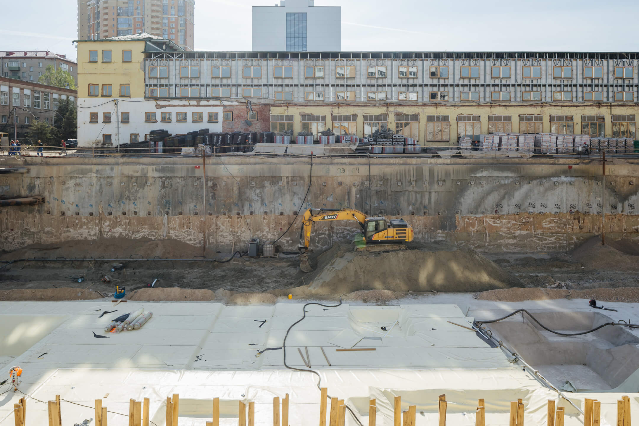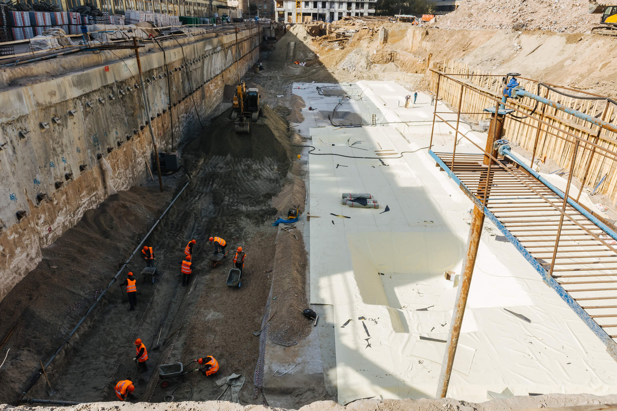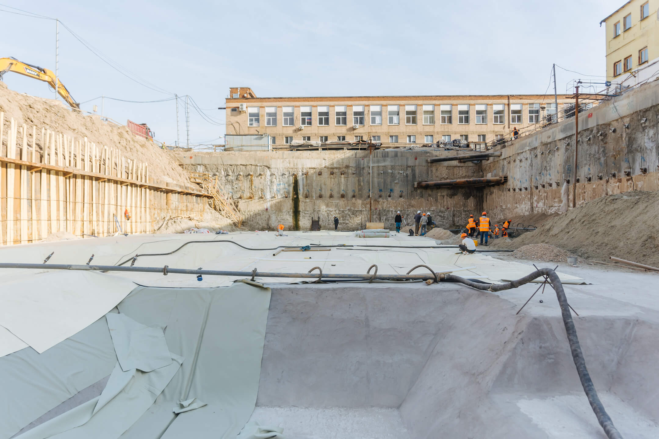 Этап 1.2. Устройство свайного поля. Устройство шпунтового ограждения; устройство распорной системы и грунтовых анкеров. Устройство водопонижения. Разработка котлована. Снос зданий и сооружений. Устройство бетонной подготовки фундаментной плиты. Устройство гидроизоляции и пластового дренажа.