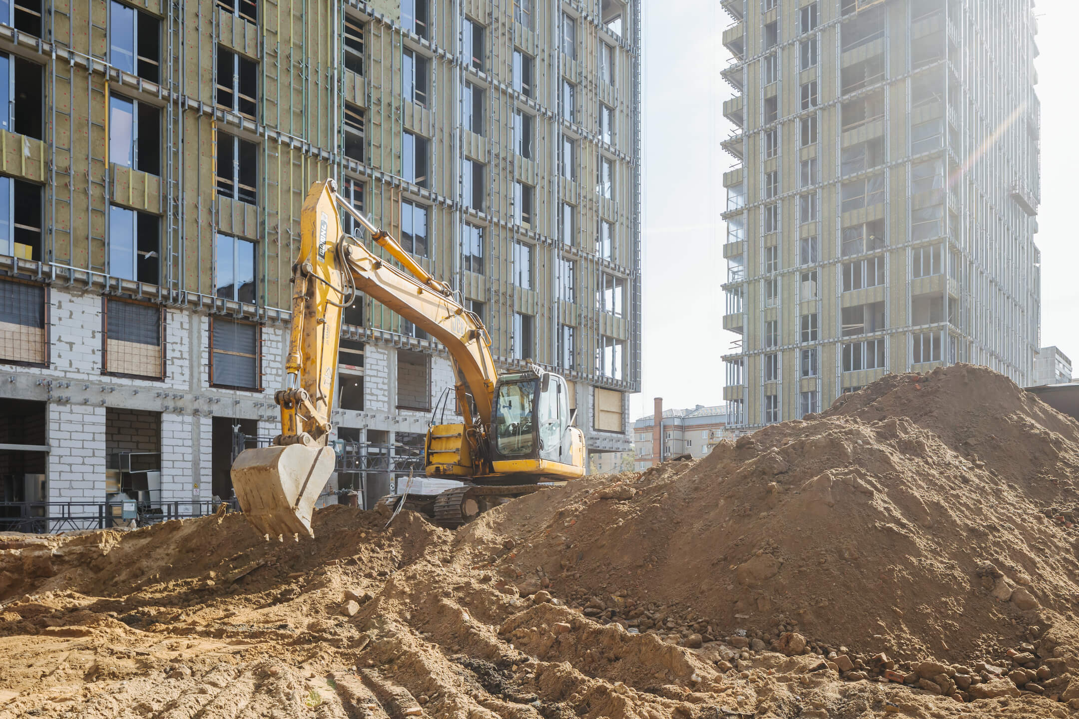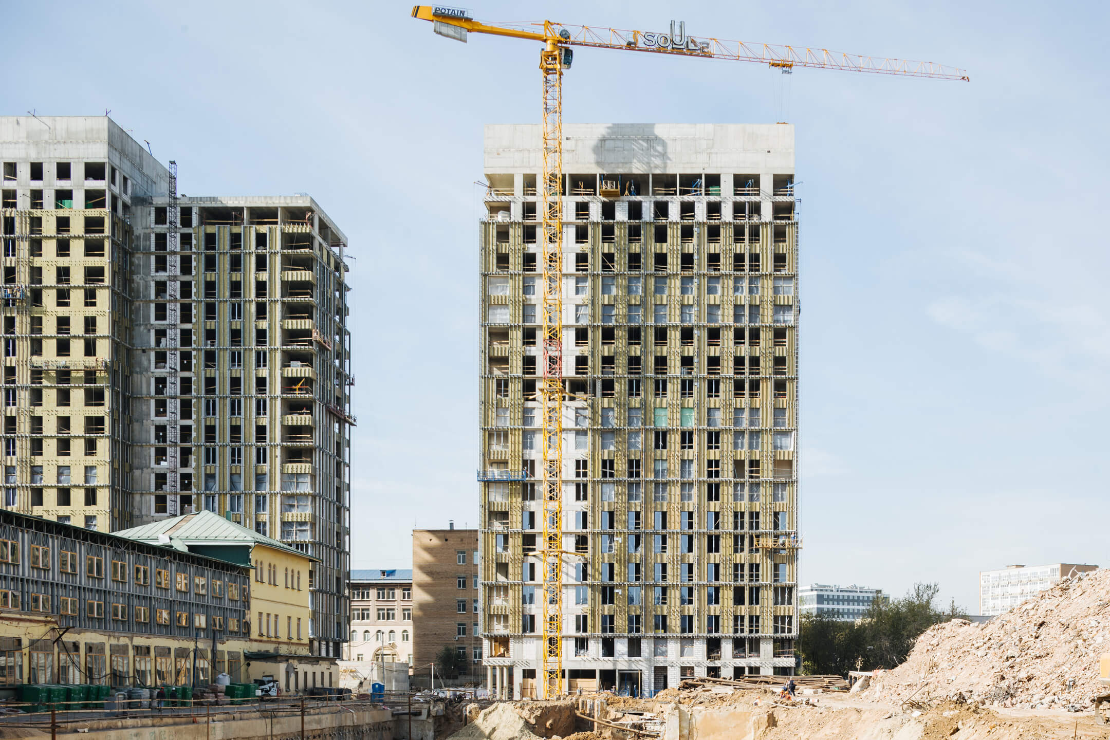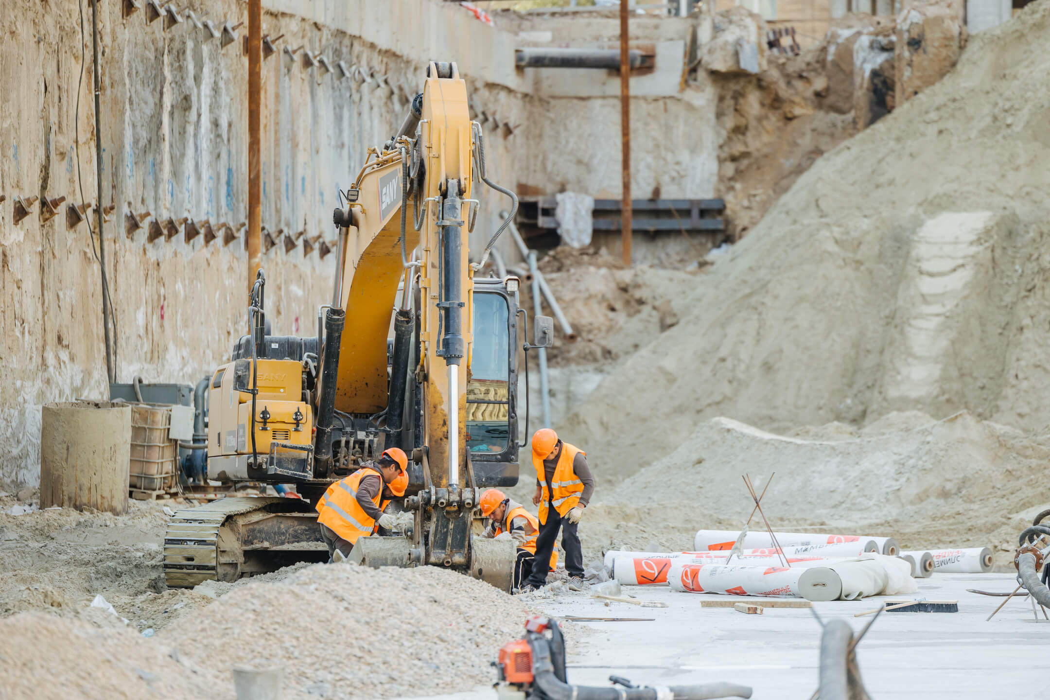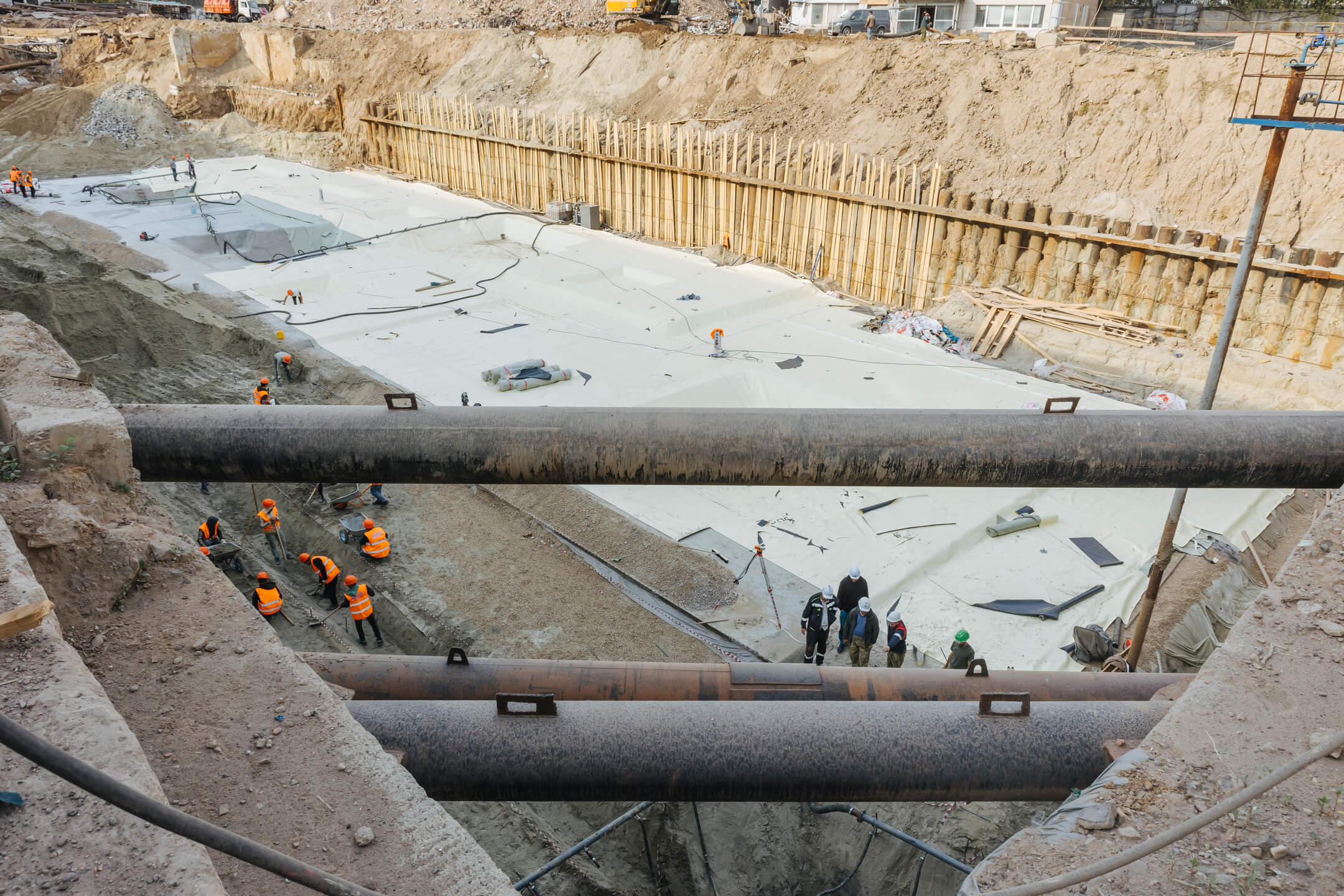 Этап 1.2. Устройство свайного поля. Устройство шпунтового ограждения; устройство распорной системы и грунтовых анкеров. Устройство водопонижения. Разработка котлована. Снос зданий и сооружений. Устройство бетонной подготовки фундаментной плиты. Устройство гидроизоляции и пластового дренажа.