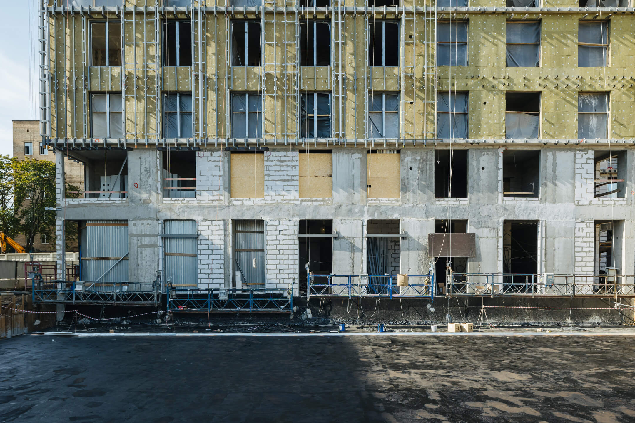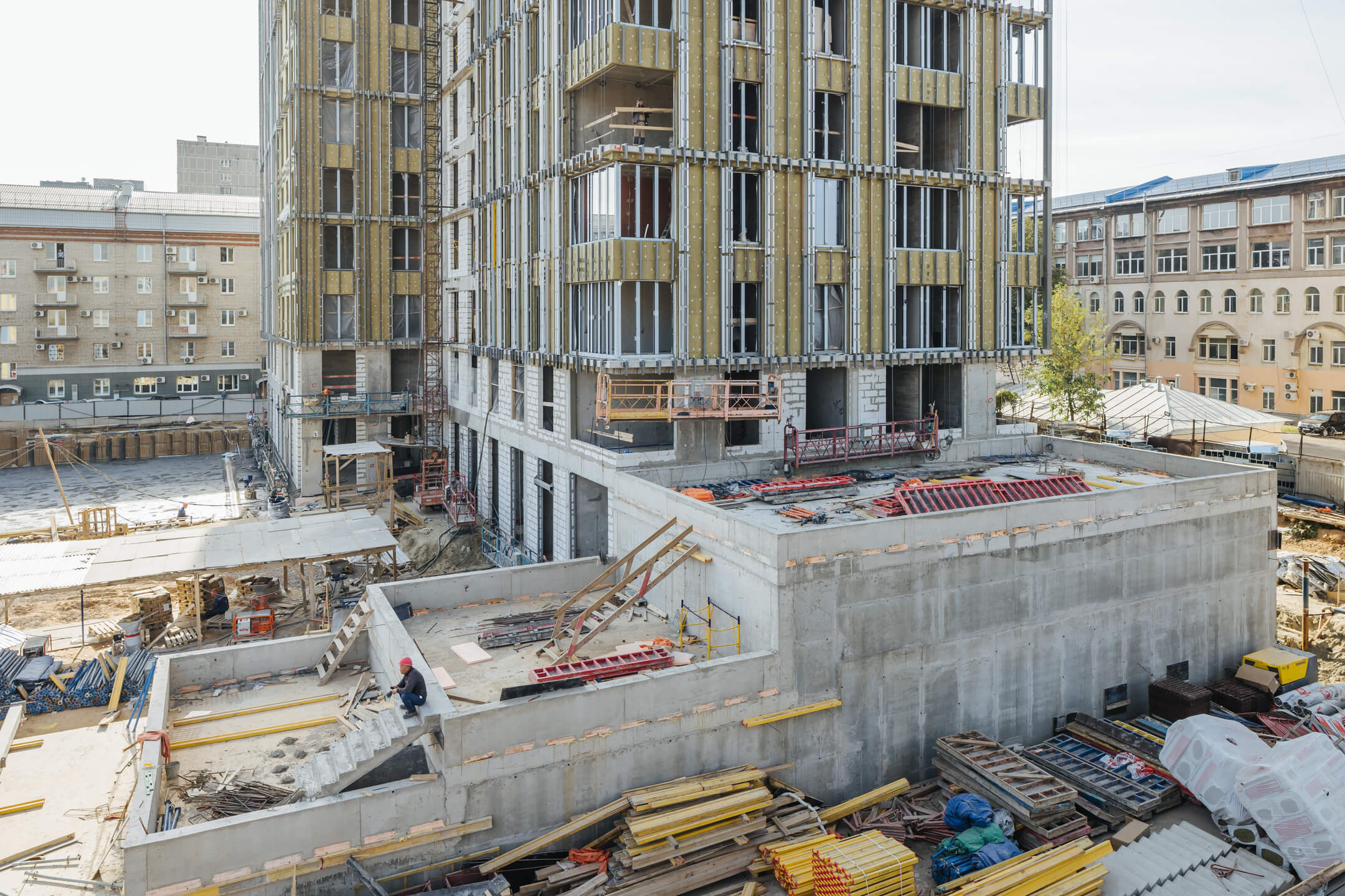 Этап 1.1 (паркинг). Бетонирование рампы завершено. Гидроизоляция наружных стен и кровли стилобата. Устройство пристенного дренажа. Прокладка наружных инженерных систем. Отсыпка пазух котлована. Кладка стен и перегородок подземного этажа. Отделка технических помещений. Отделка кладовых. Отделка зоны паркинга. ВИС: старт работ по отоплению, вентиляции, противопожарному водопроводу
