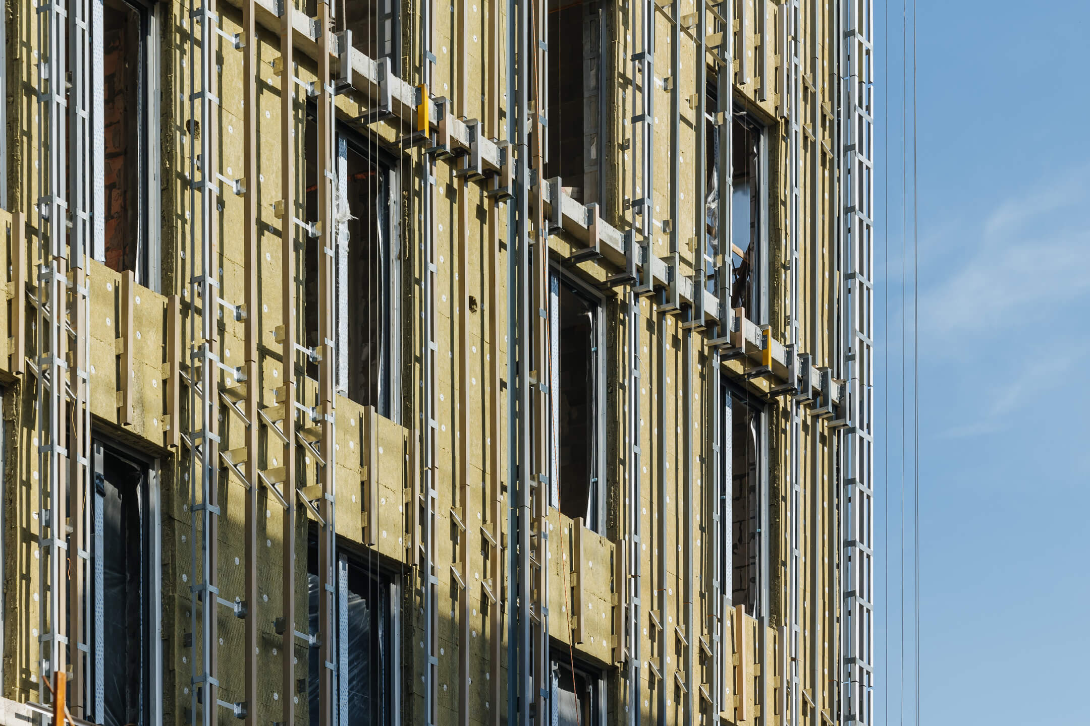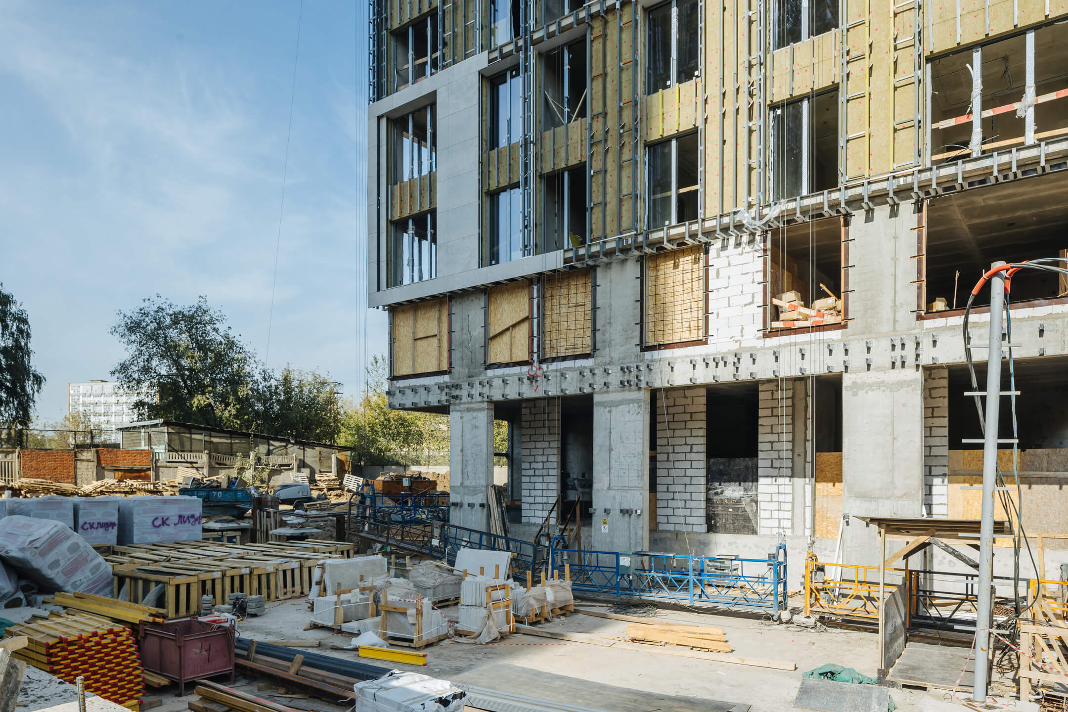 Этап 1.1 (корпус 2). Лестничные марши смонтированы. Внутренние каменные работы завершены. Ведутся отделочные работы на 3-12 этажах. Фасад: монтаж противопожарной отсечки, монтаж минераловатного утеплителя, монтаж подсистемы, монтаж облицовки из натурального камня, монтаж окон типовых этажей. ВИС: ведутся работ по отоплению, вентиляции, противопожарному водопроводу, ведутся электромонтажные работы.