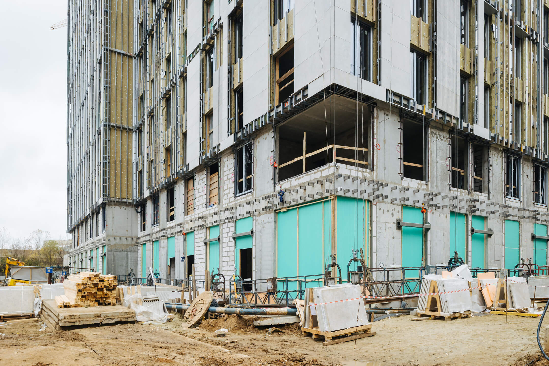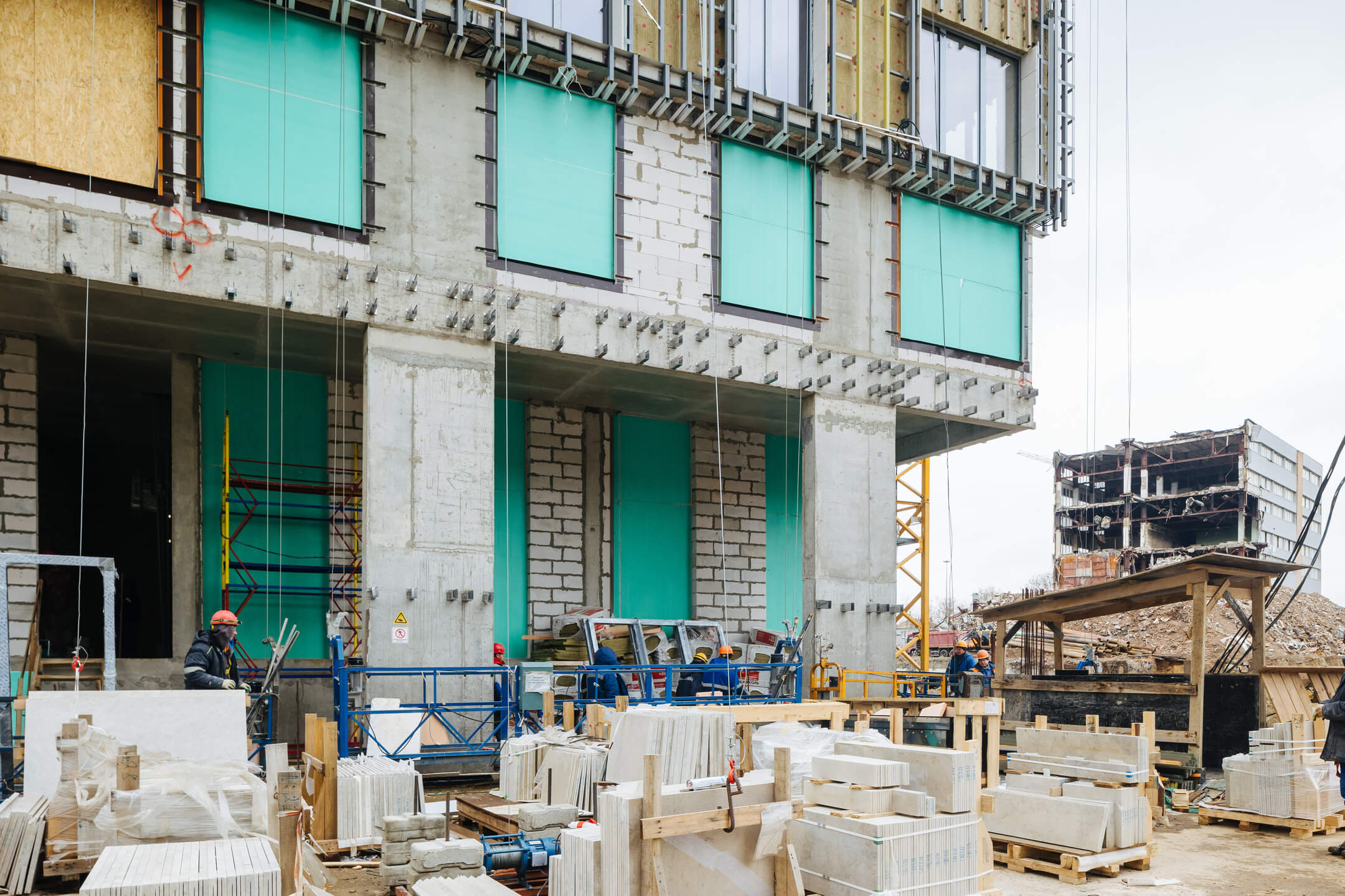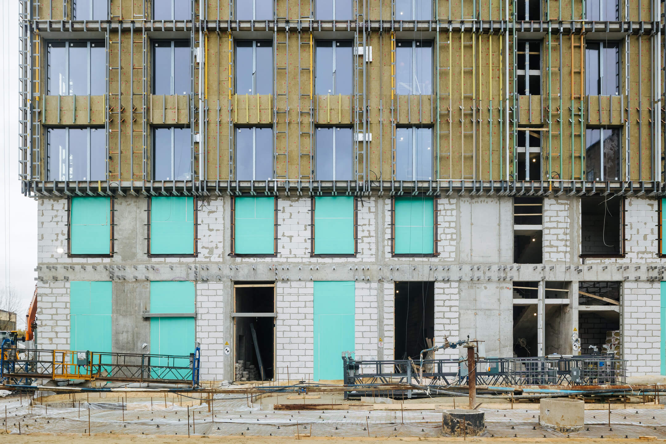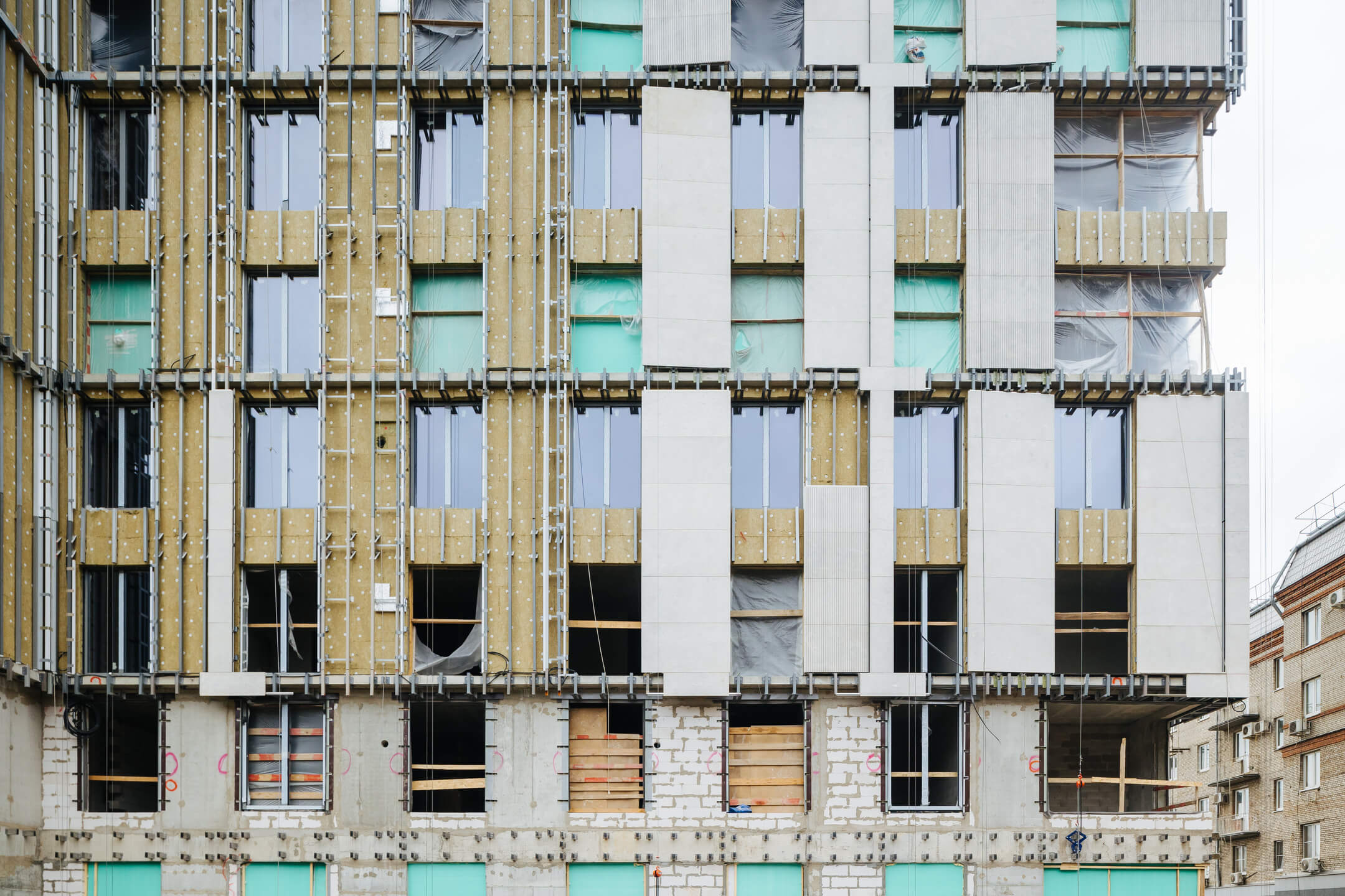- Фасад. Монтаж минераловатного утеплителя. Монтаж подсистемы. Монтаж облицовки из натурального камня. Монтаж окон типовых этажей