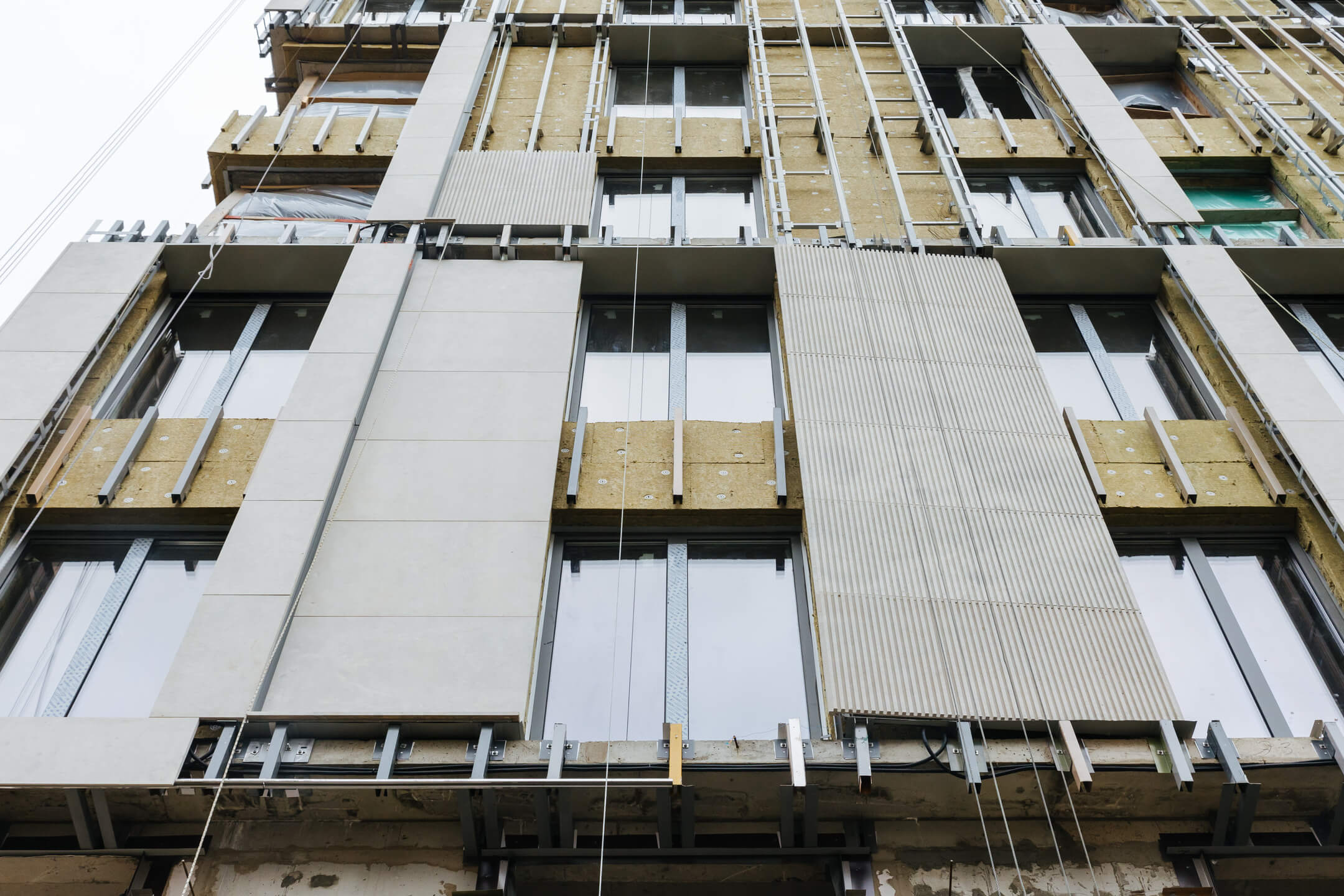 - Фасад. Монтаж противопожарной отсечки. Монтаж минераловатного утеплителя. Монтаж подсистемы. Монтаж облицовки из натурального камня. Монтаж окон типовых этажей