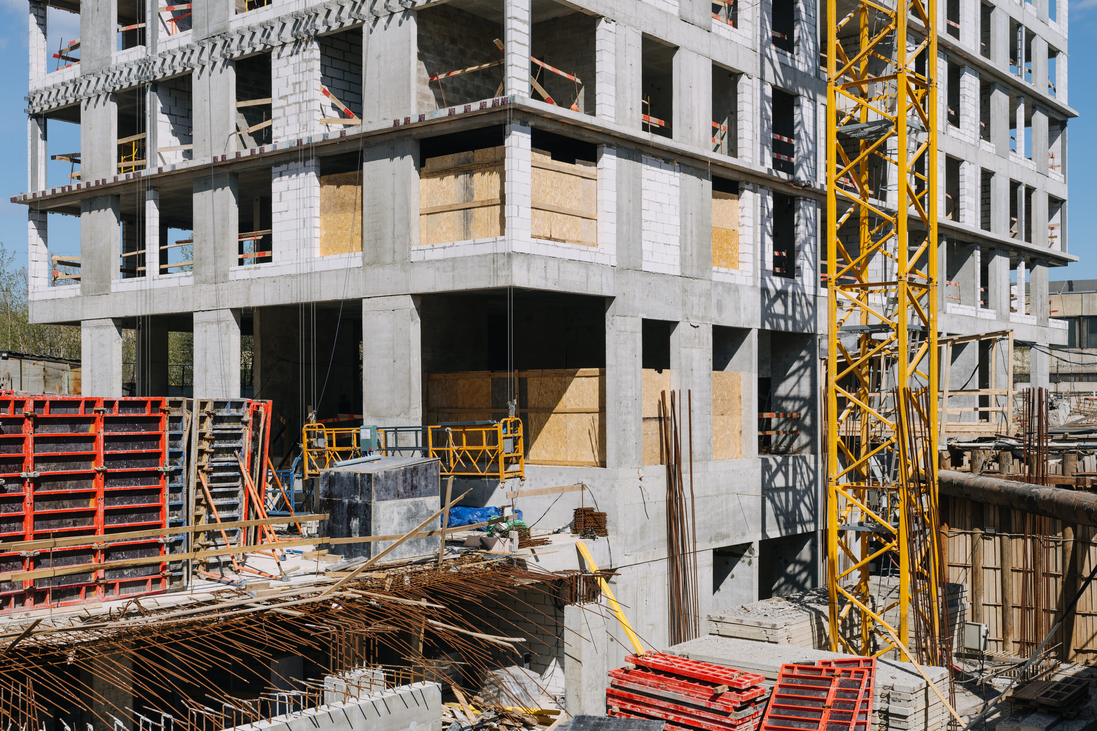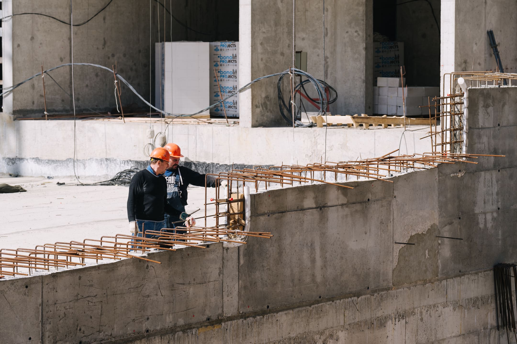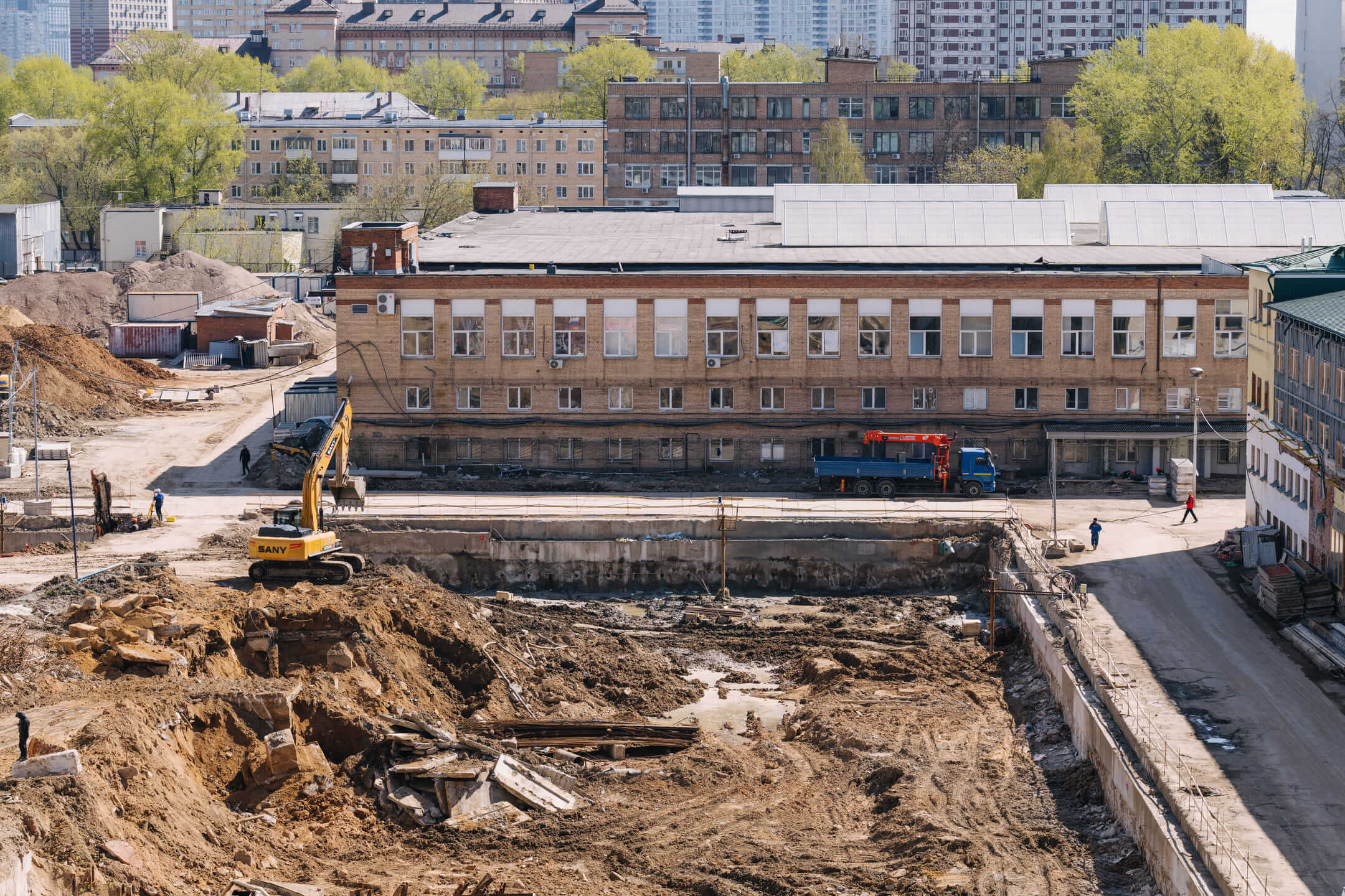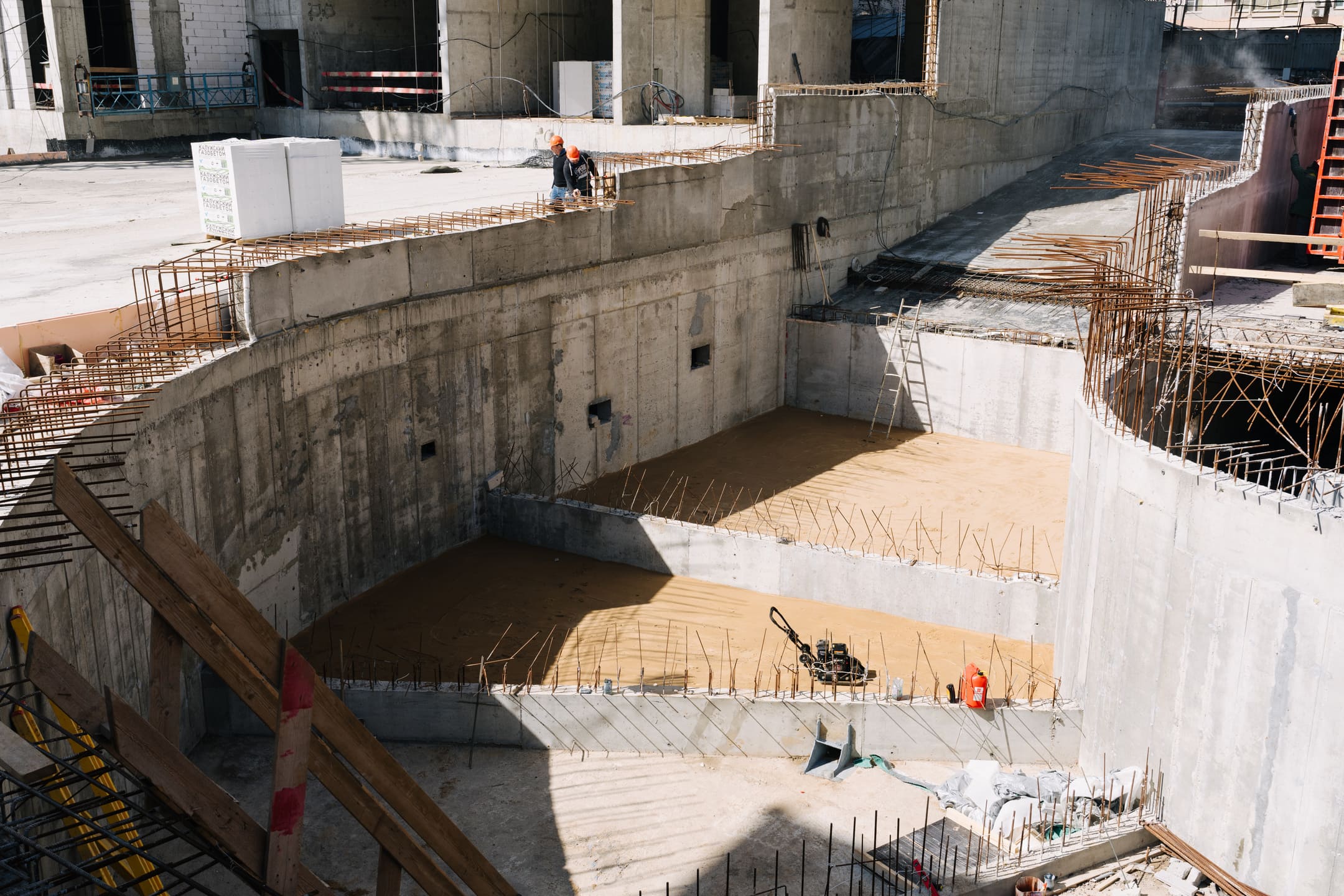 Этап 1.1 (паркинг): армирование/бетонирование стен и покрытия паркинга, рампы. Гидроизоляция наружных стен и кровли стилобата, устройство пристенного дренажа, прокладка наружных инженерных систем, отсыпка пазух котлована, кладка стен и перегородок подземного этажа.
