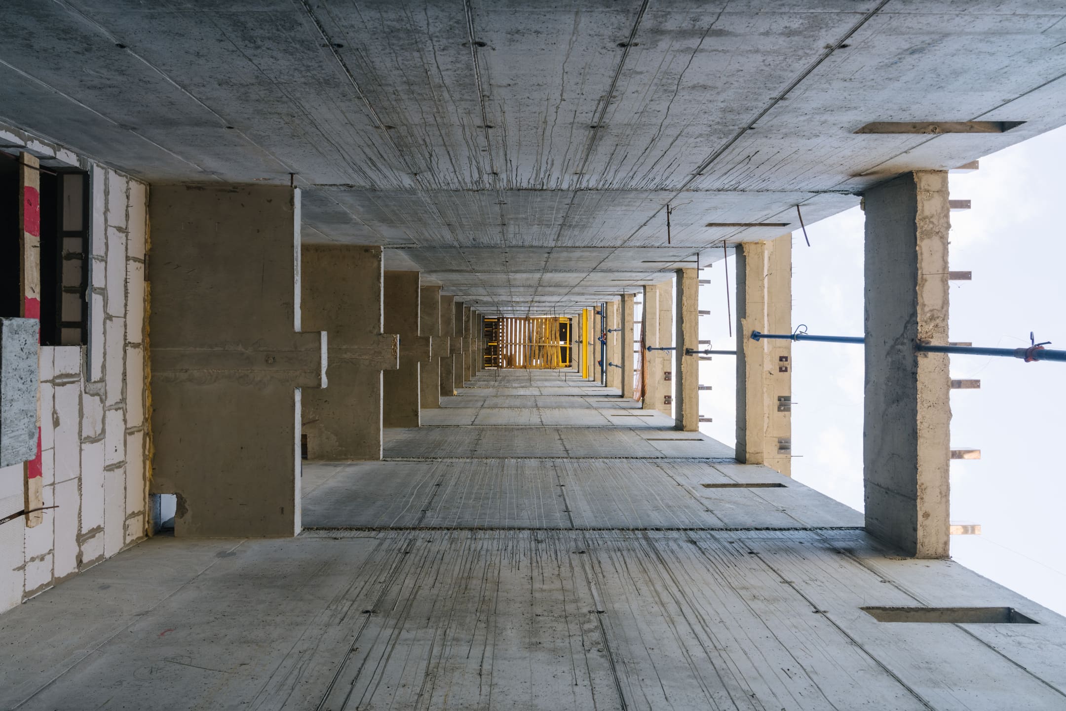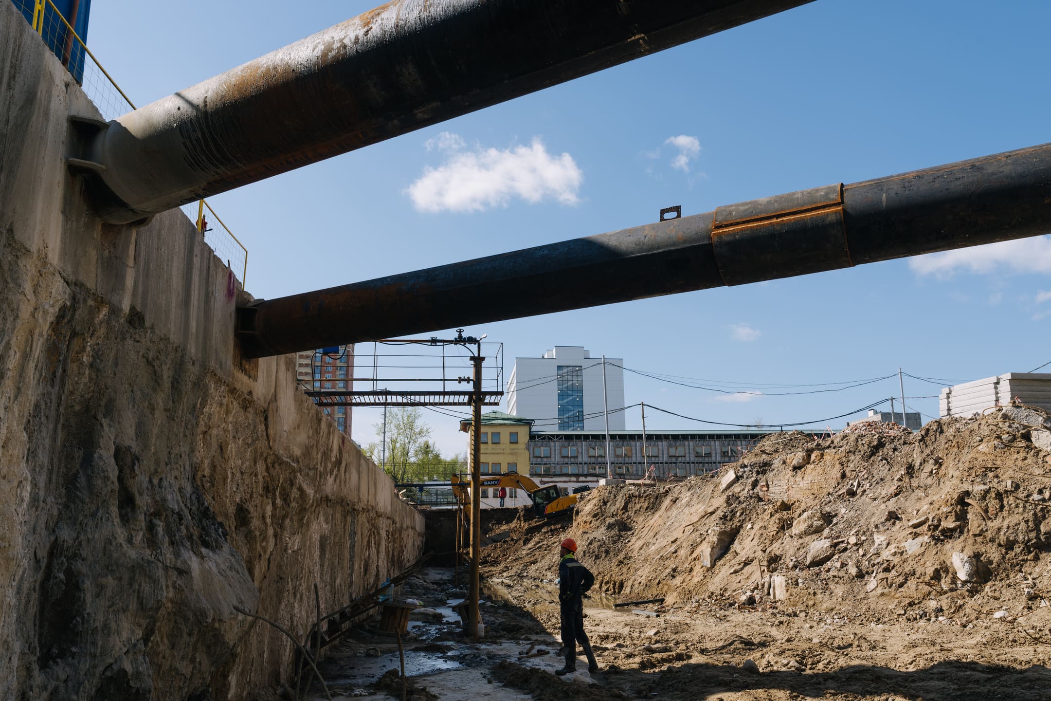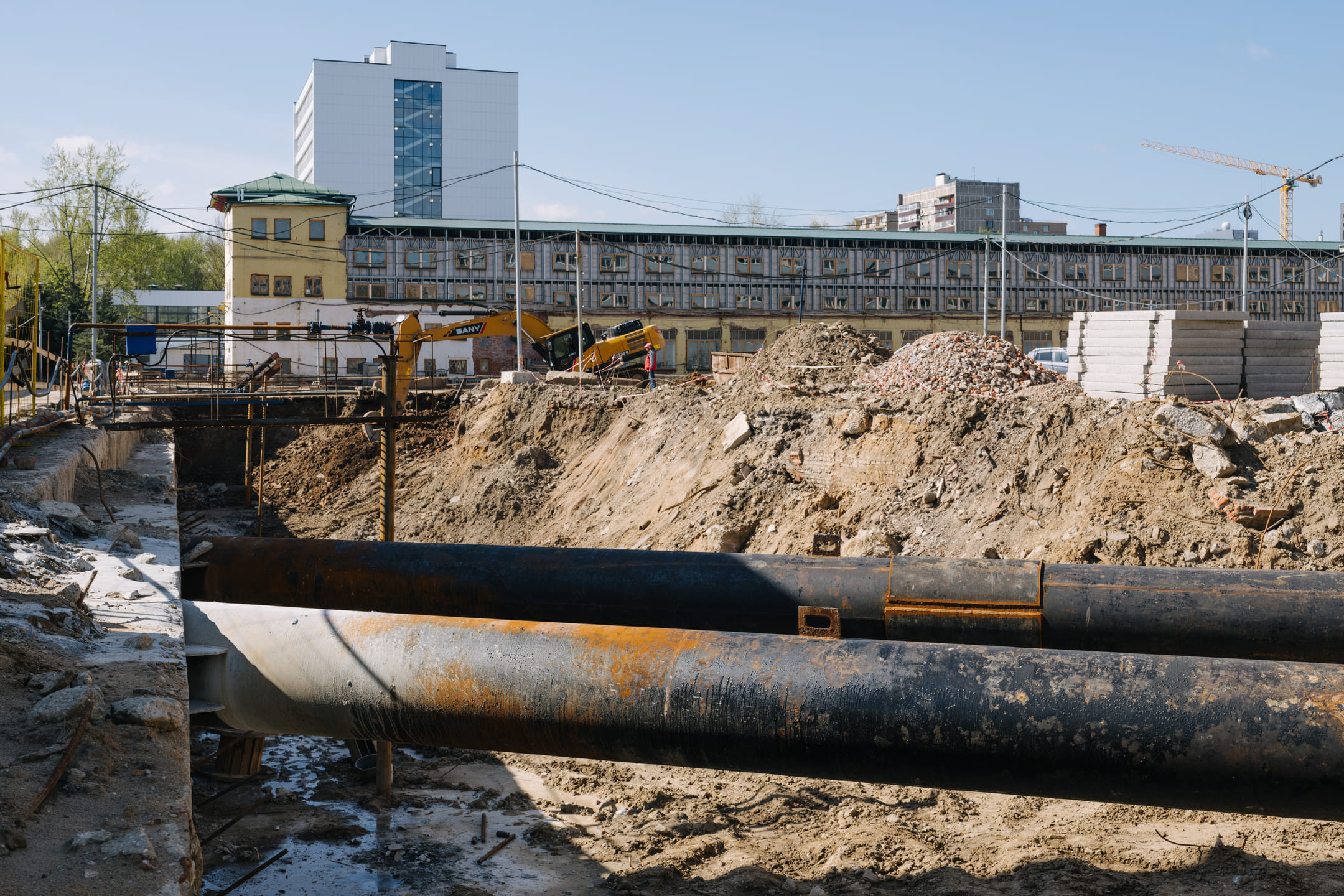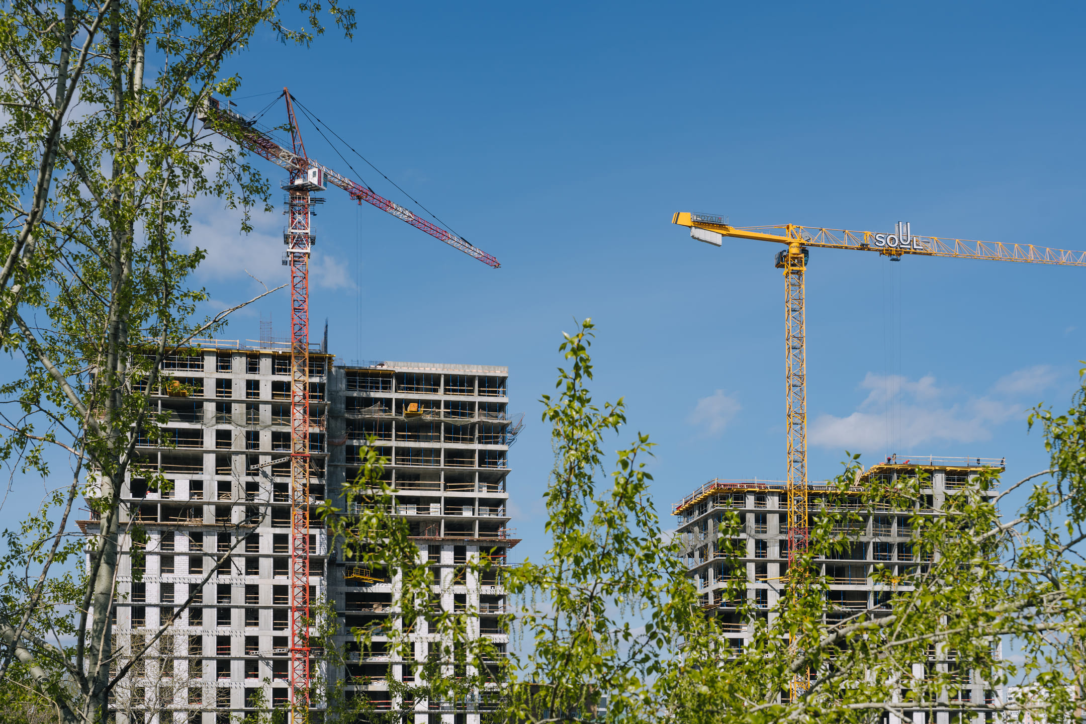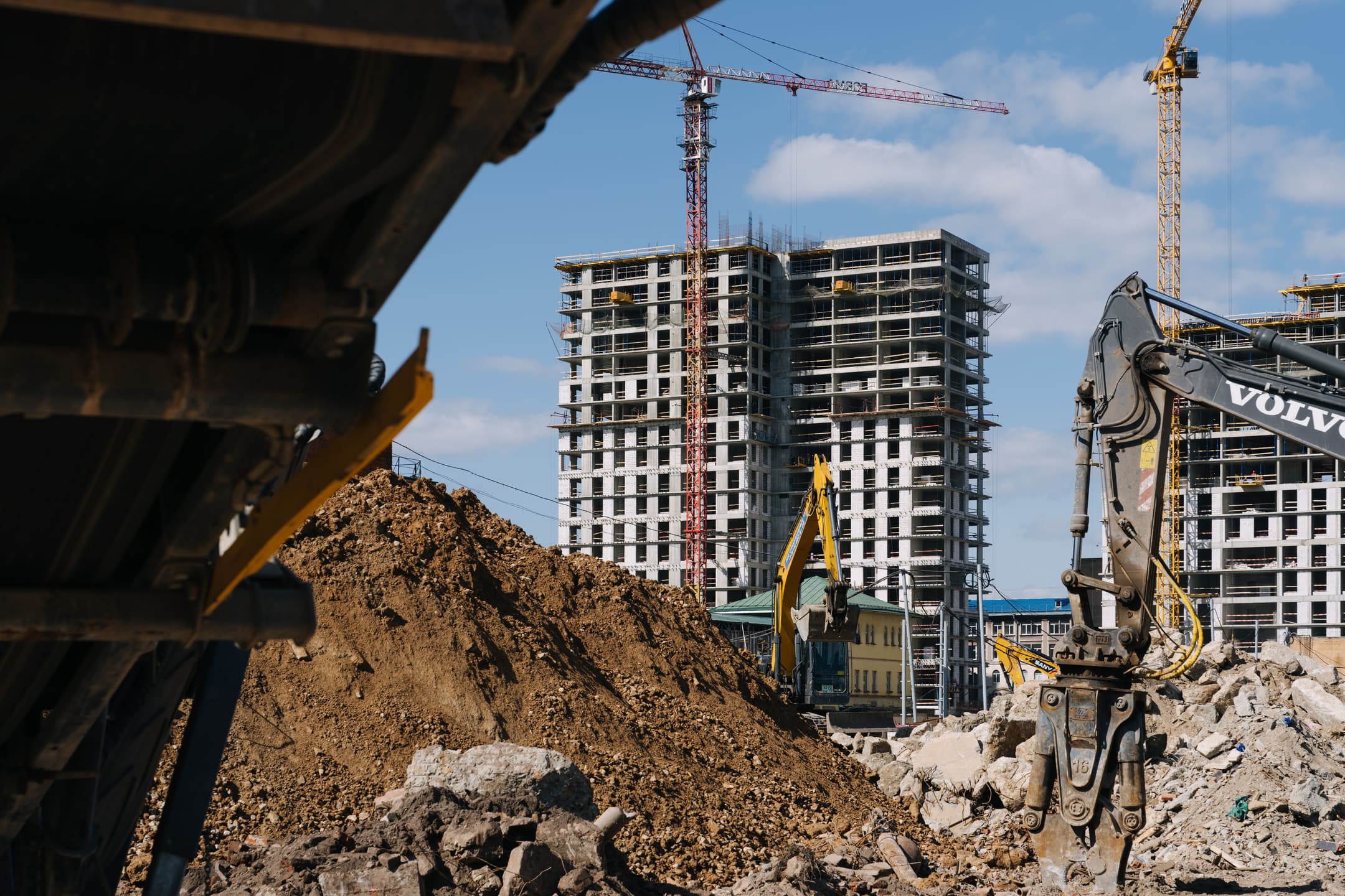 Этап 1.1 (паркинг): армирование/бетонирование стен и покрытия паркинга, рампы. Гидроизоляция наружных стен и кровли стилобата, устройство пристенного дренажа, прокладка наружных инженерных систем, отсыпка пазух котлована, кладка стен и перегородок подземного этажа.