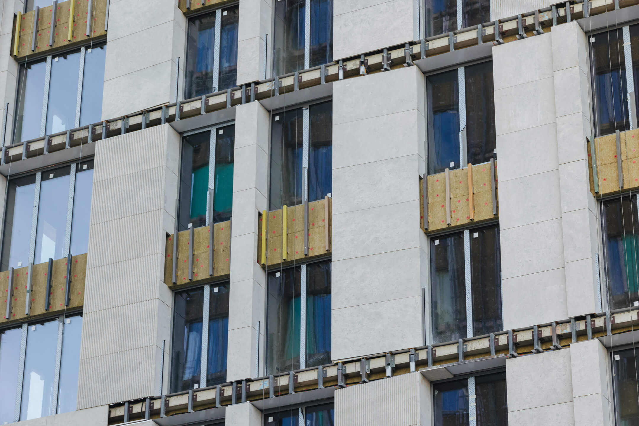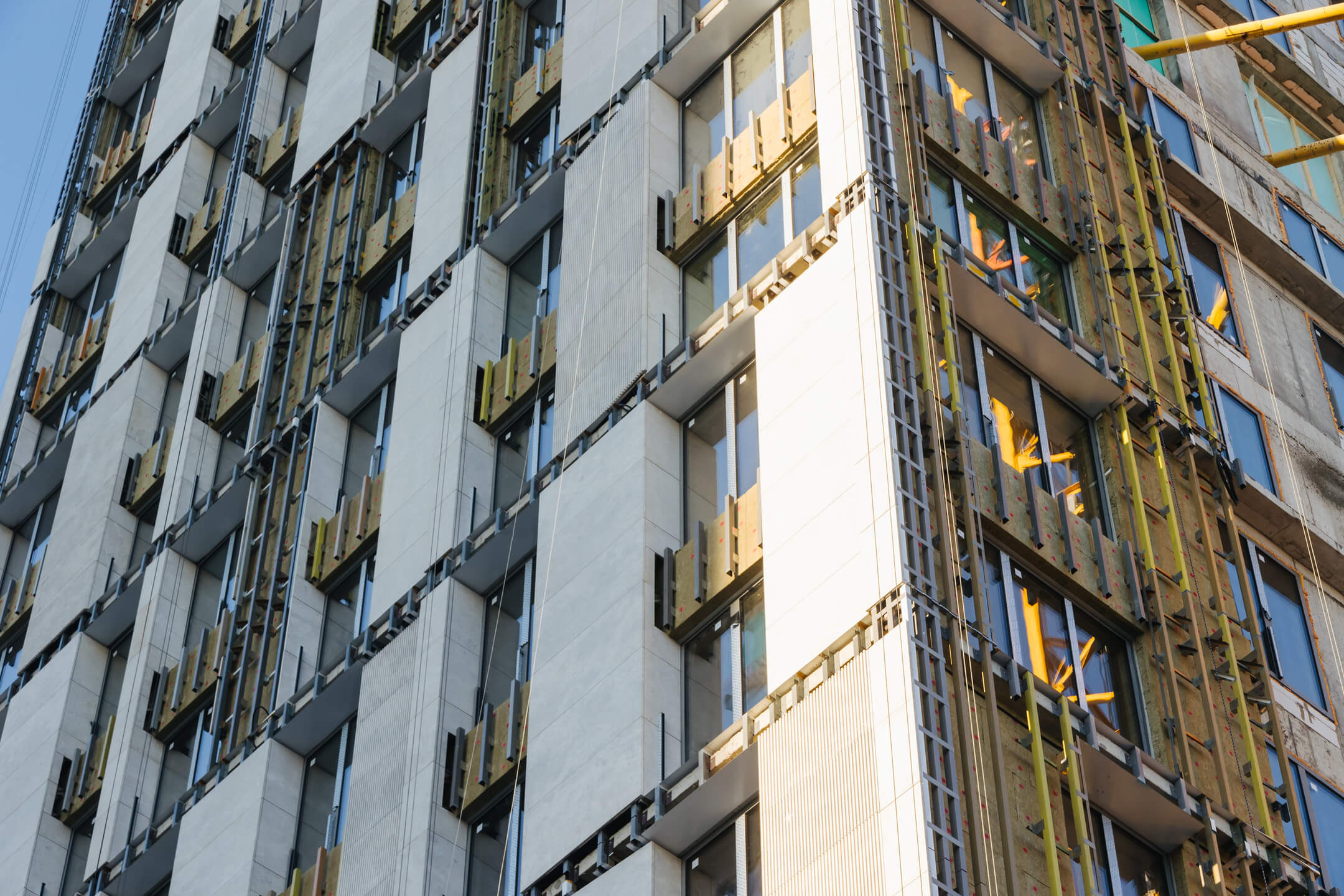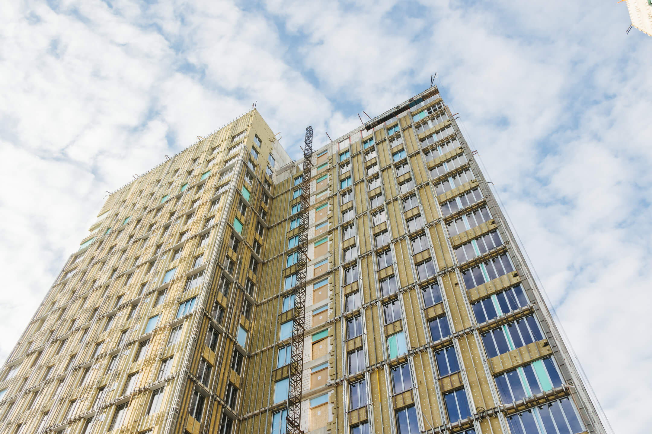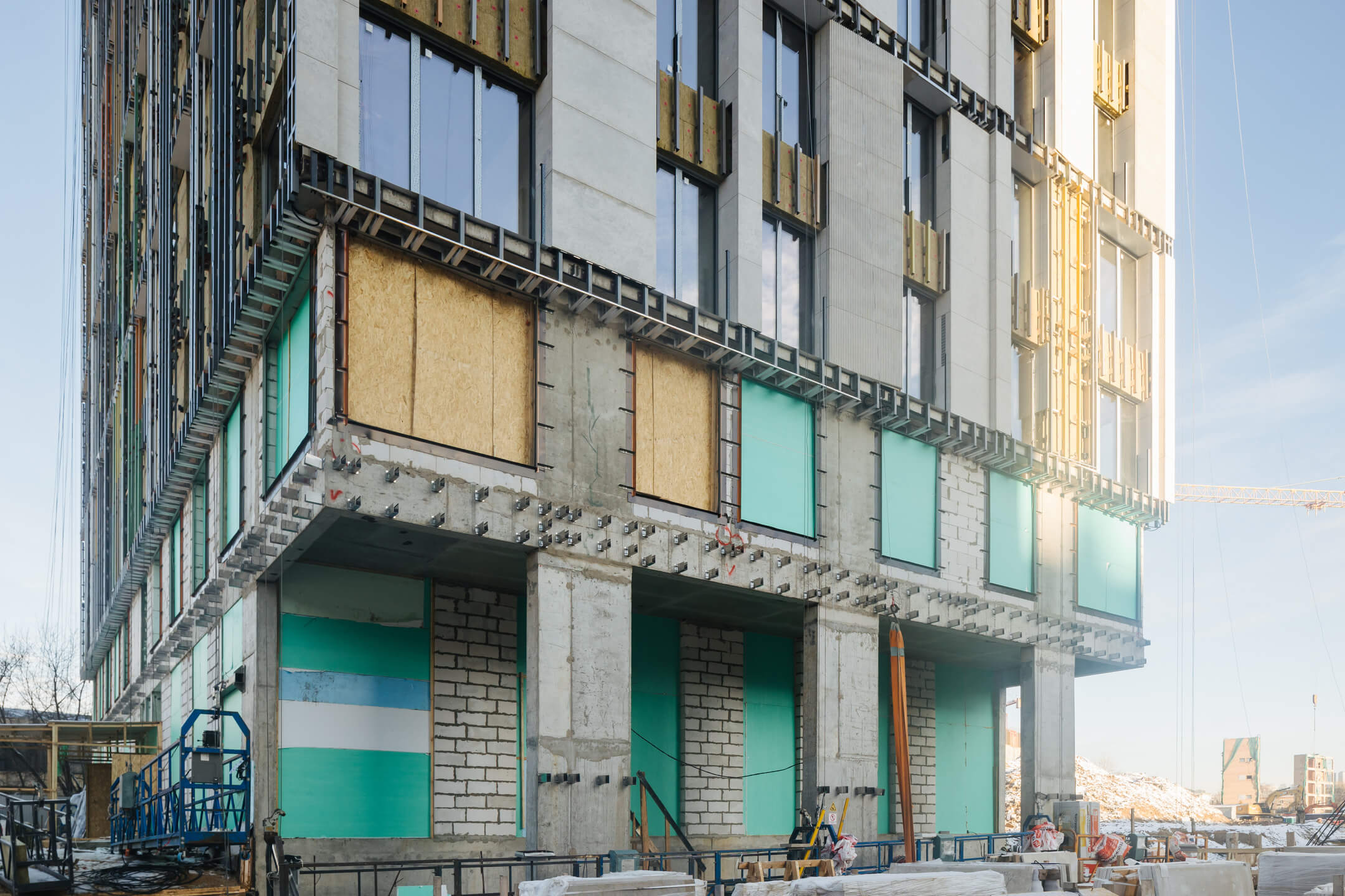 - Фасад. Монтаж минераловатного утеплителя. Монтаж подсистемы. Монтаж облицовки из натурального камня. Монтаж окон типовых этажей.