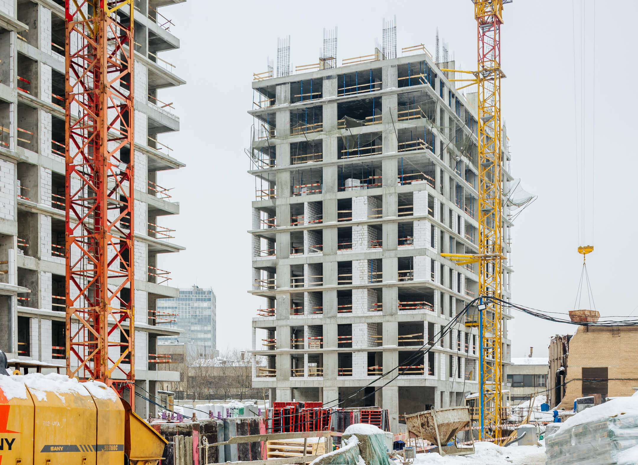 Этап 1.1 (корпус 2): работы по армированию/бетонированию плиты перекрытия и стен 12 этажа, кладочные работы на 2-7 этажах.