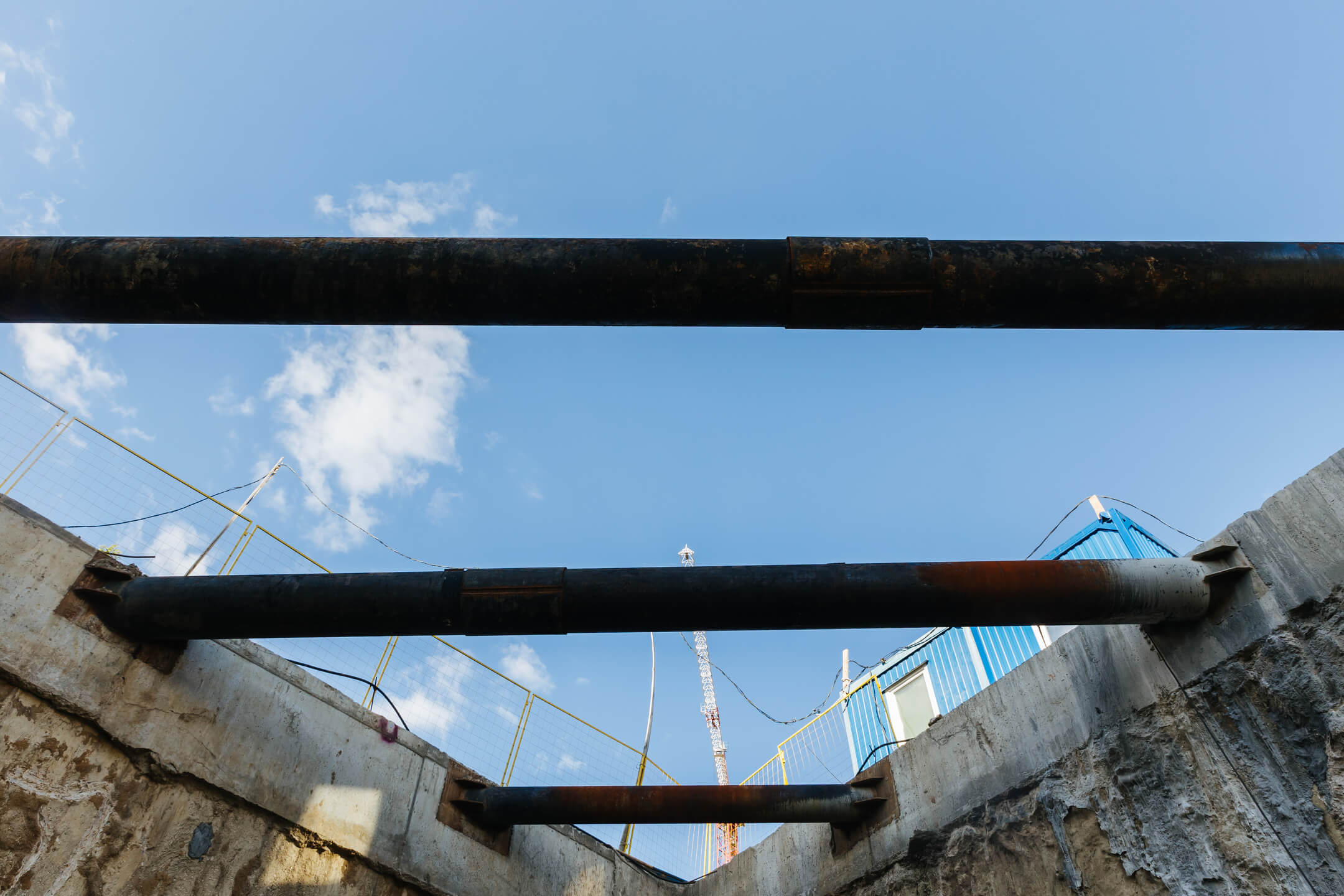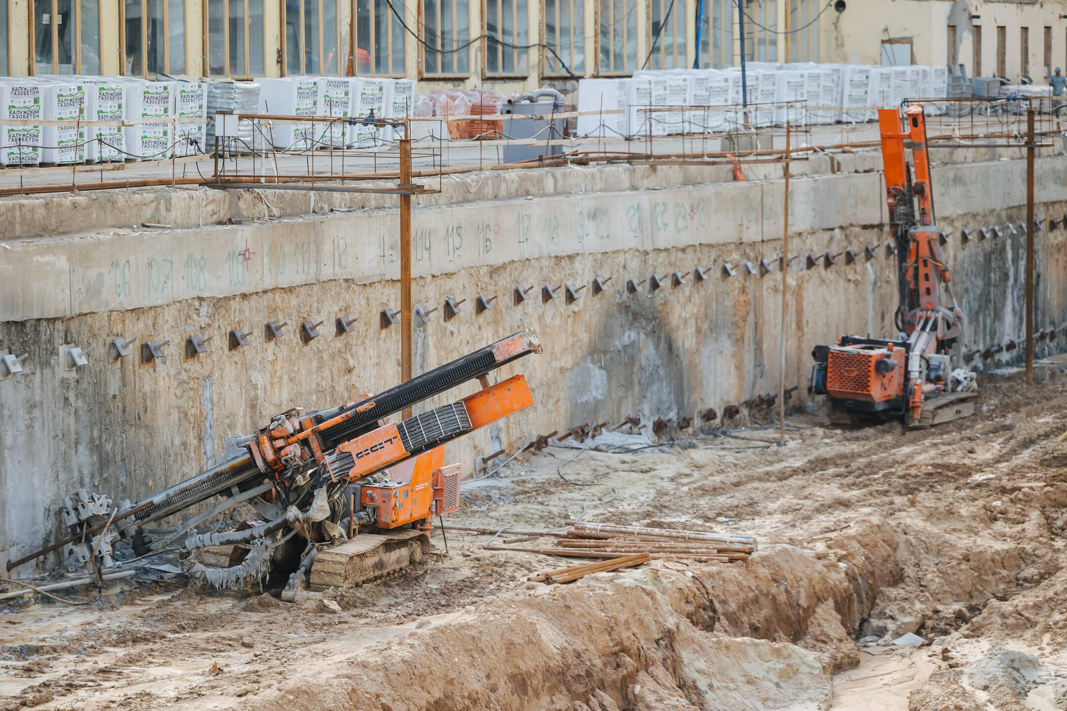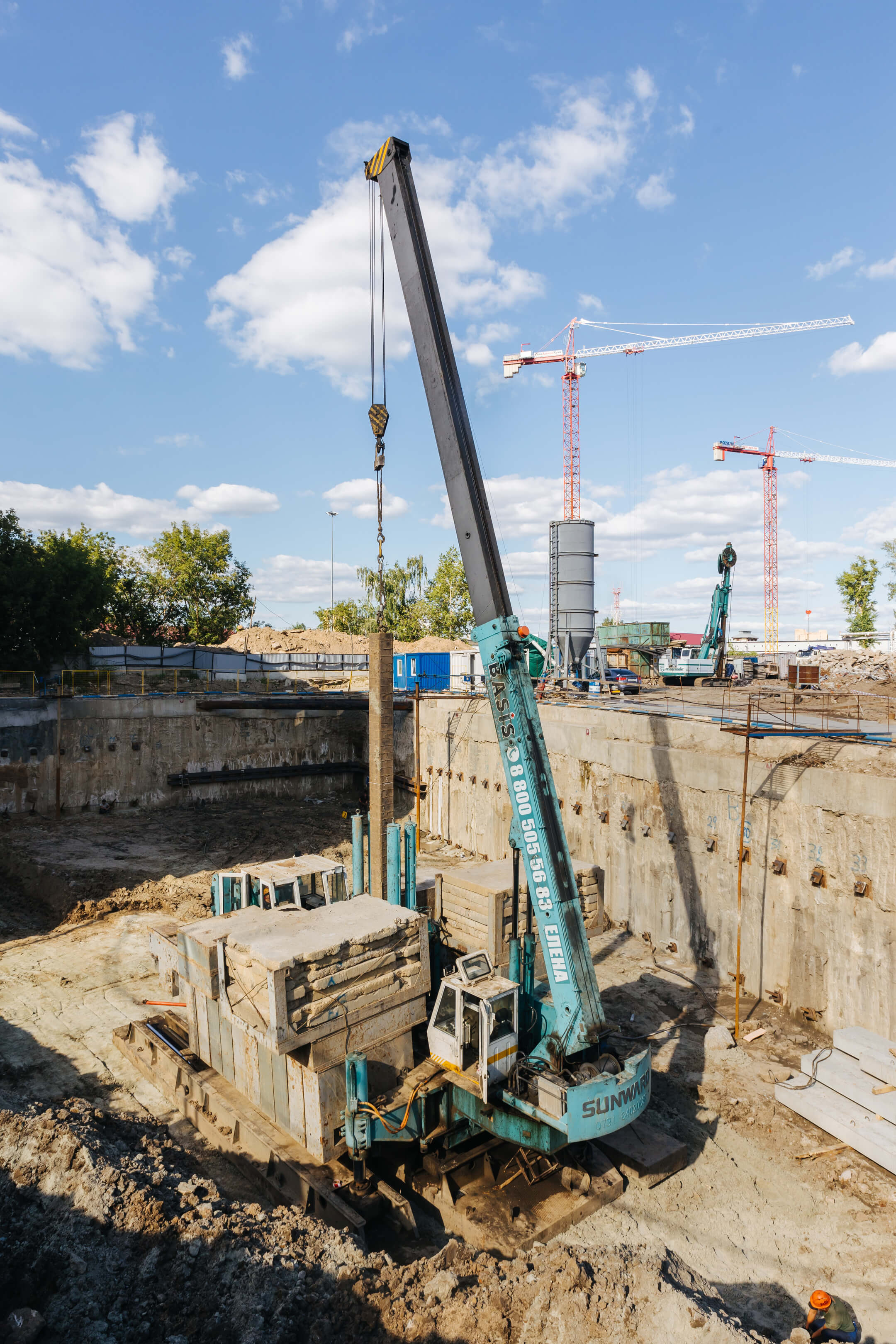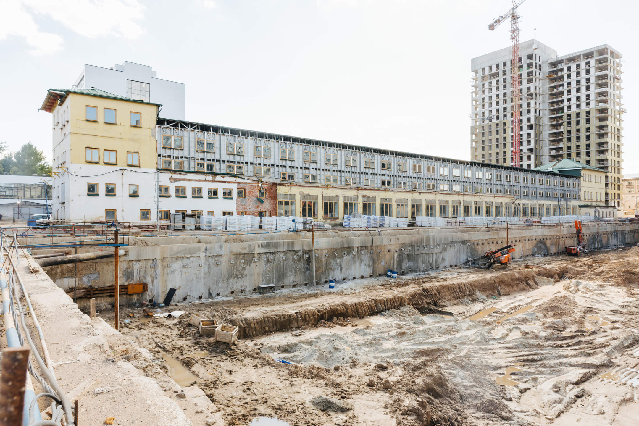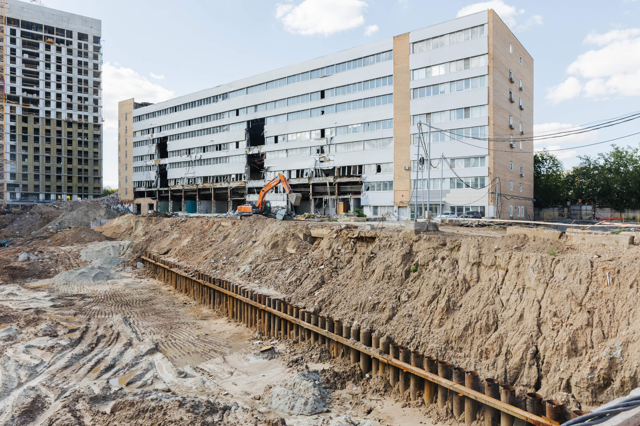 Этап 1.2: устройство шпунтового ограждения, распорной системы, грунтовых анкеров, водопонижения. Разработка котлована, снос зданий и сооружений.