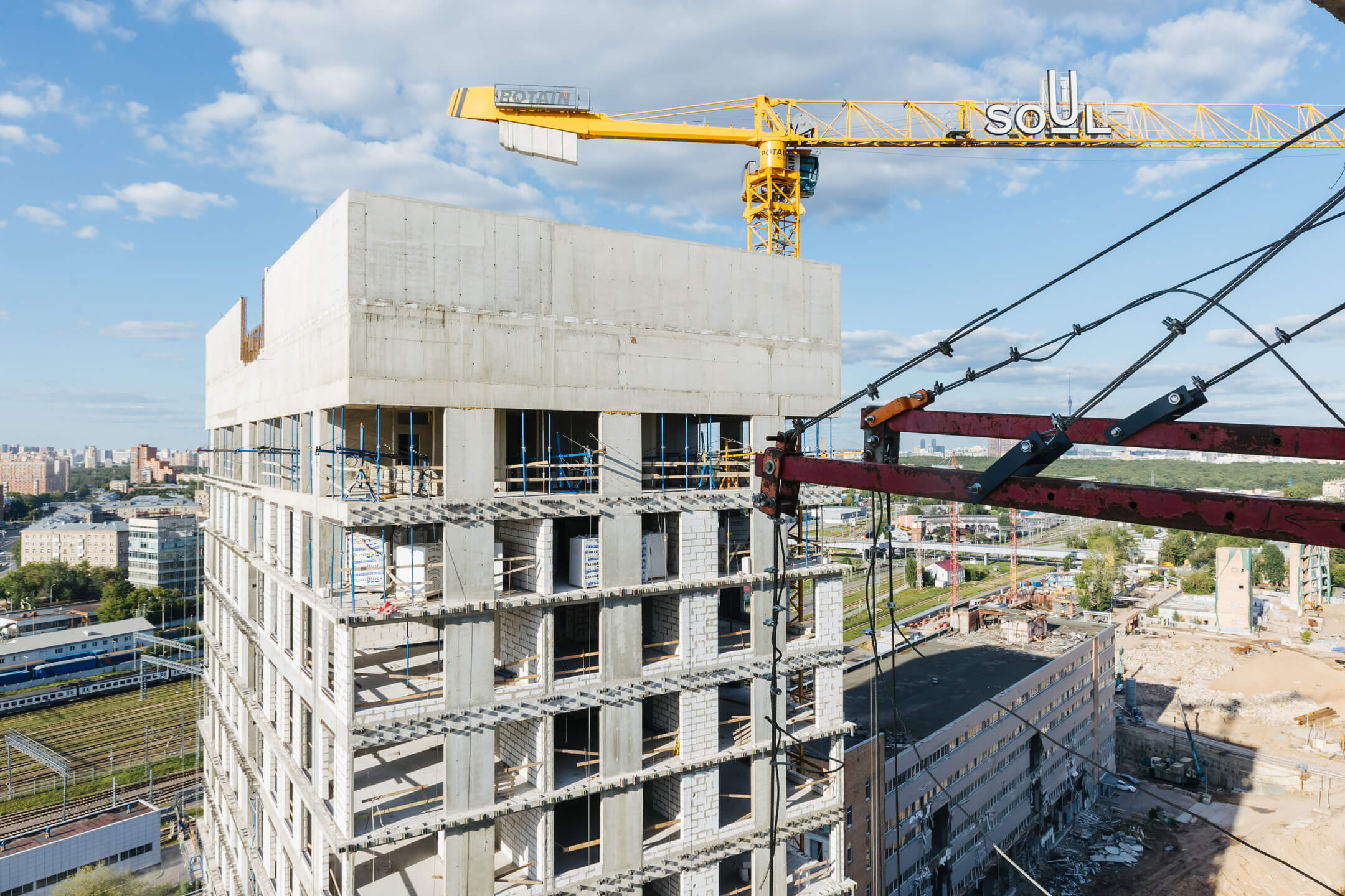 Этап 1.1 (корпус 1): Ведутся кровельные работы. Ведутся работы по бетонированию перекрытия лестничного марша. Продолжаются каменные работы на 10-20 этажах. В части внутренних инженерных систем ведется устройство отопления, вентиляции, ведутся электромонтажные работы. Фасад: монтаж противопожарной отсечки, минераловатного утеплителя, подсистемы.