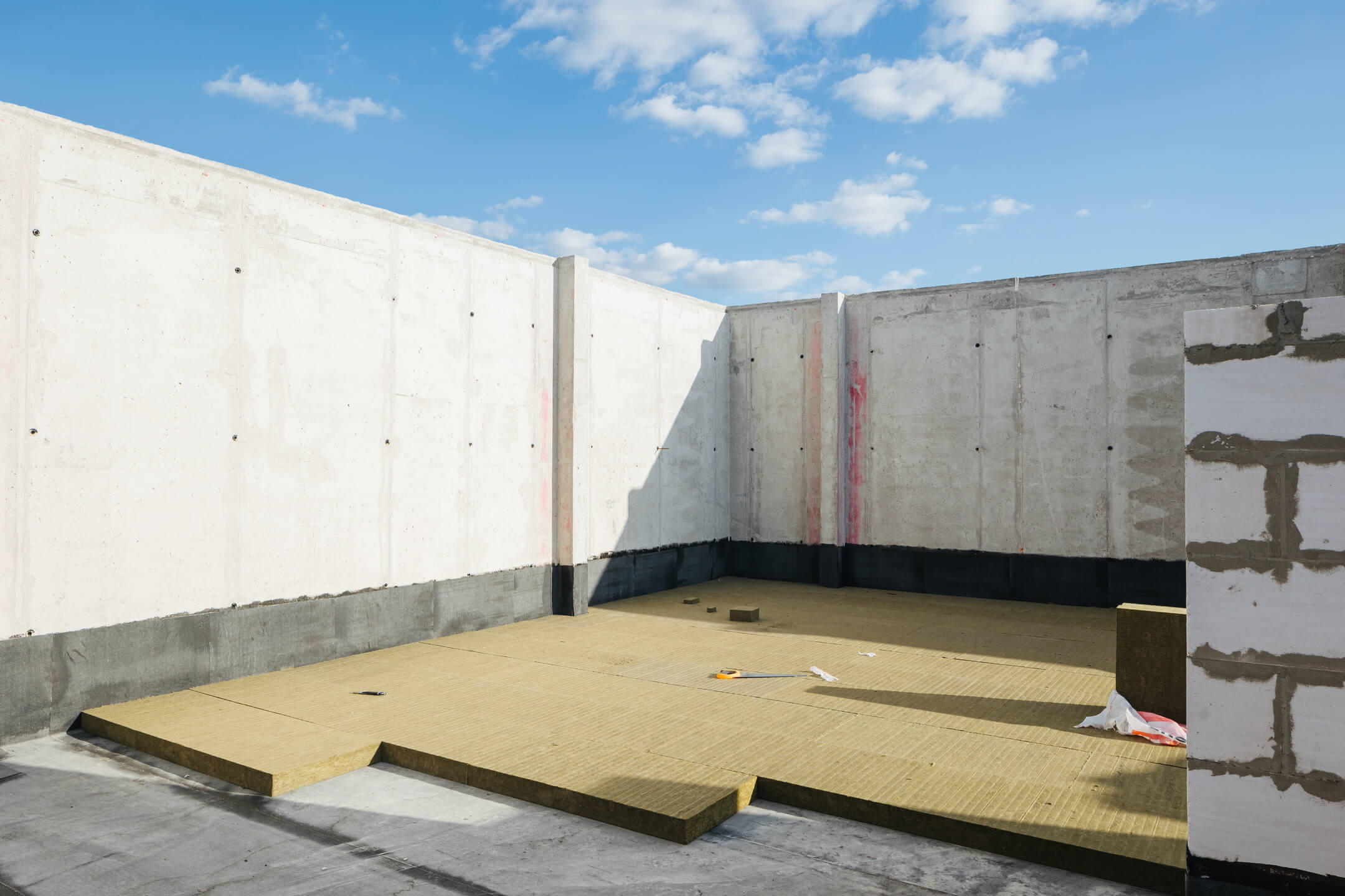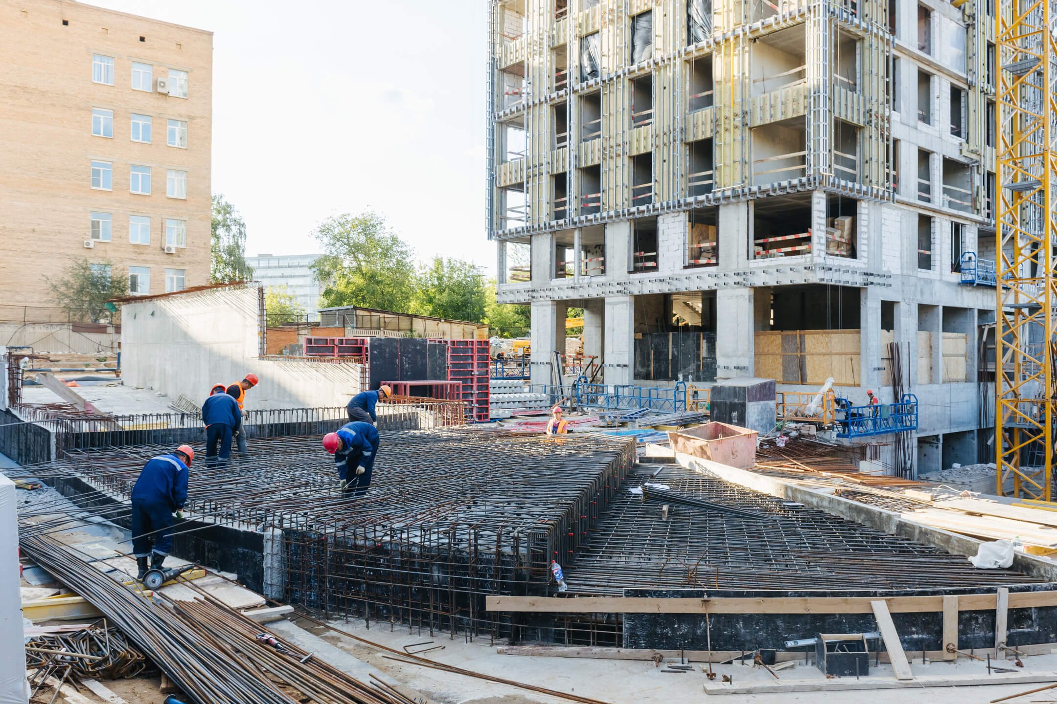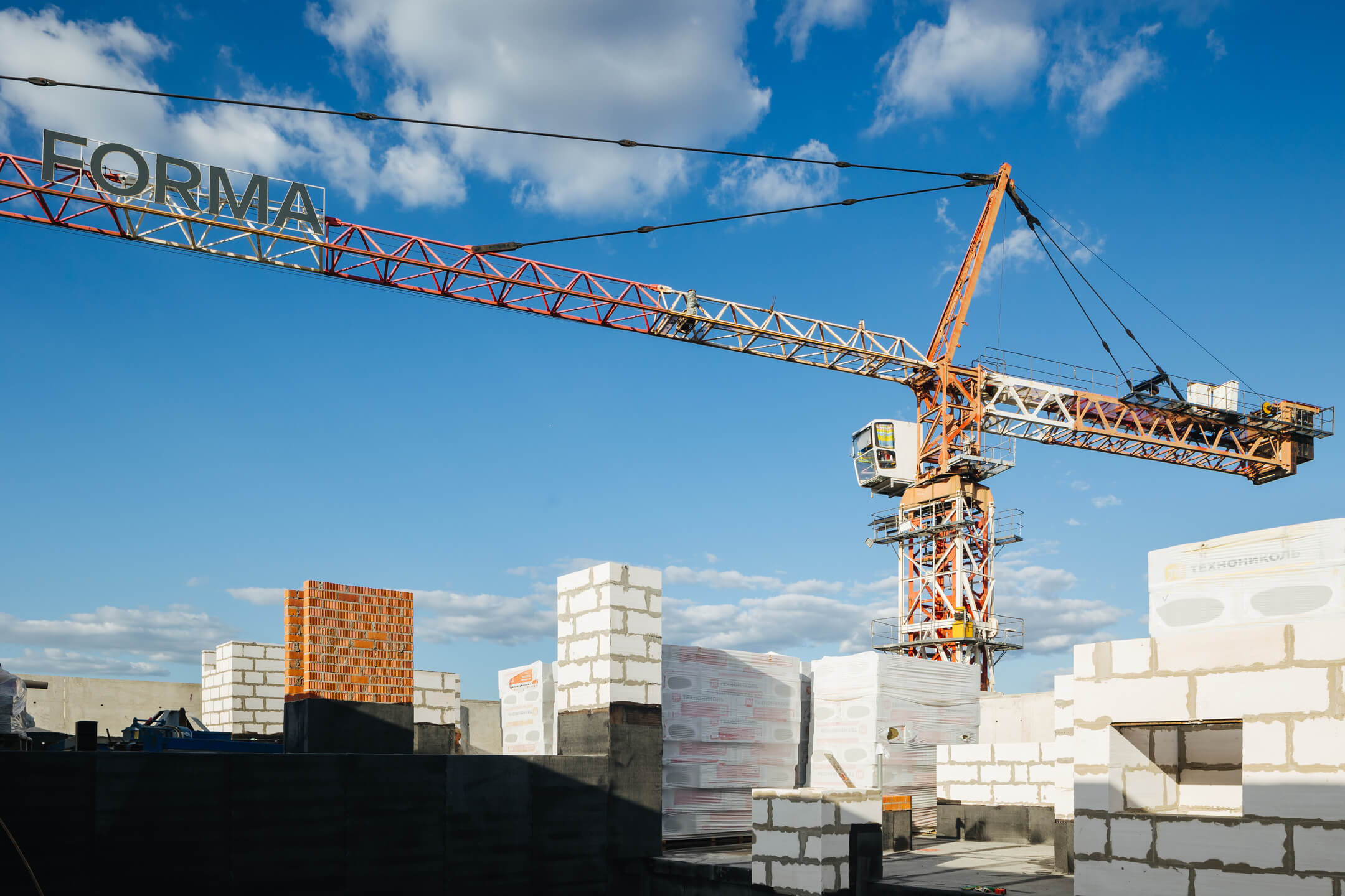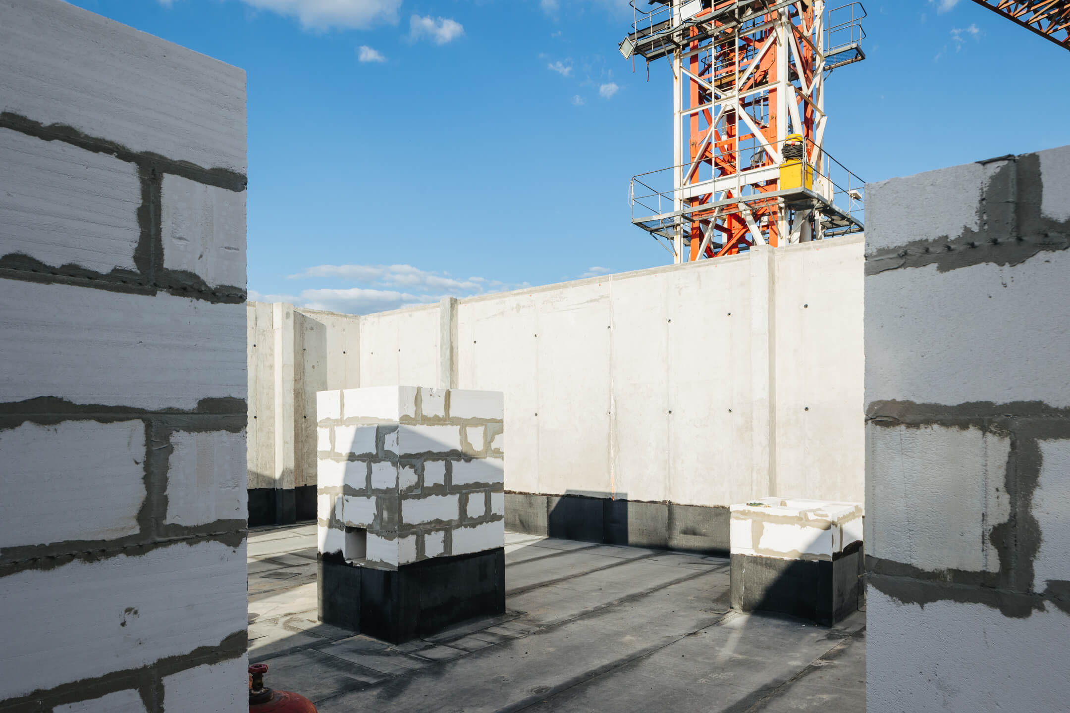 Этап 1.1 (паркинг): Армирование/бетонирование стен и покрытия паркинга и рампы. Гидроизоляция наружных стен и кровли стилобата. Устройство пристенного дренажа, прокладка наружных инженерных систем. Отсыпка пазух котлована, кладка стен и перегородок подземного этажа. Отделка технических помещений. Отделка кладовых. Продолжаются работы по устройству отопления, вентиляции, противопожарного водопровода в рамках внутренних инженерных систем.
